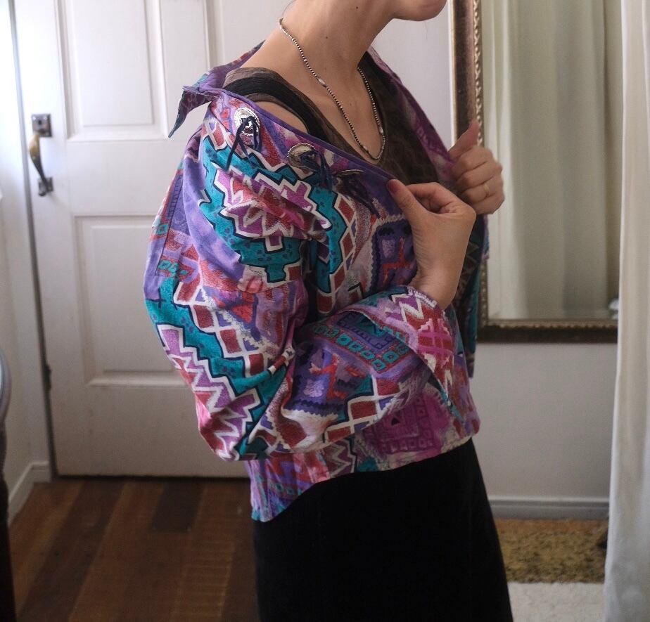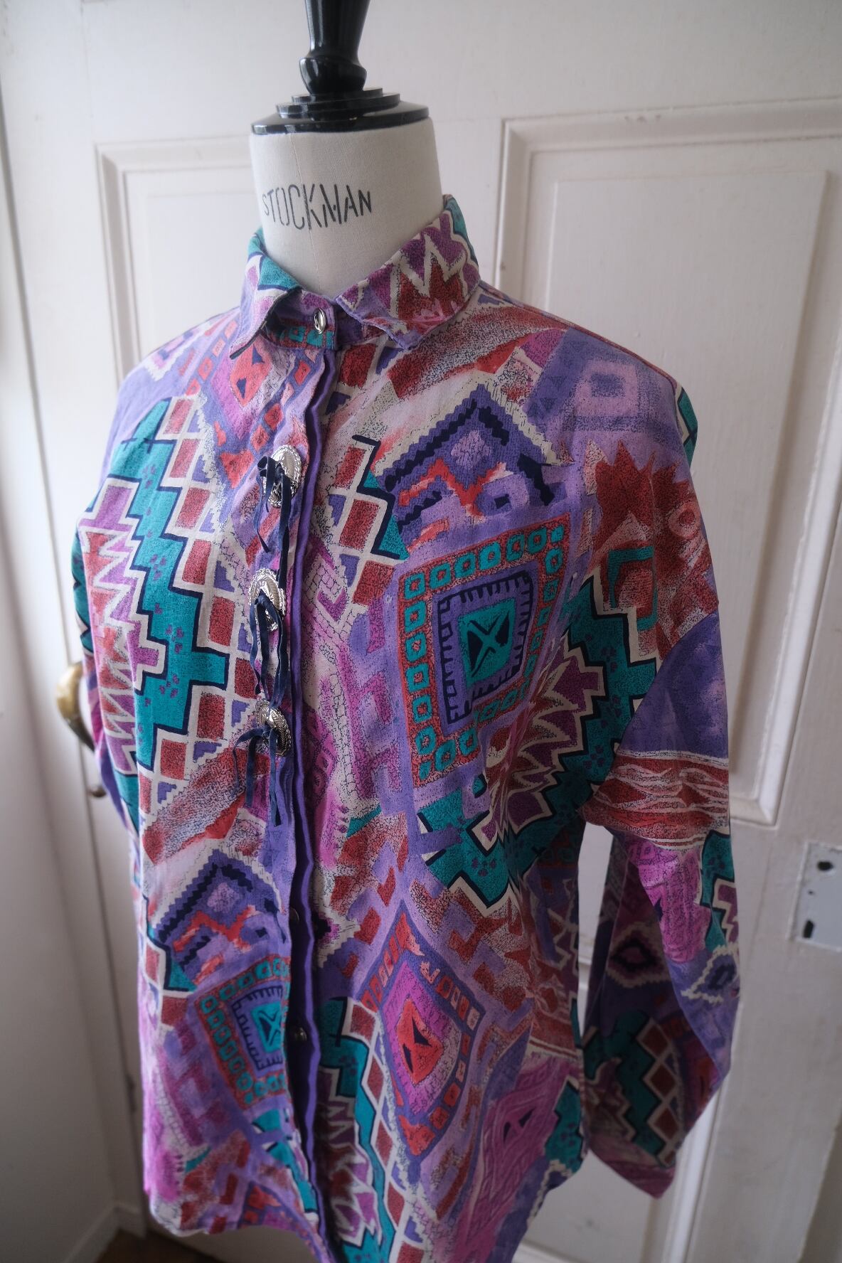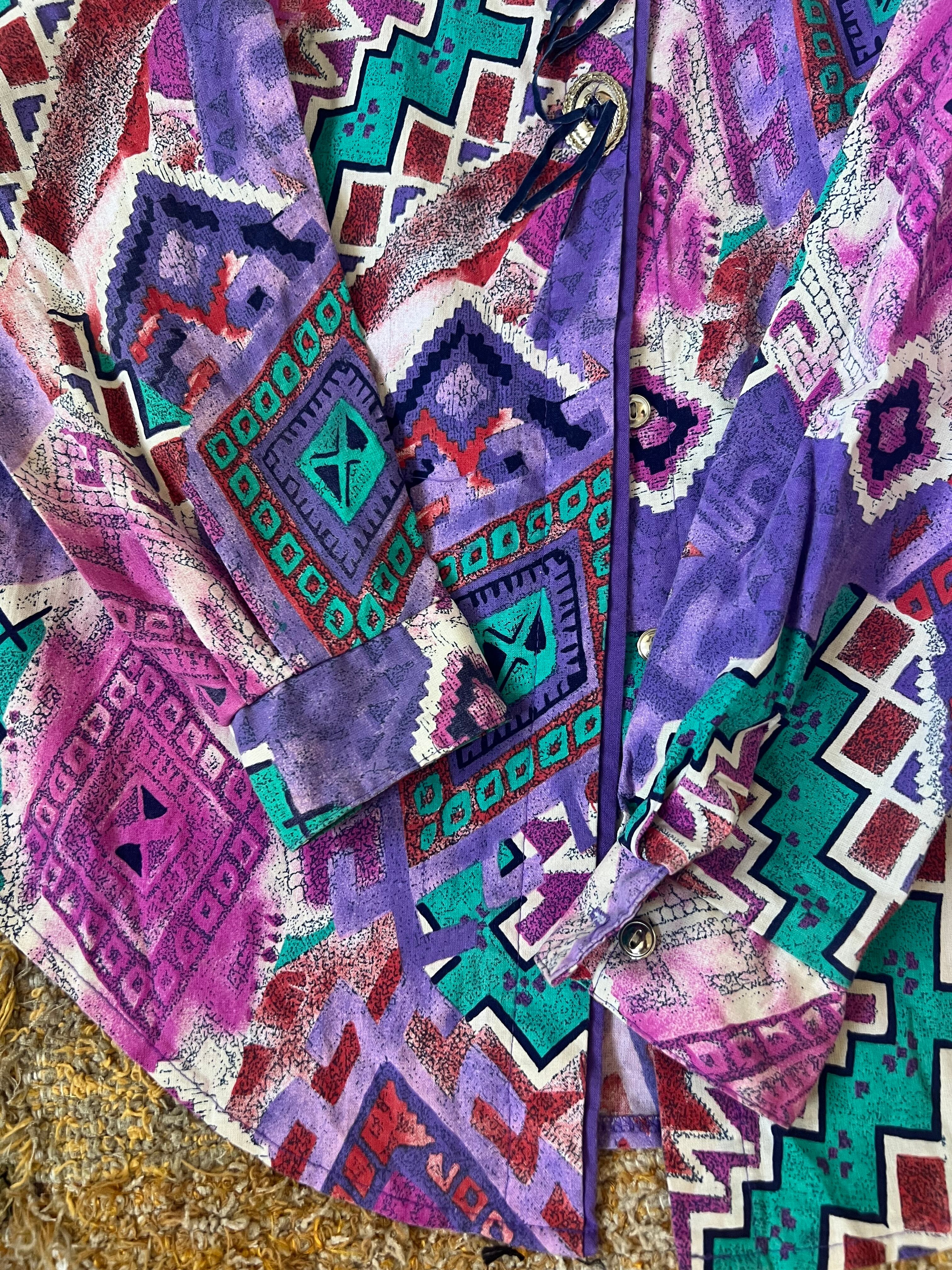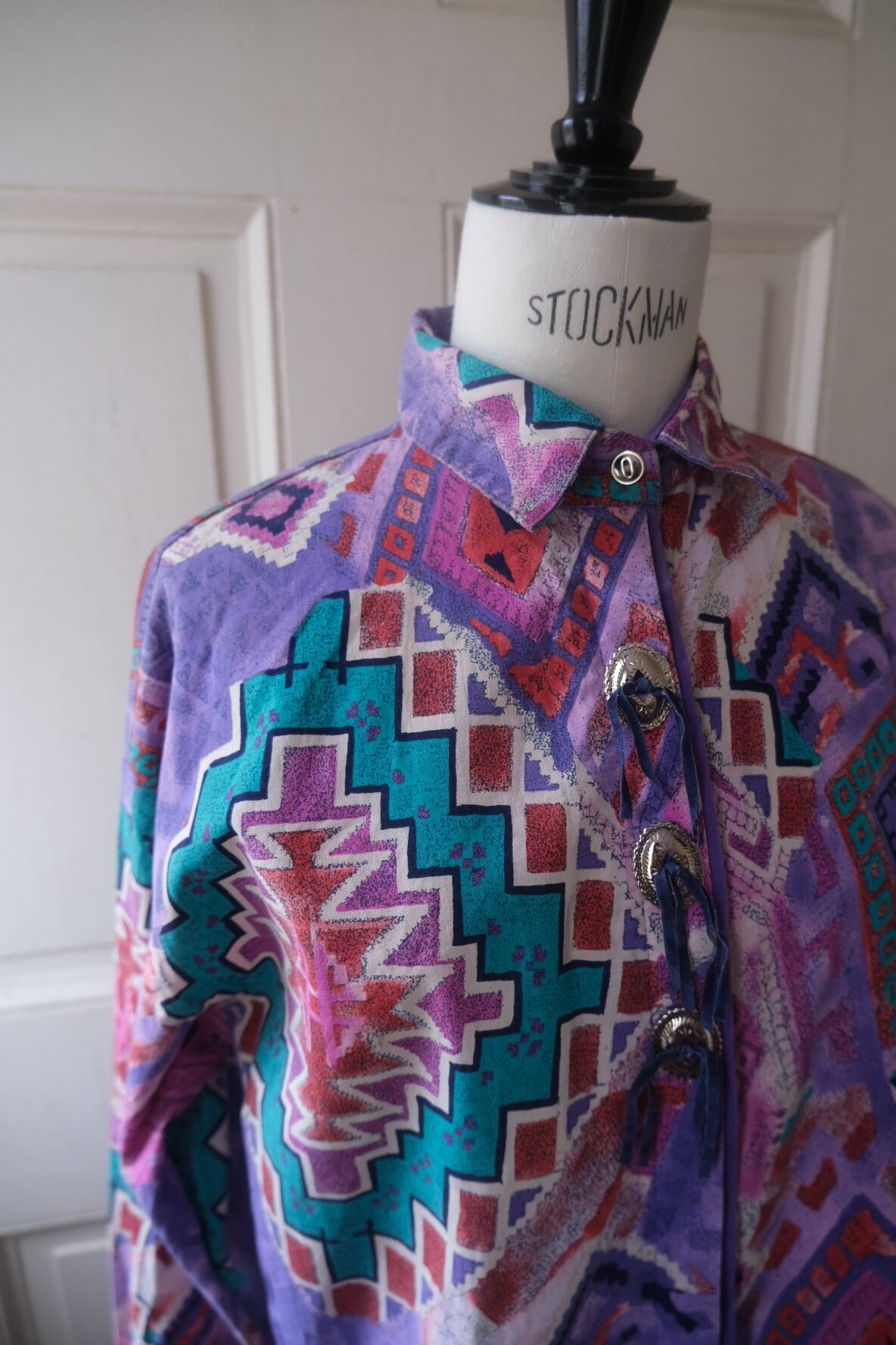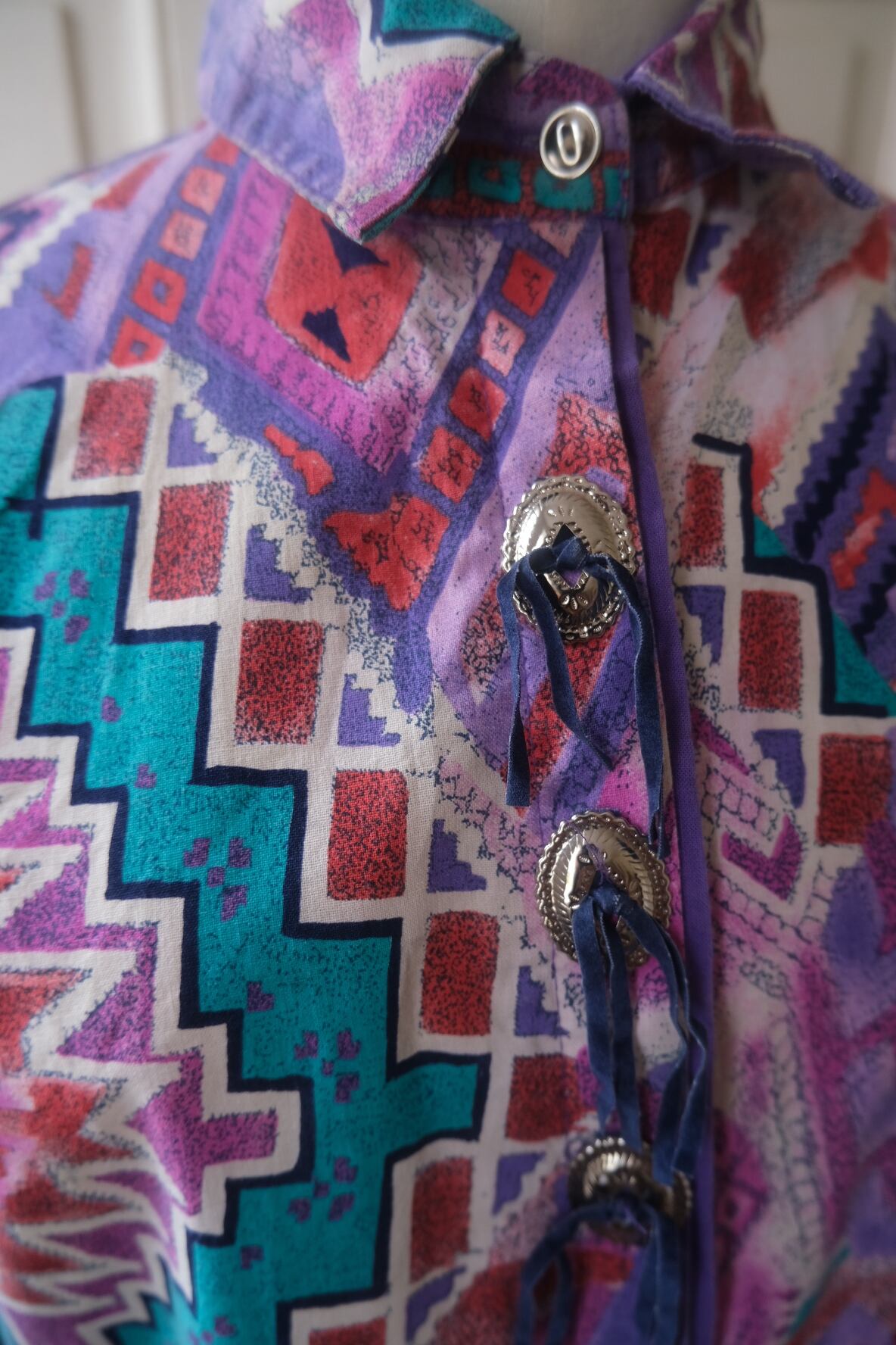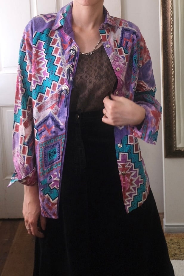 80'sらしいテキスタイルにコンチョボタンとスゥエードの飾りが付いたシャツ。