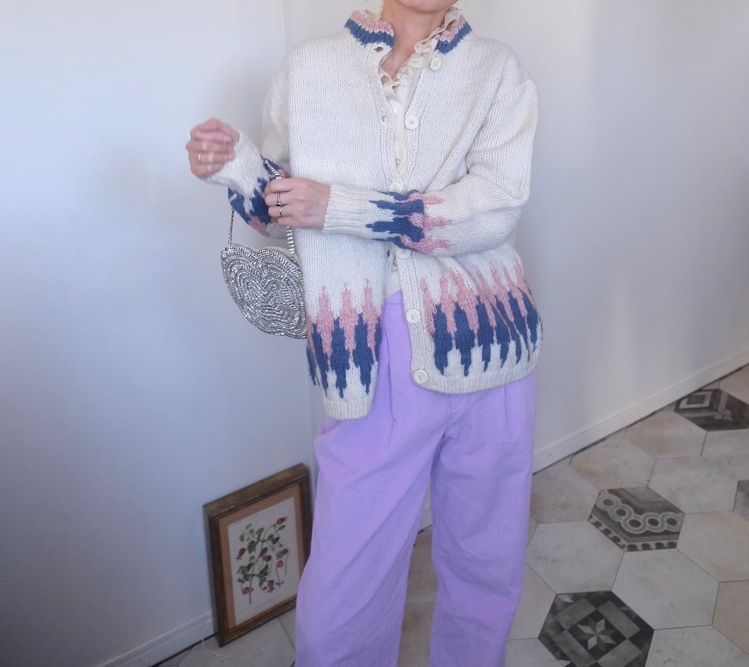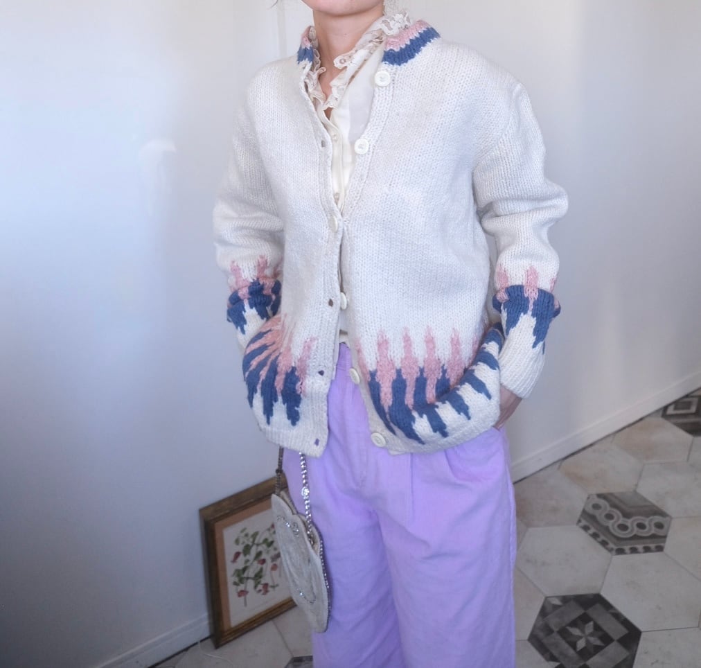 ホワイトにピンクとブルーのギザギザっとしたラインが入ったハンドニットカーディガン。