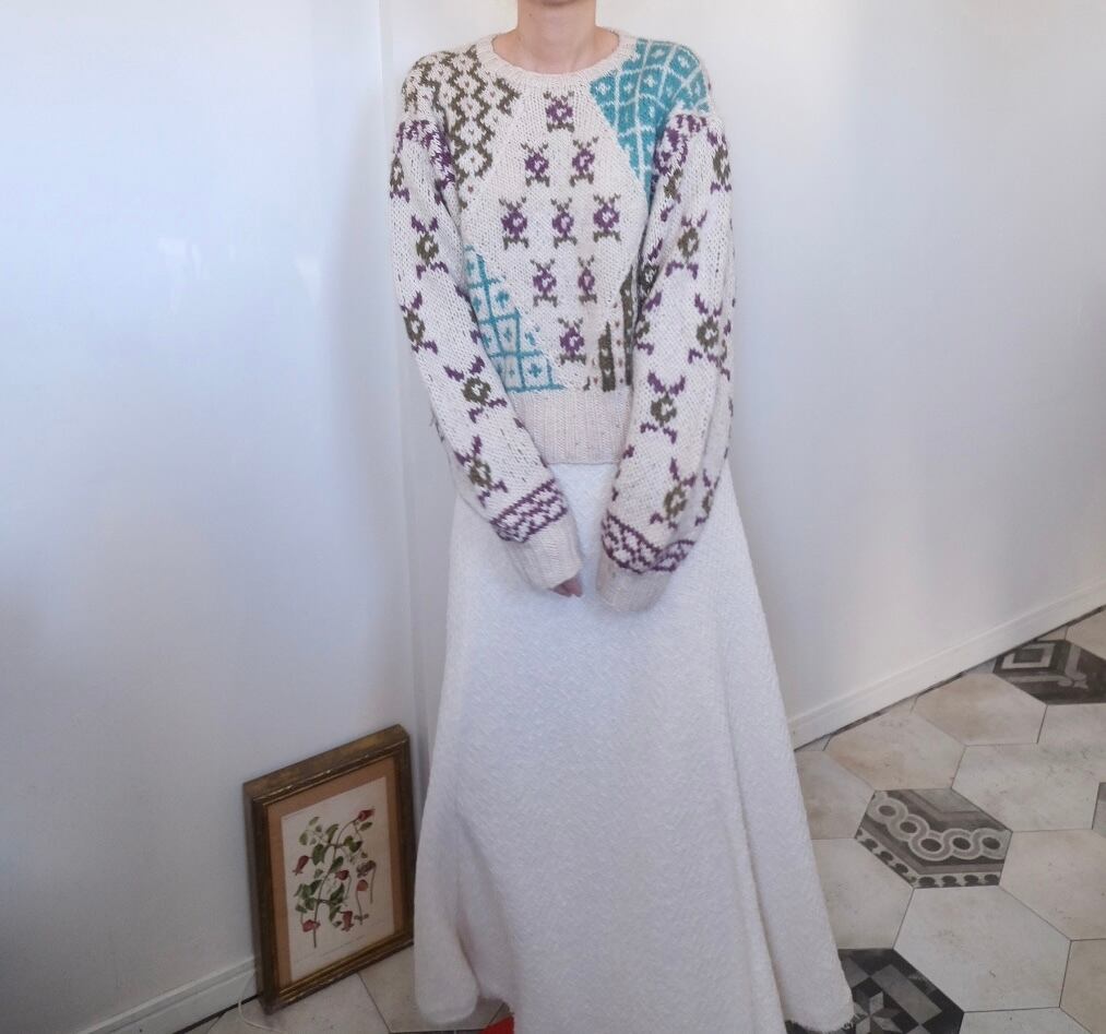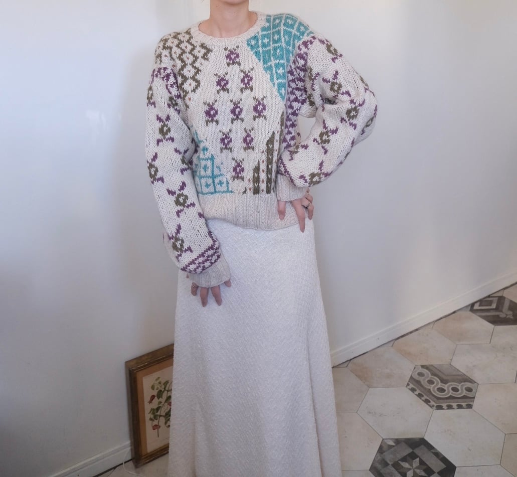 様々なパターンが組み合わさった楽しいデザインニット。