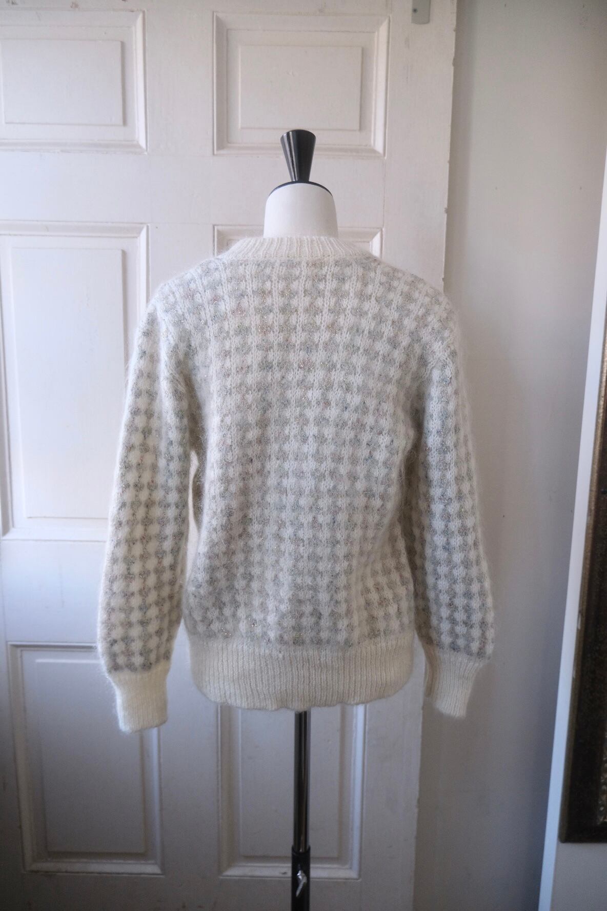 柔らかなふわっとしたモヘア混のホワイトベースにラメ糸で千鳥格子になったニットカーディガン。