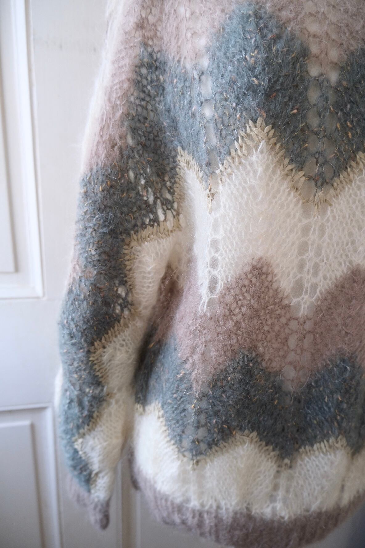 柔らかで落ち着いた雰囲気のカラーでざっくりと編まれたmohair knit。