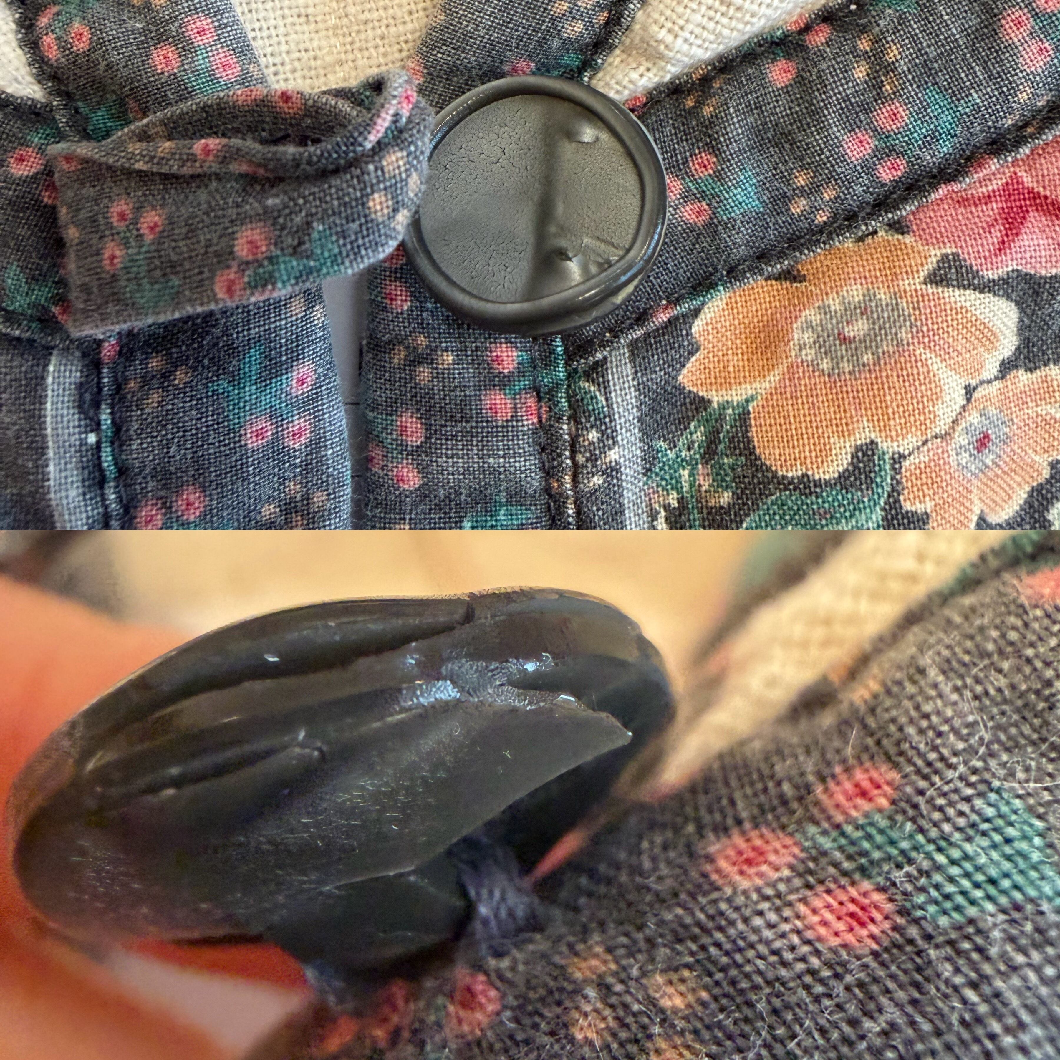 特筆するダメージとしてフロント左側に薄いグレーの汚れがございます。また第一ボタンが少し変形しています。(留める事はできます)