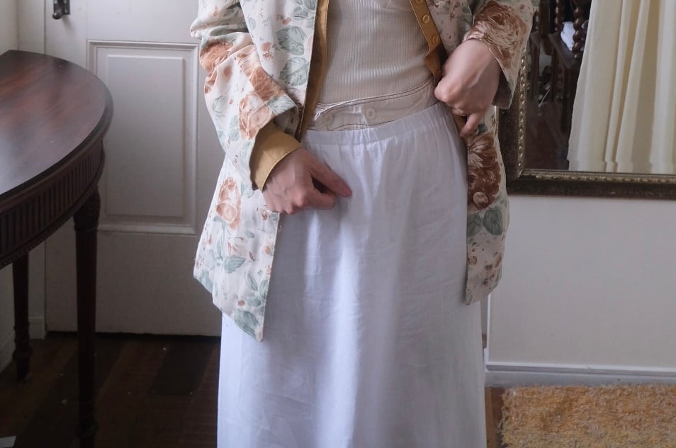 ウエストは穴があいたゴムが付いており、ボタンで調節する仕組みです。