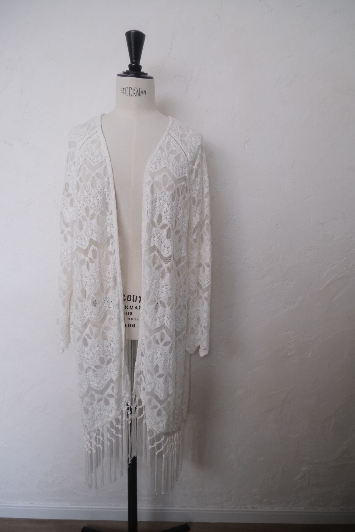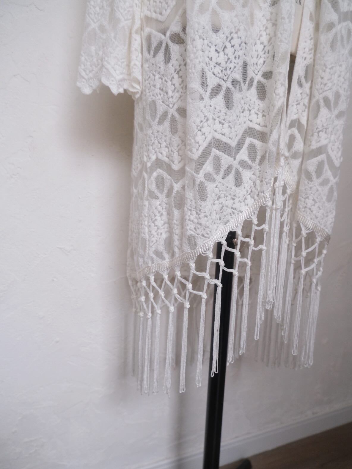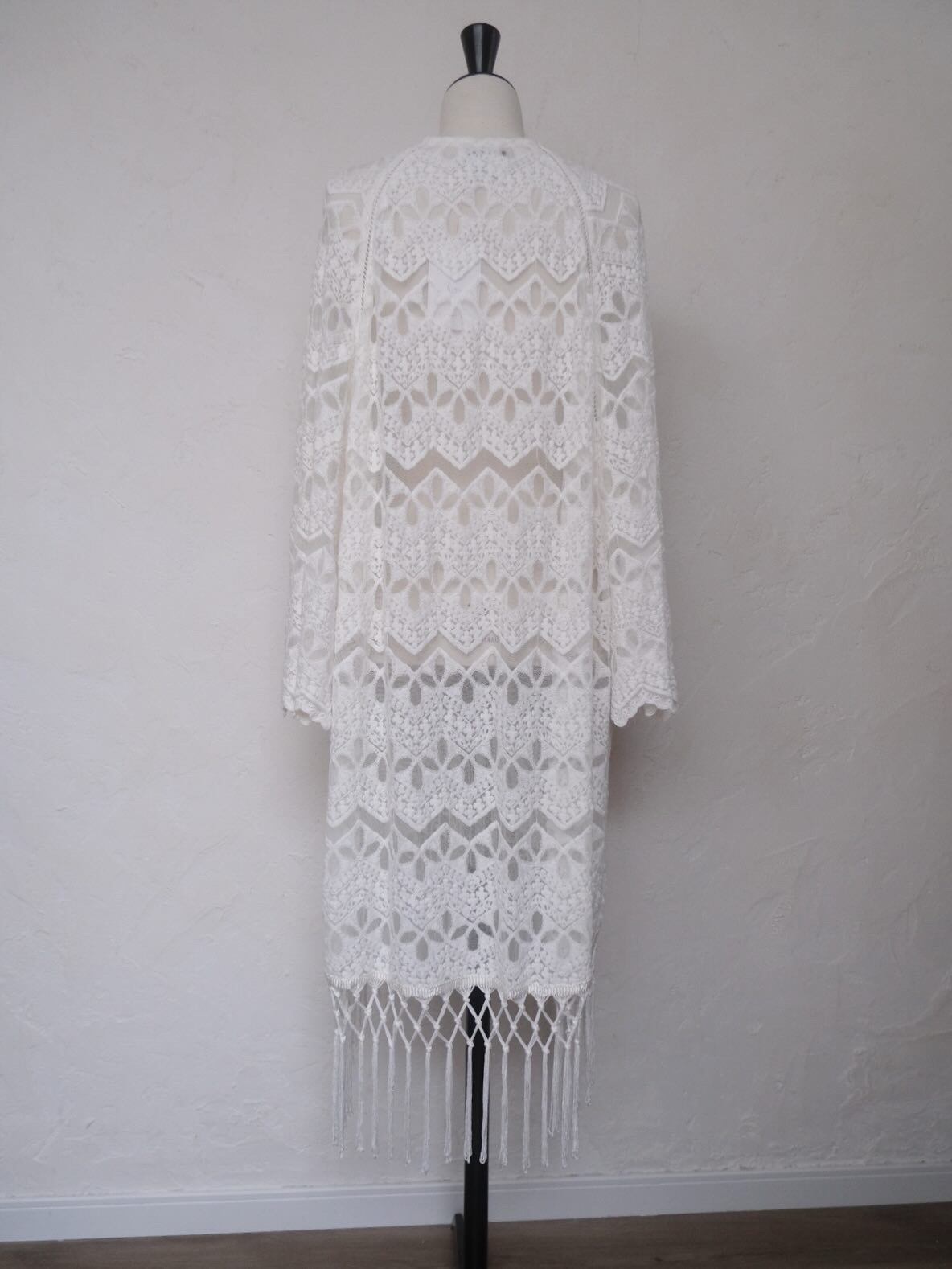 動く度に揺れるフリンジが可愛いlaceとmeshのロングカーディガン。
