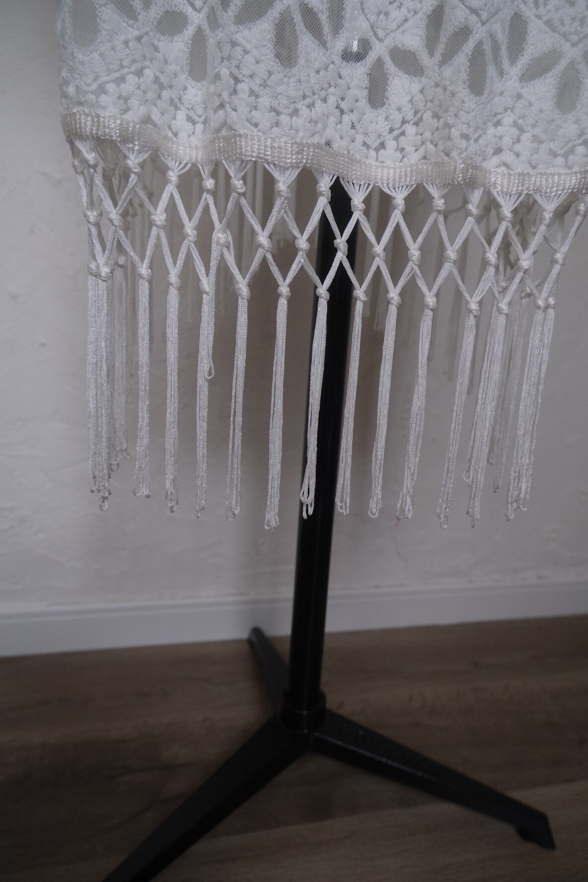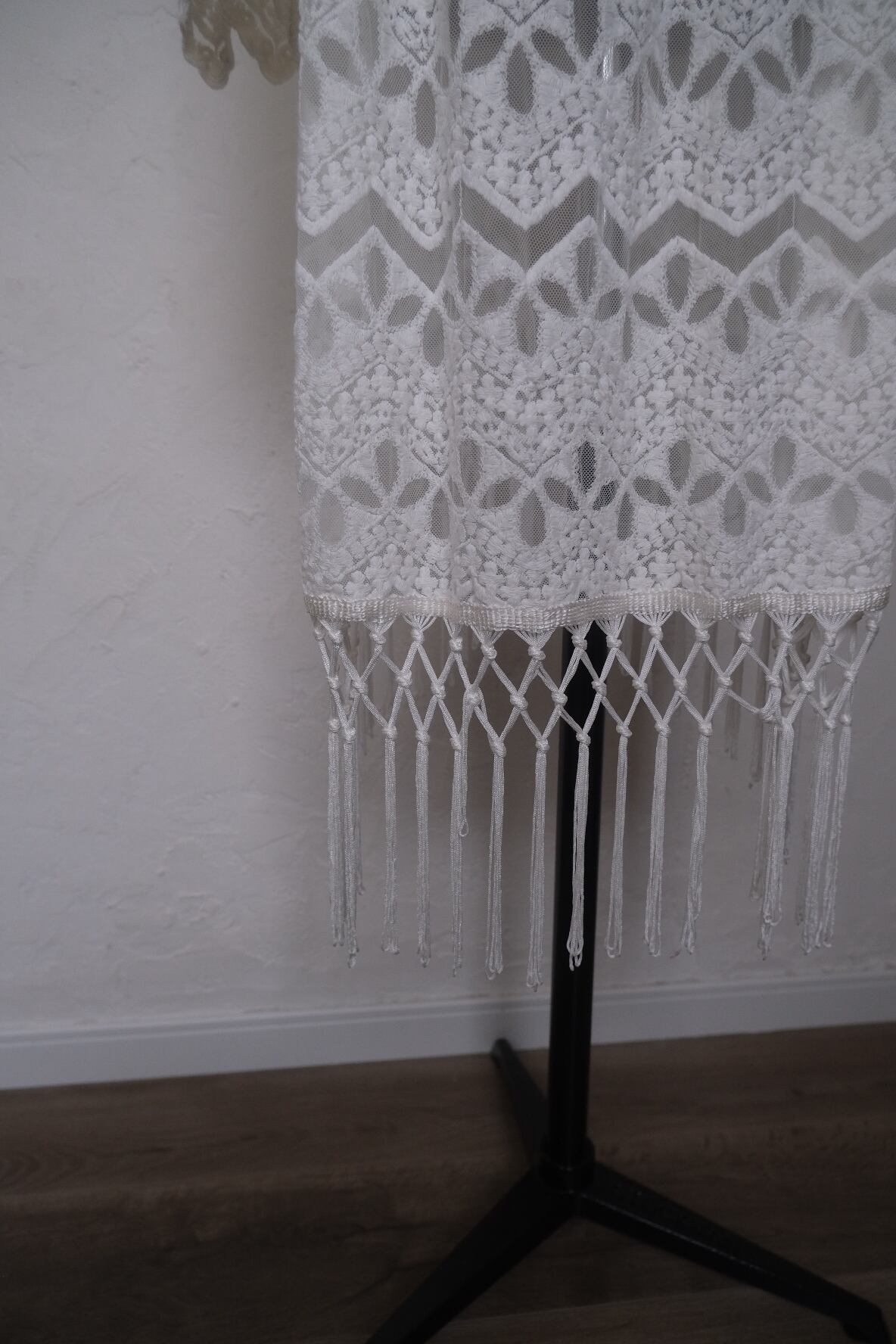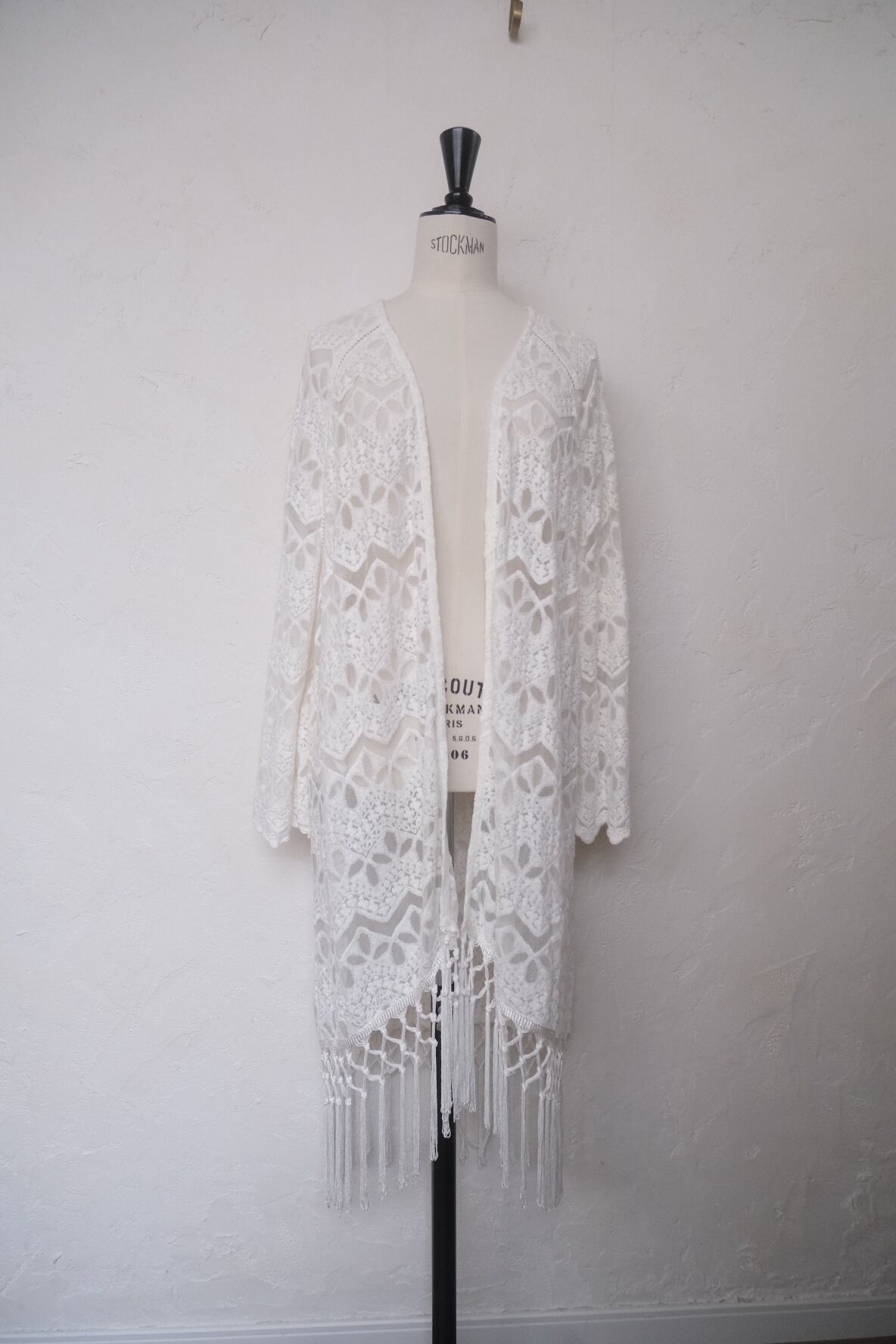 動く度に揺れるフリンジが可愛いlaceとmeshのロングカーディガン。