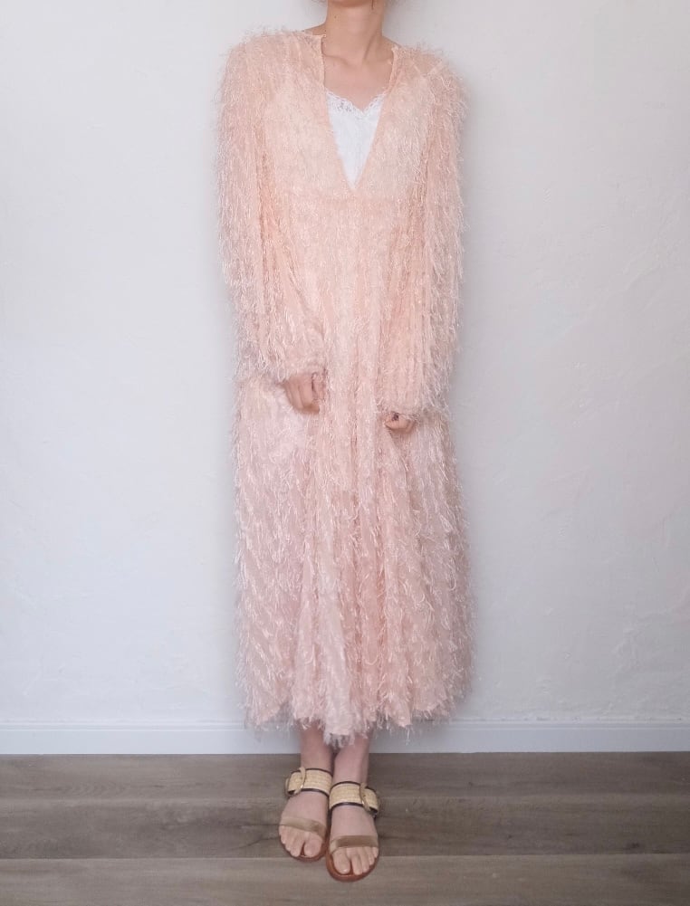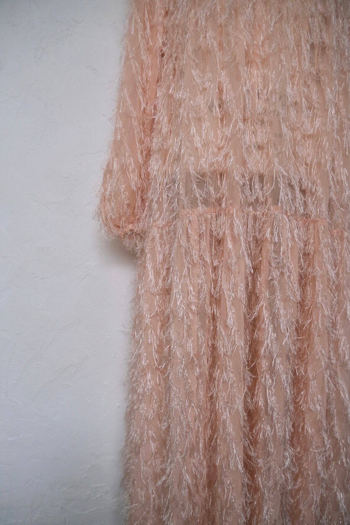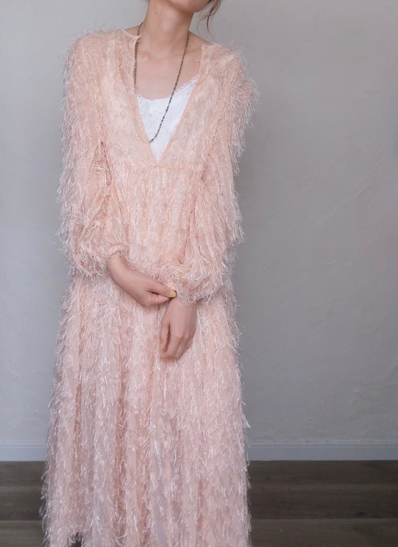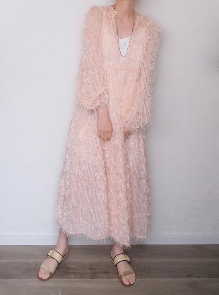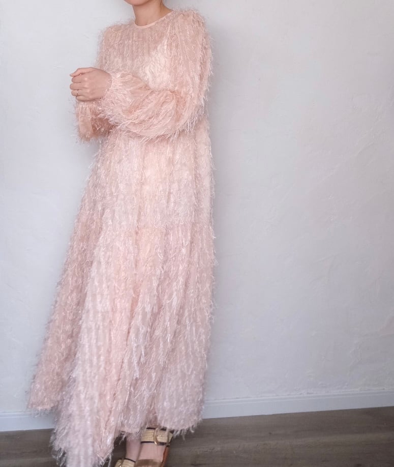 ふわふわのシャギーが可愛いシアーロングドレス。動くたびになびく軽い質感で春にぴったりな一枚です。