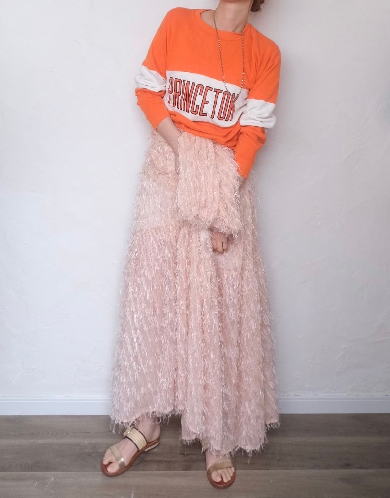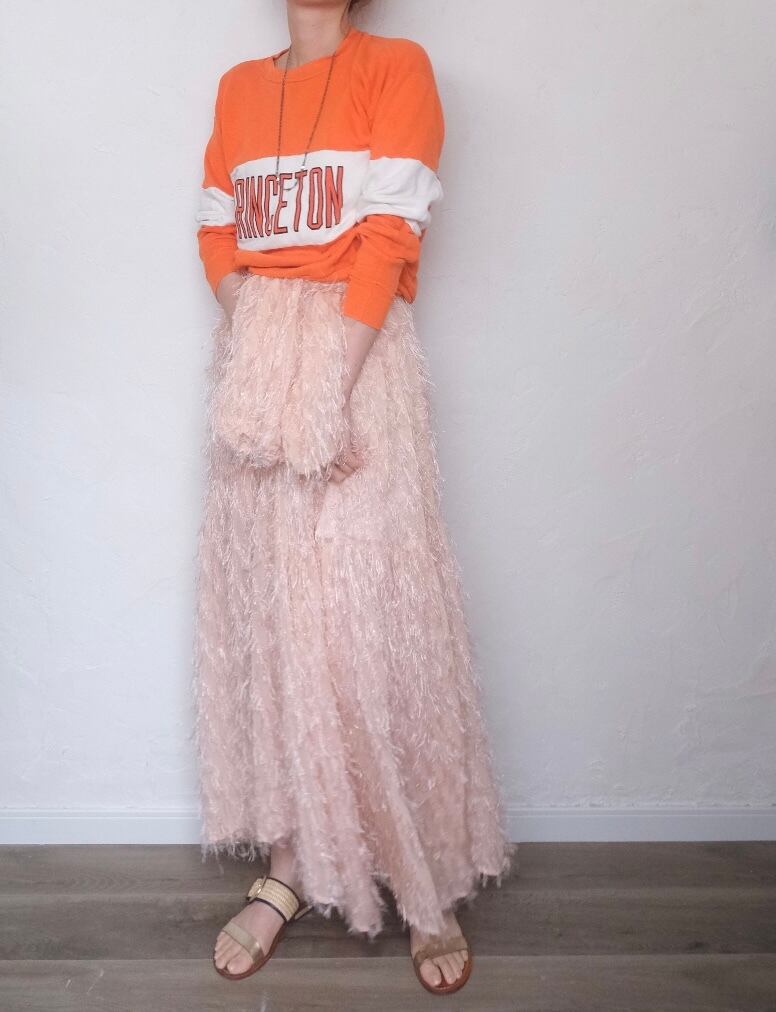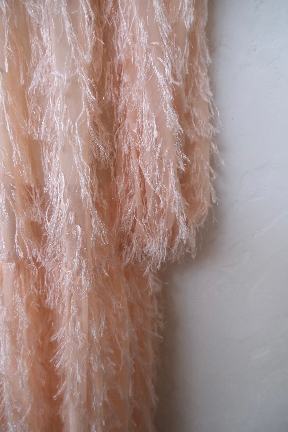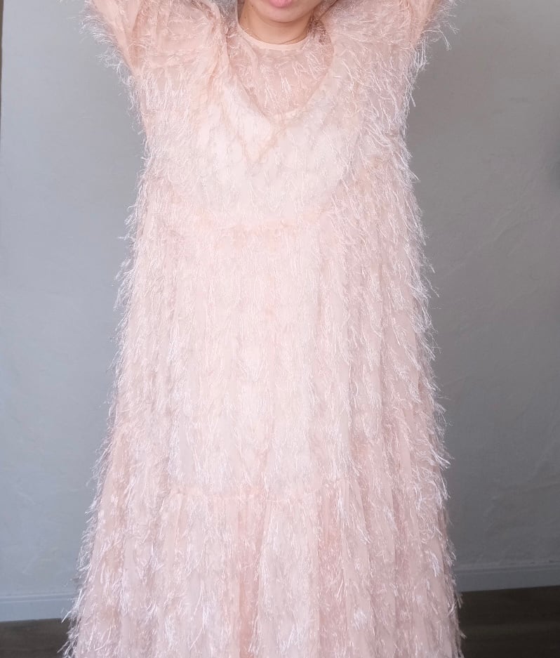 ふわふわのシャギーが可愛いシアーロングドレス。動くたびになびく軽い質感で春にぴったりな一枚です。
