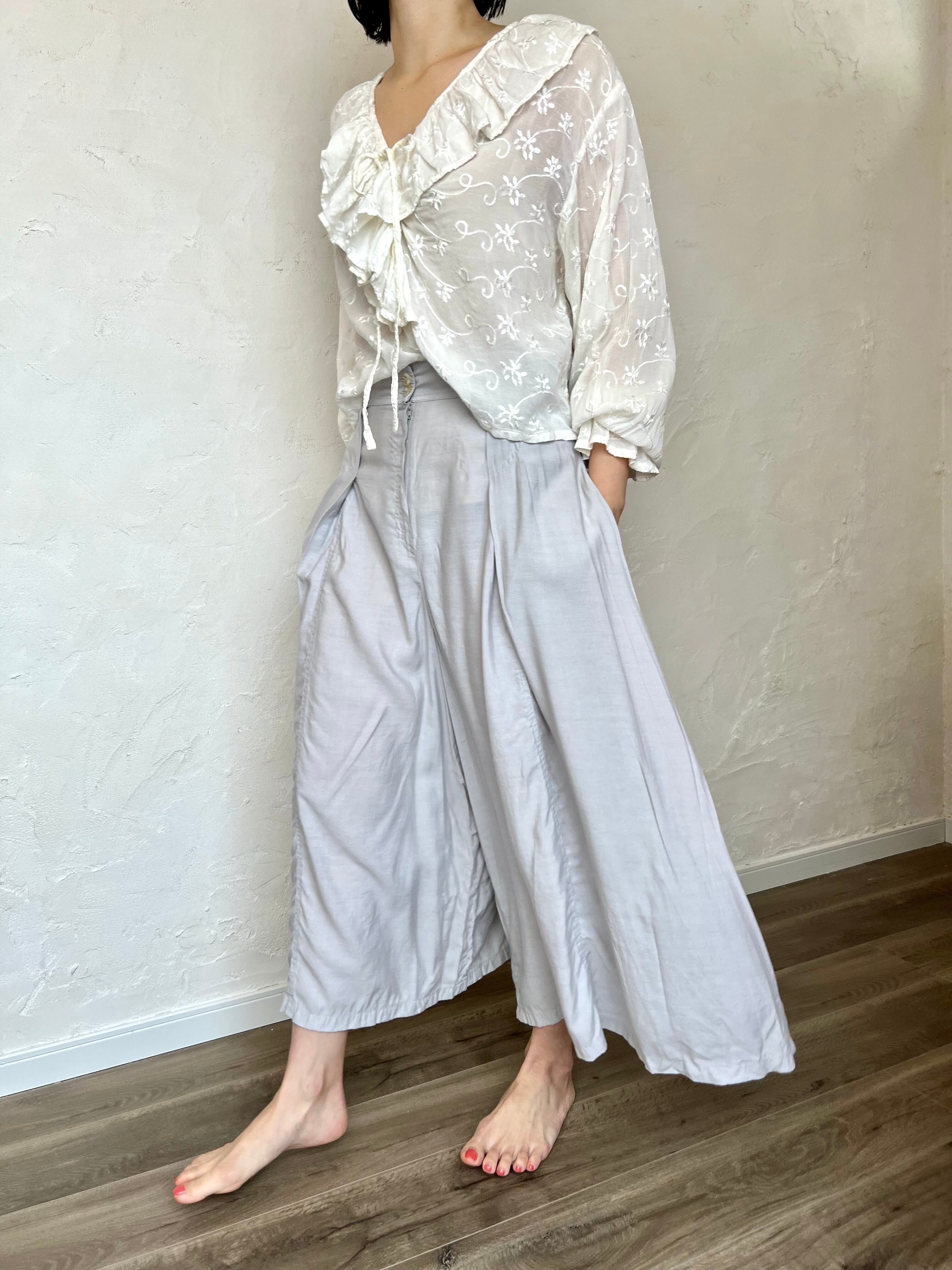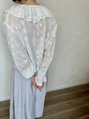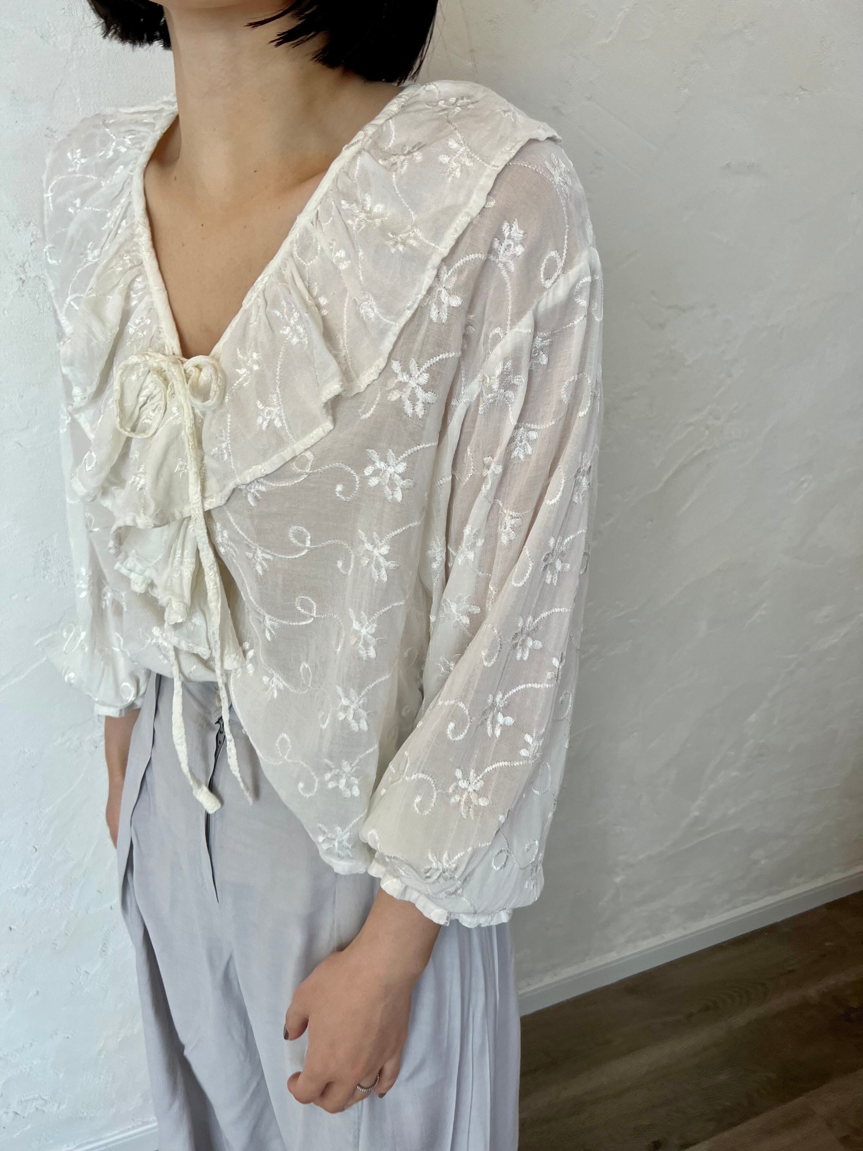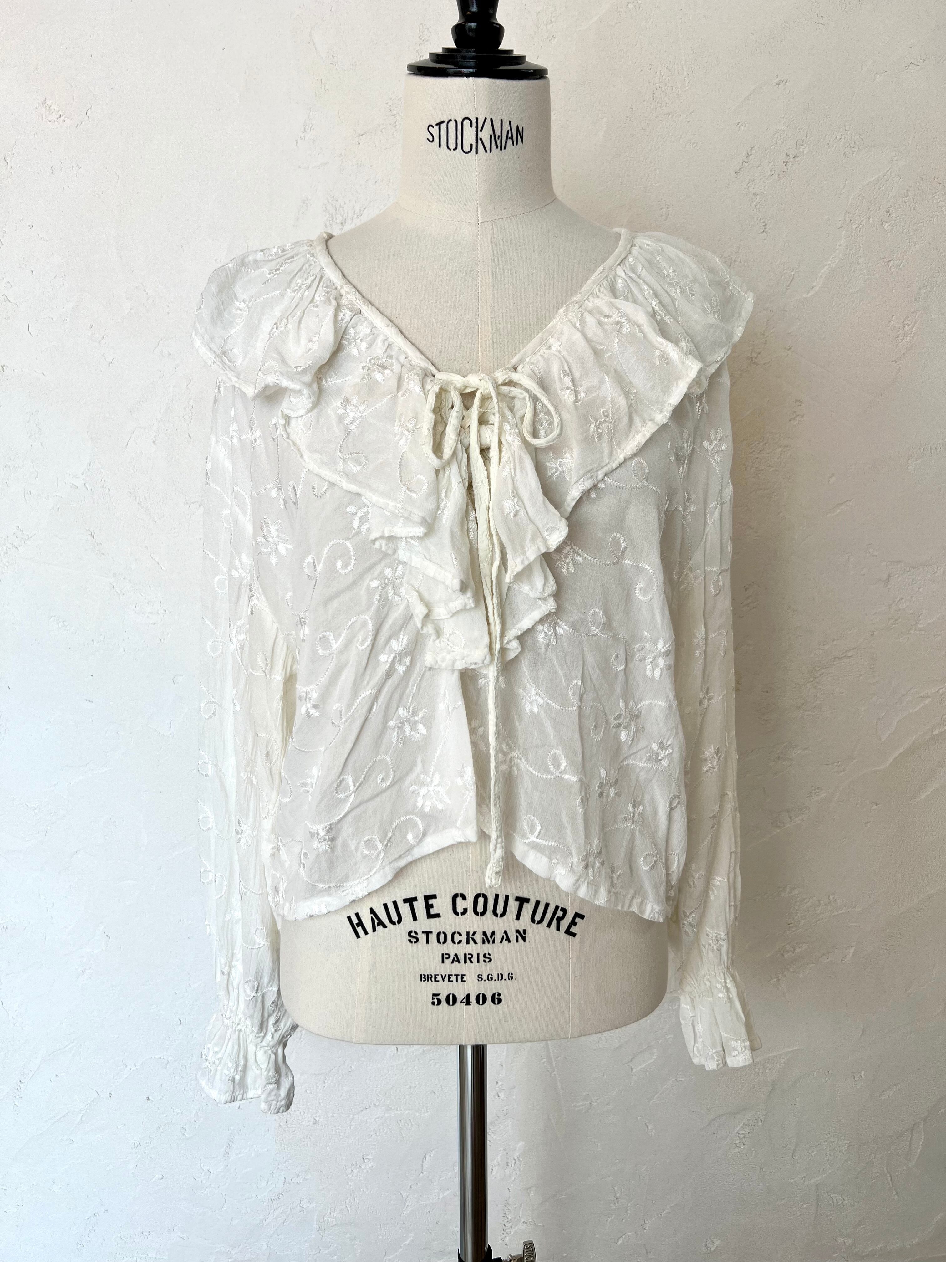 刺繍の施された生地でレースアップにフリルというスペシャルなデザインのブラウスです。