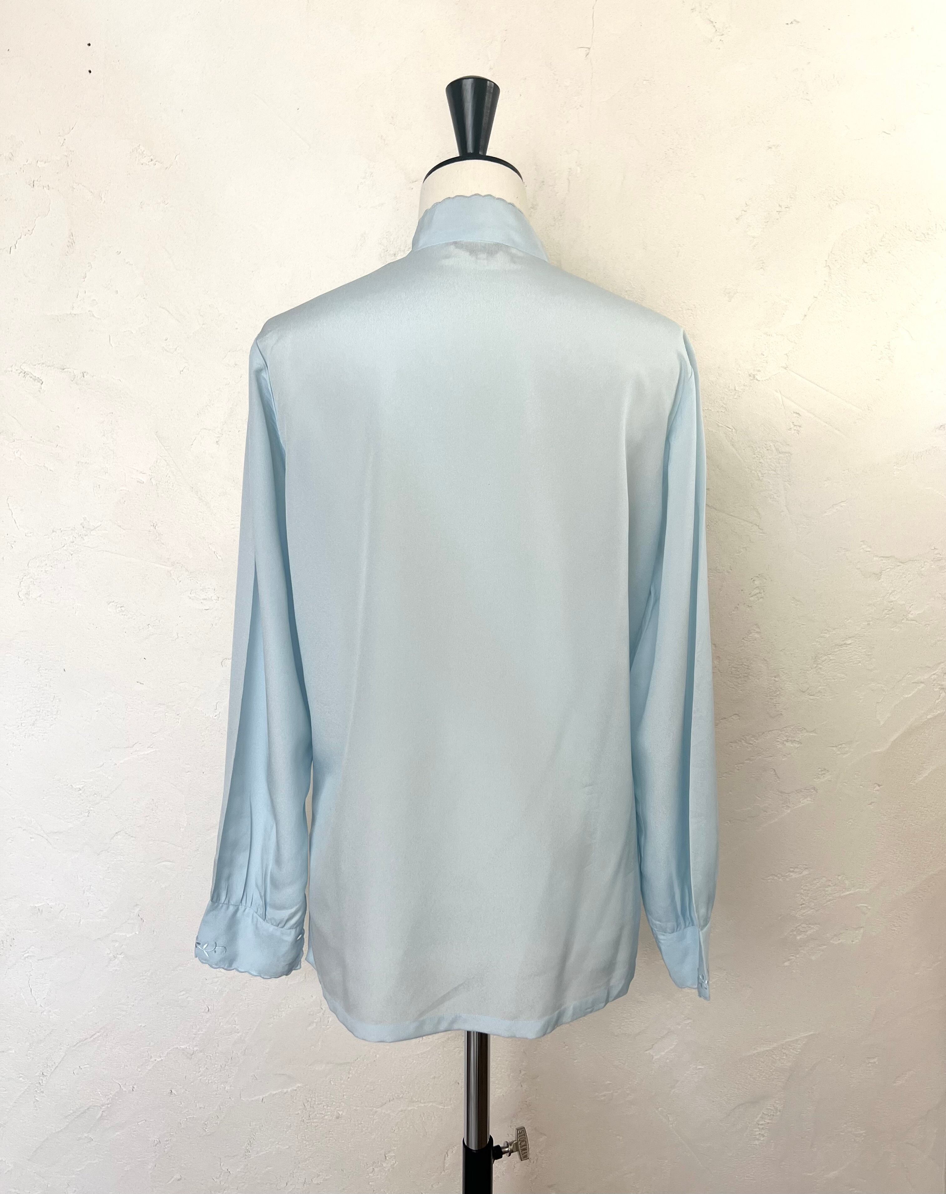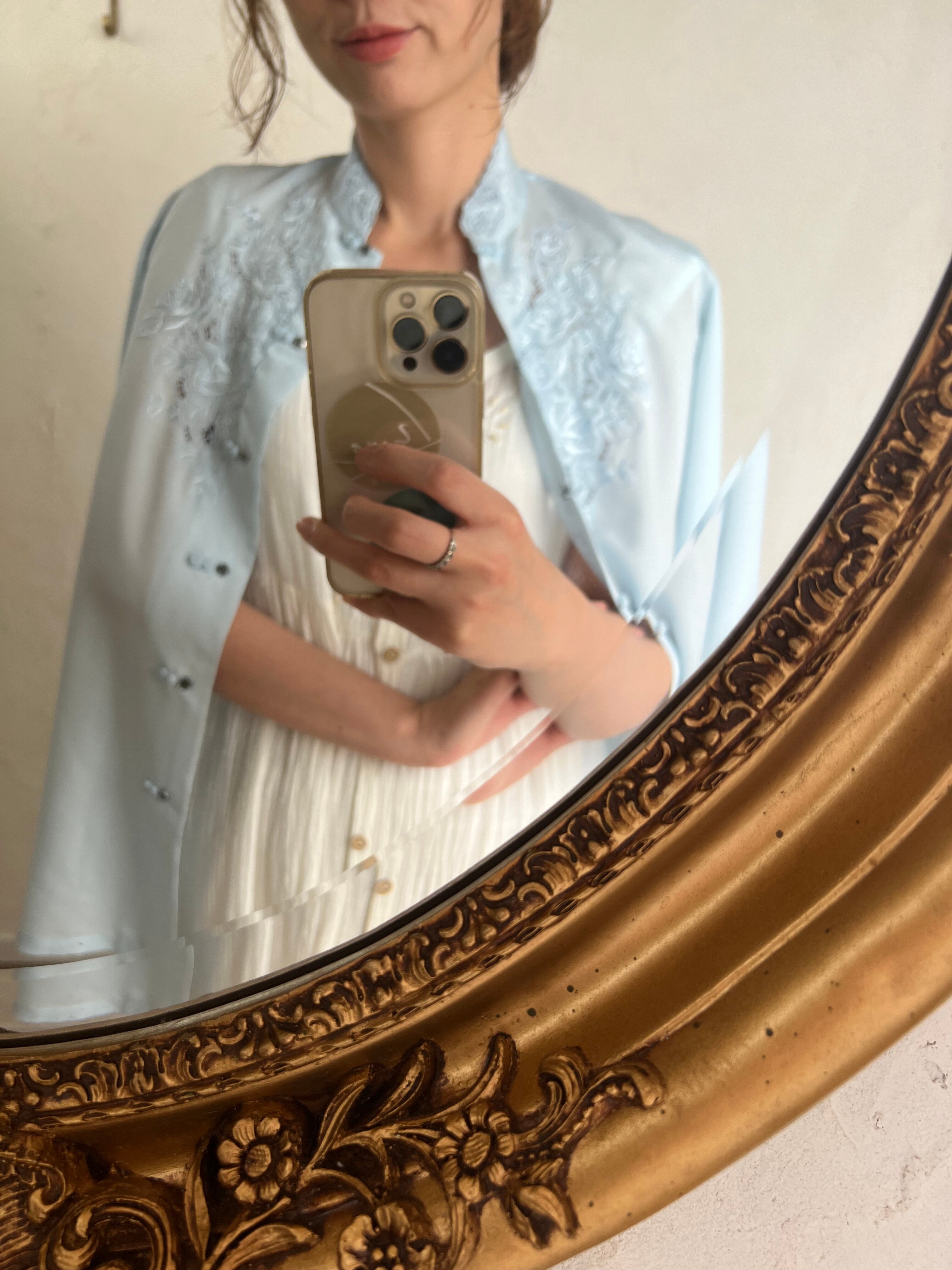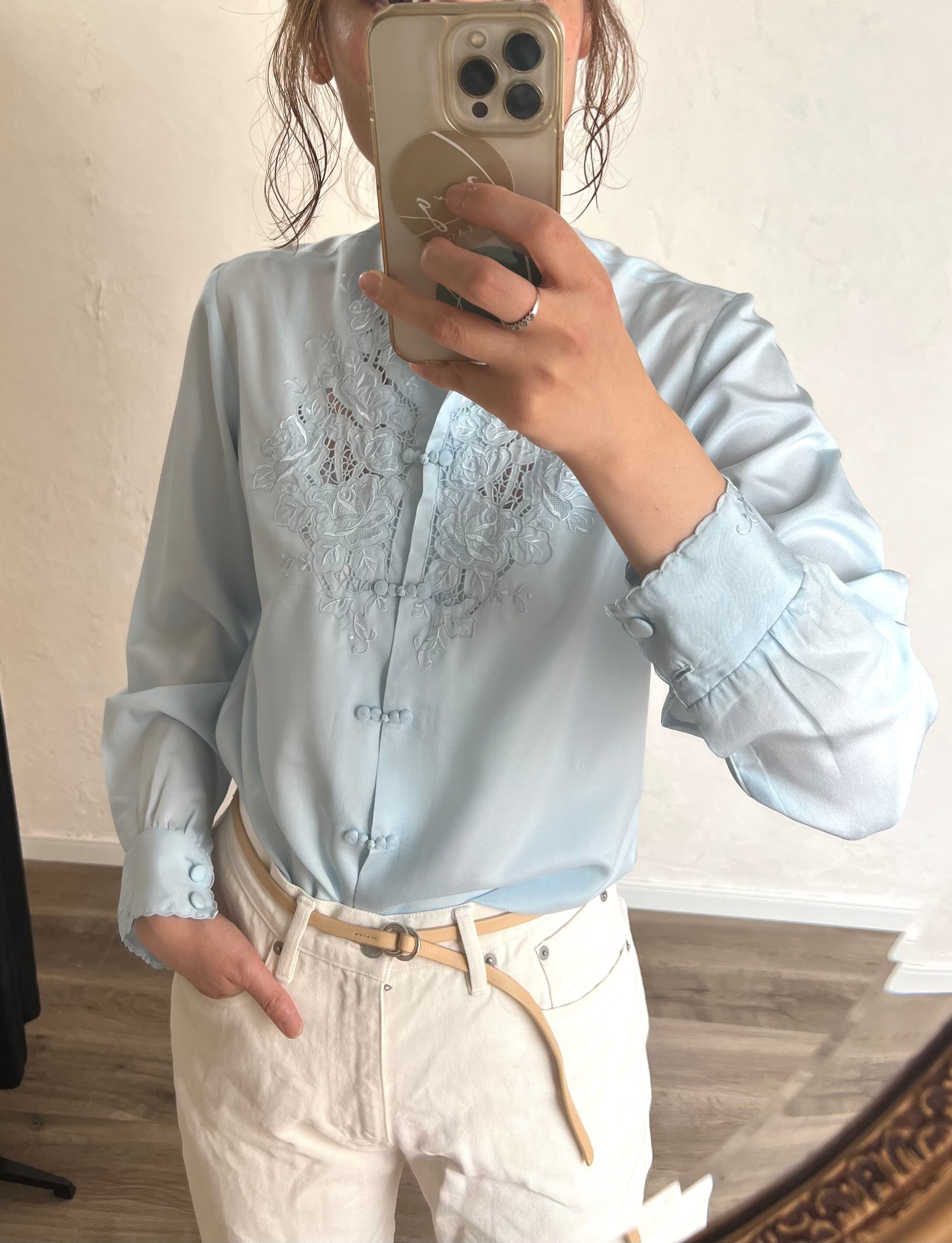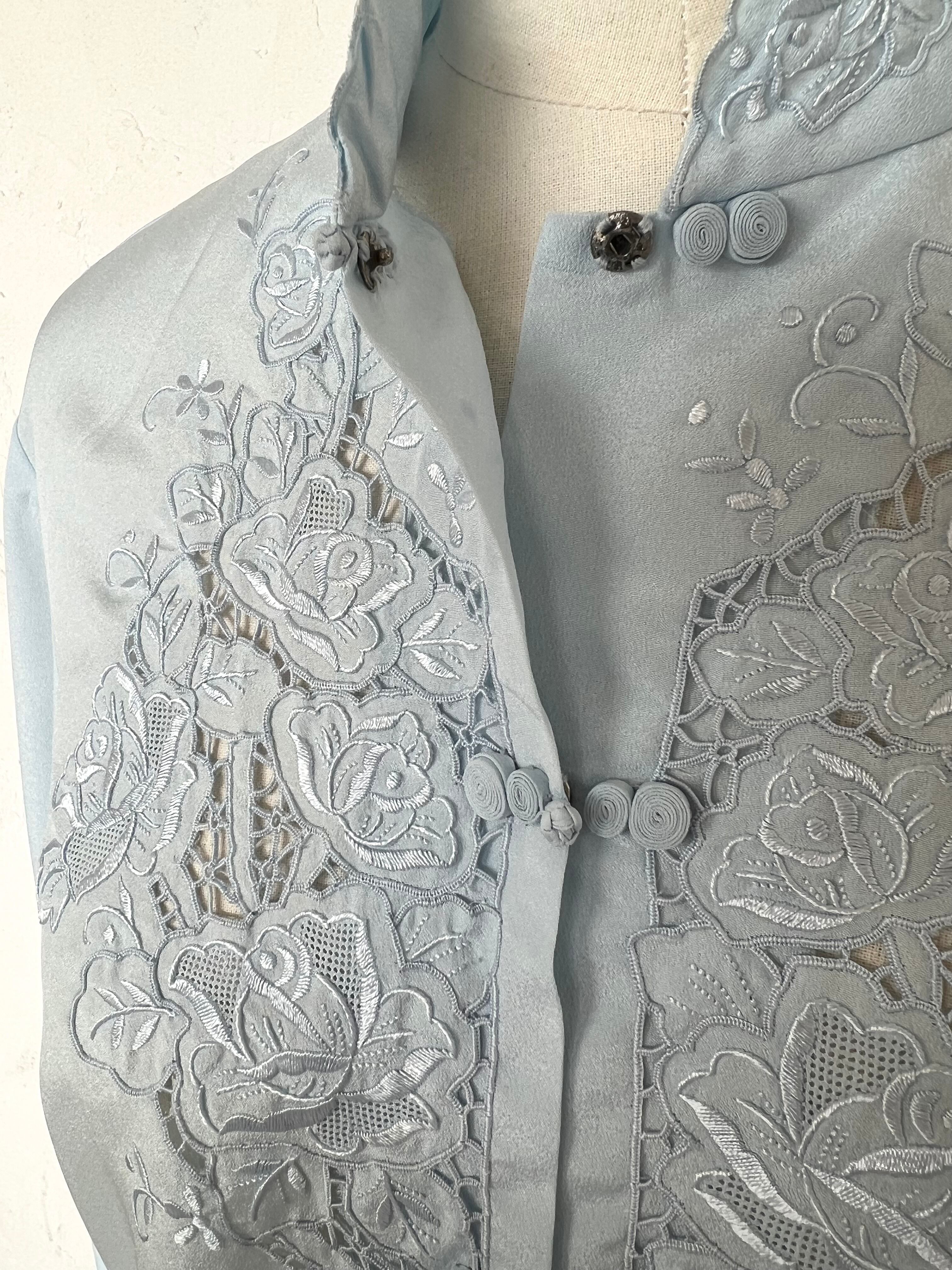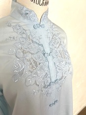 手刺繍が美しい、優しいライトブルーのsilk 100%のチャイナシャツです。