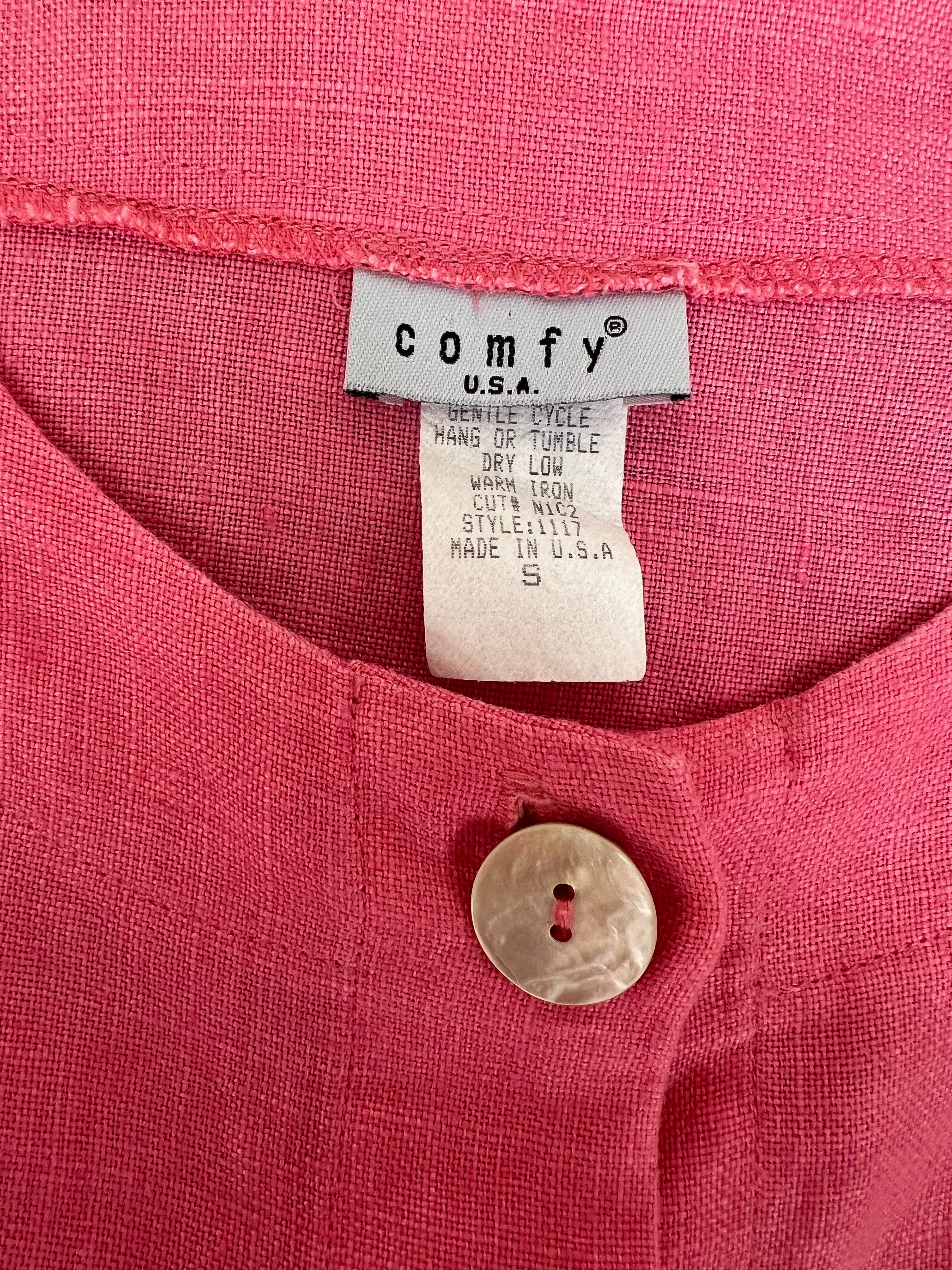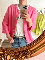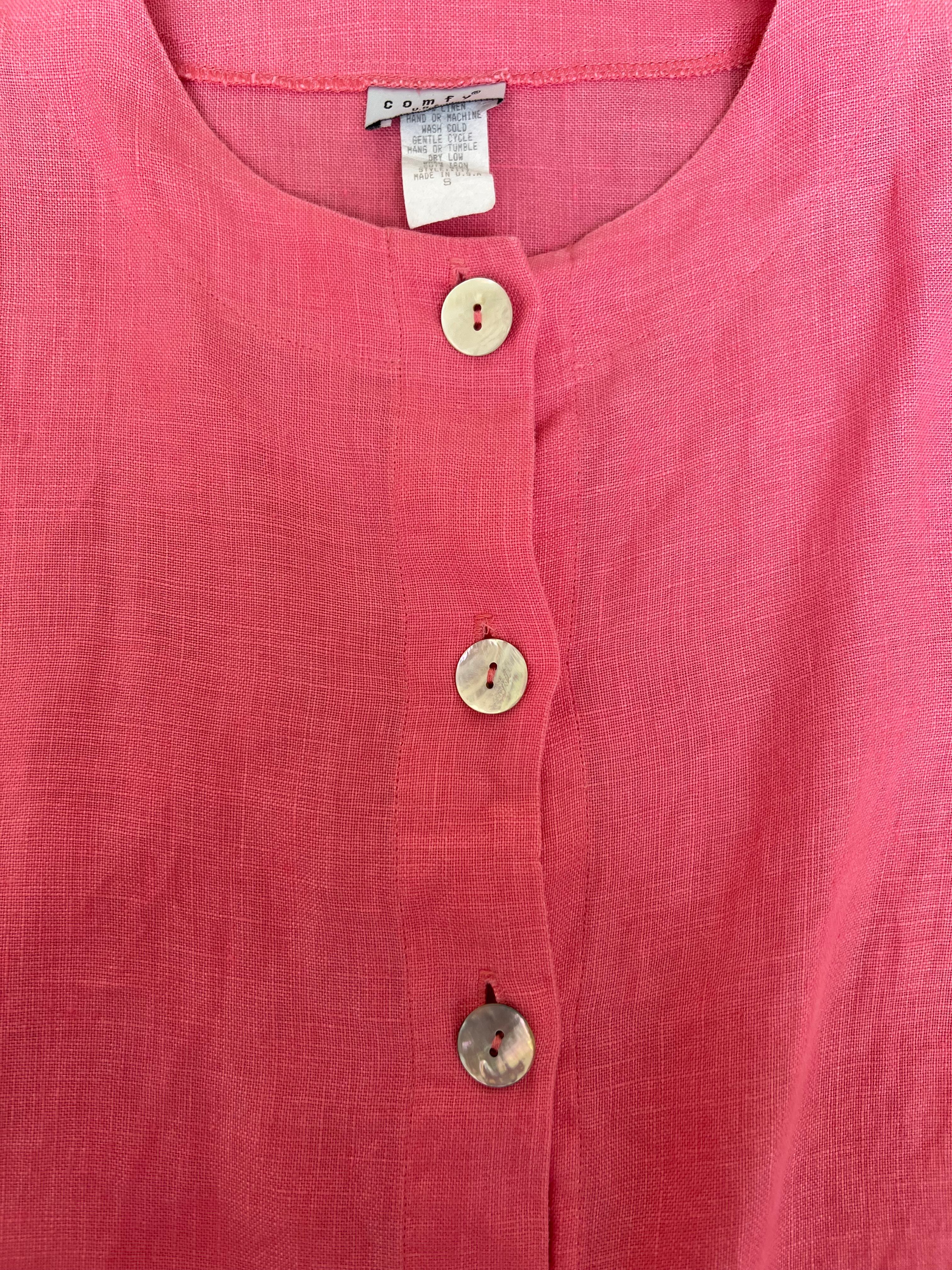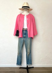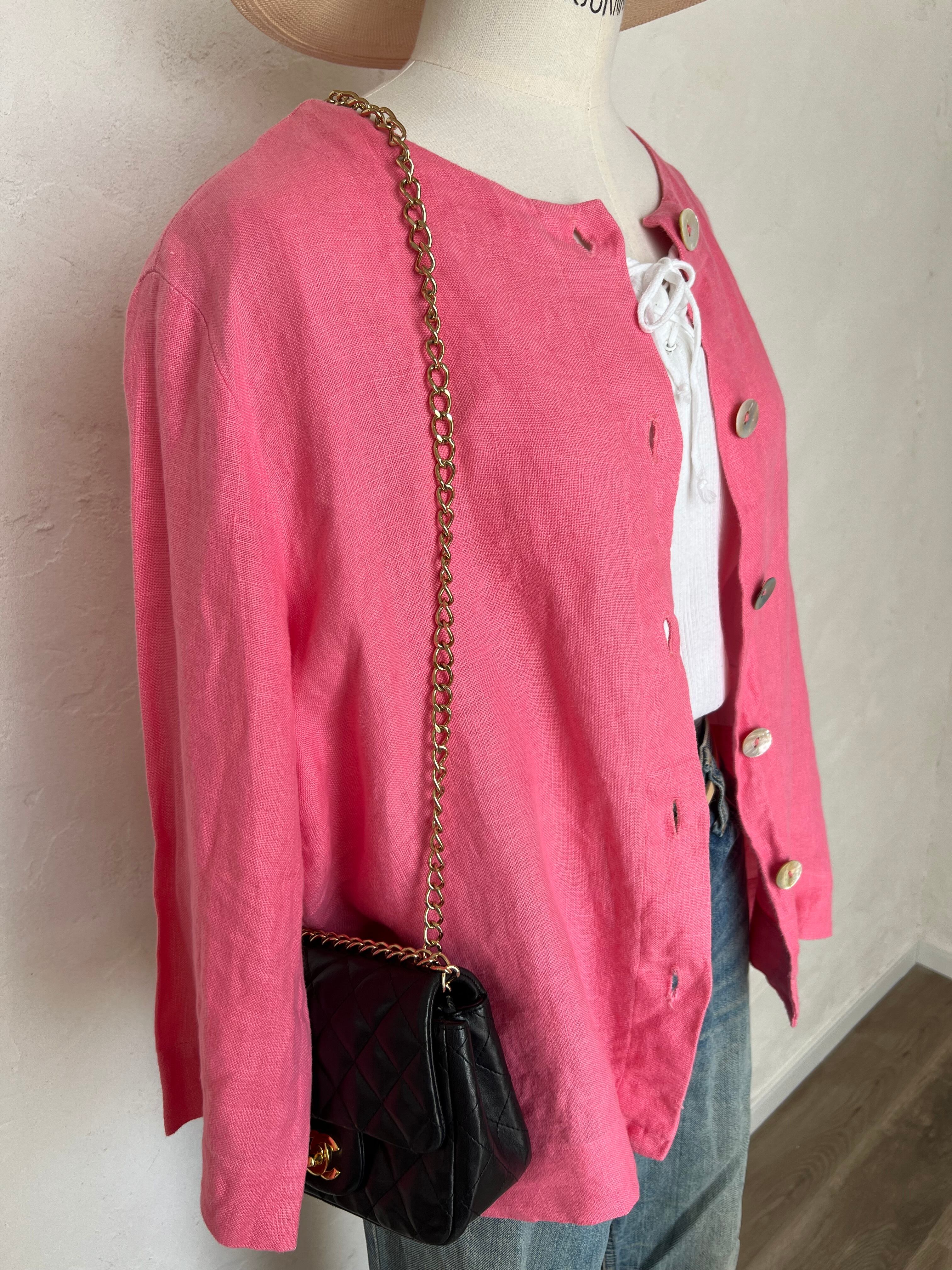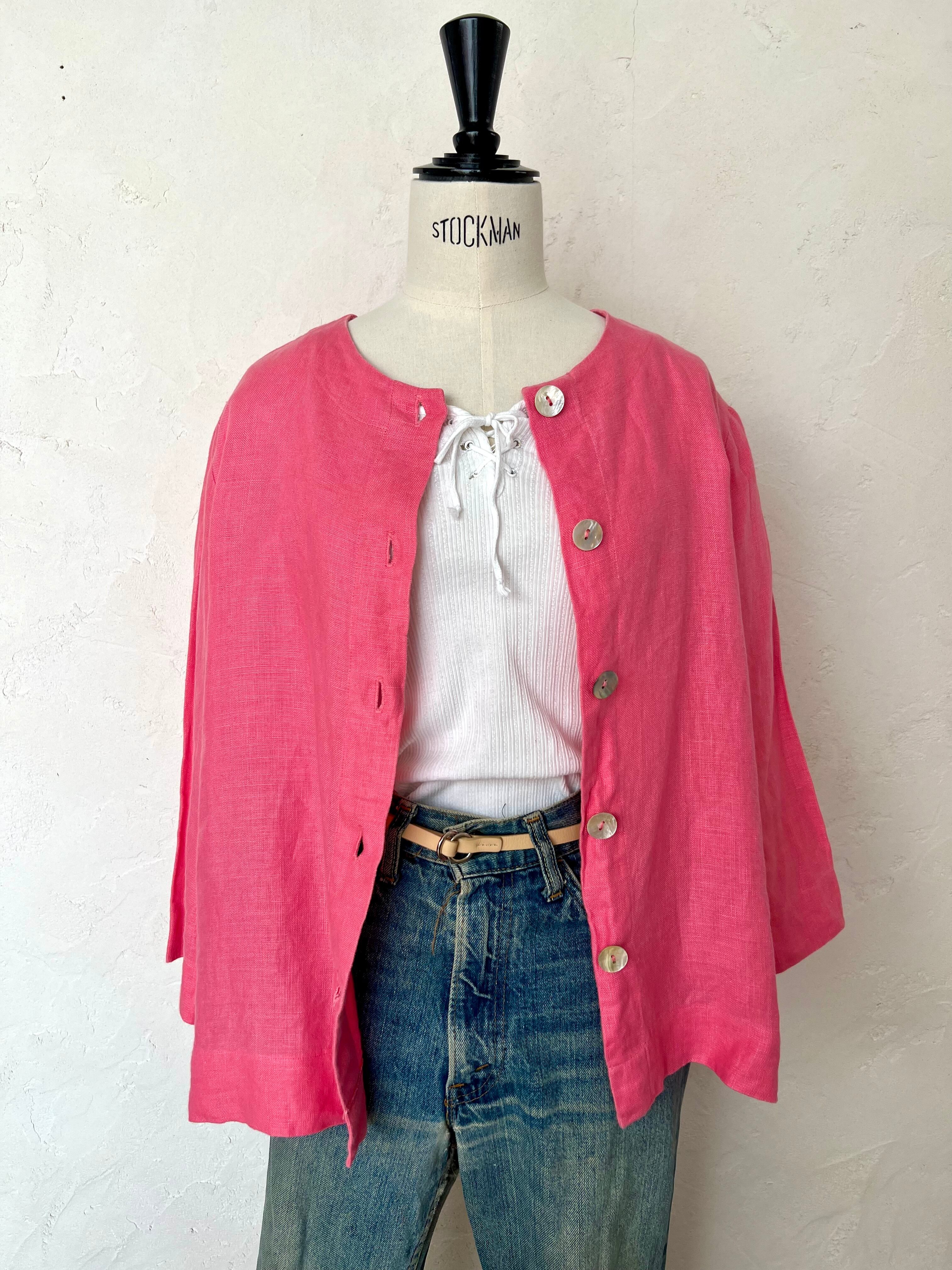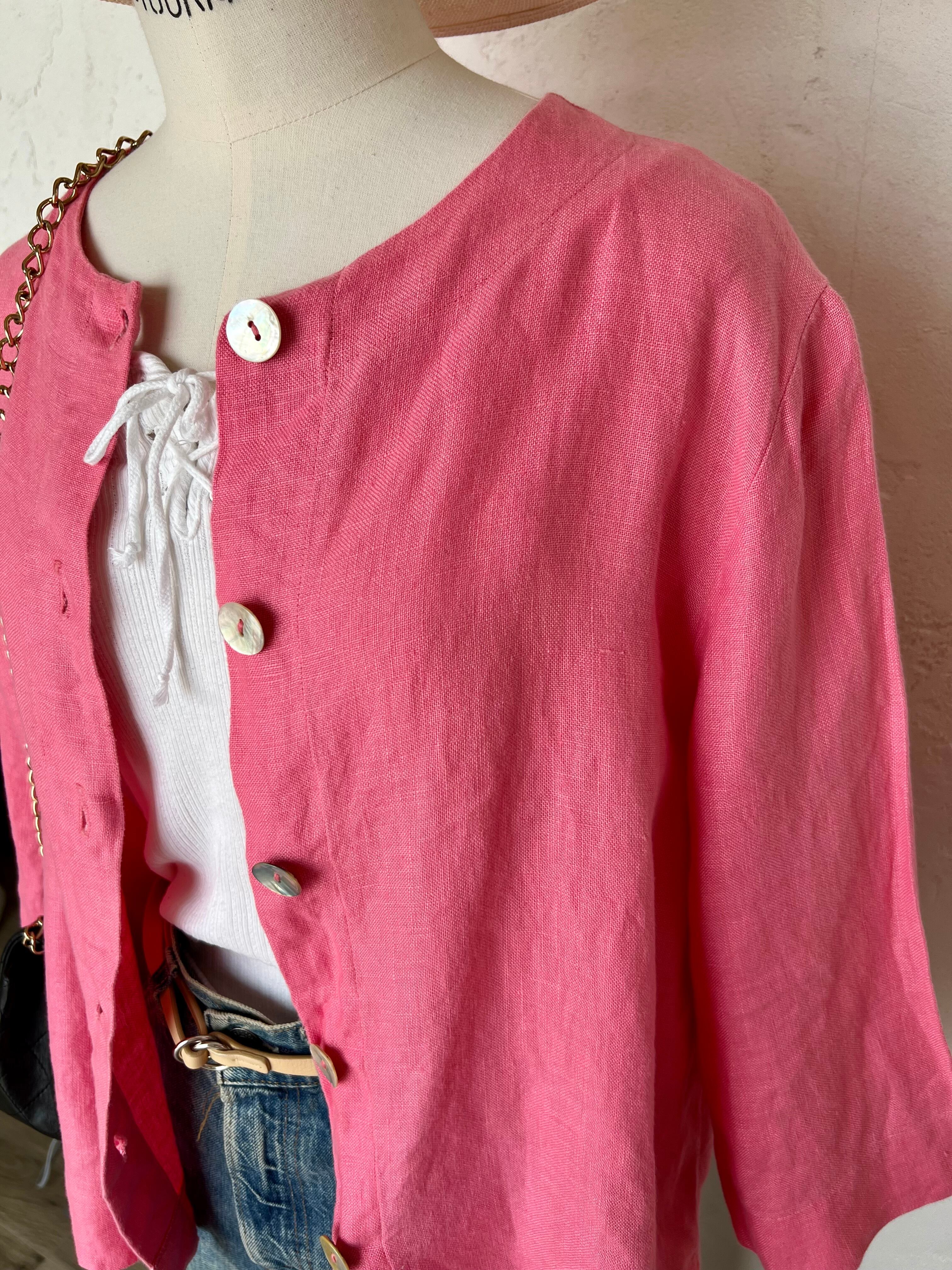 鮮やかなピンクのノーカラーリネンジャケットです。お袖は七、八分袖のデザイン。