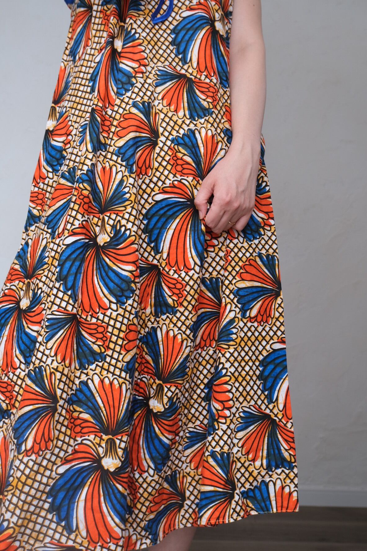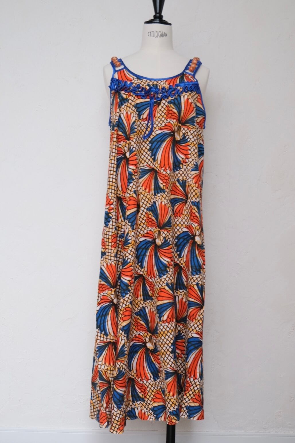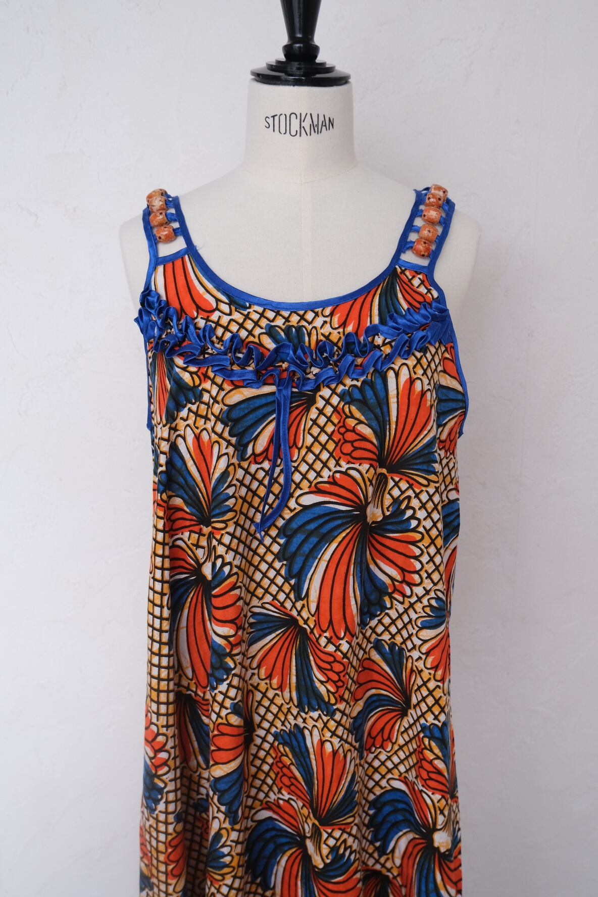 花が描かれたウッドビーズがストラップになっているバティックワンピース。