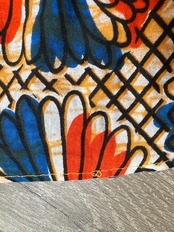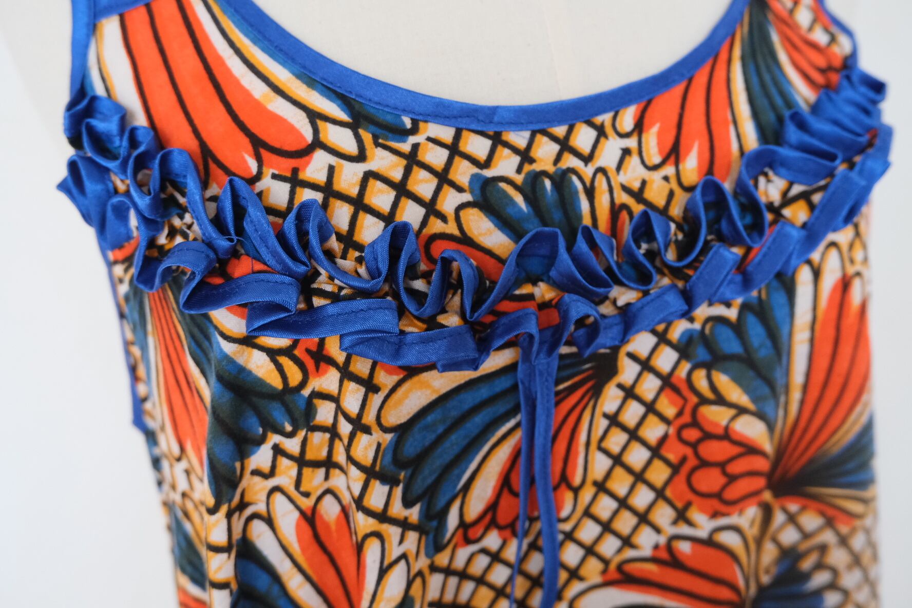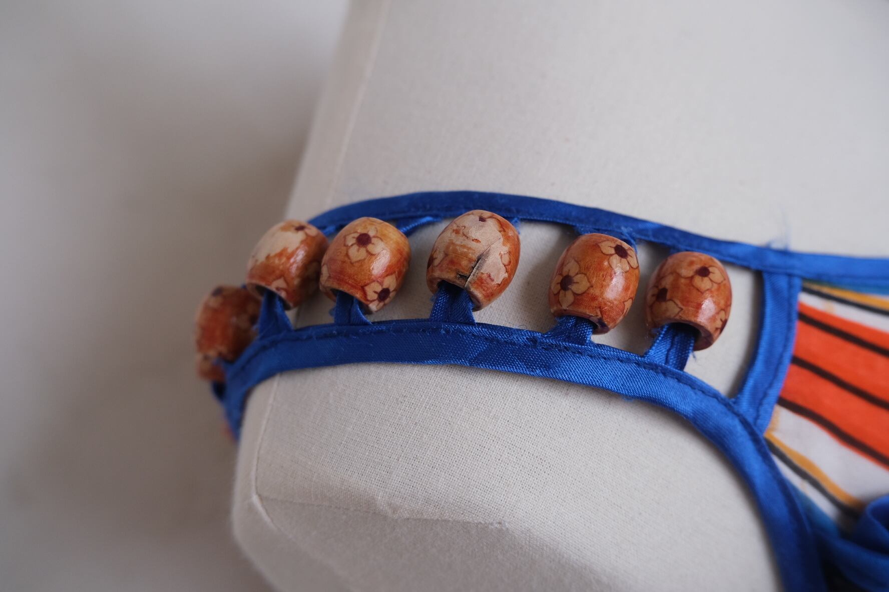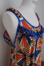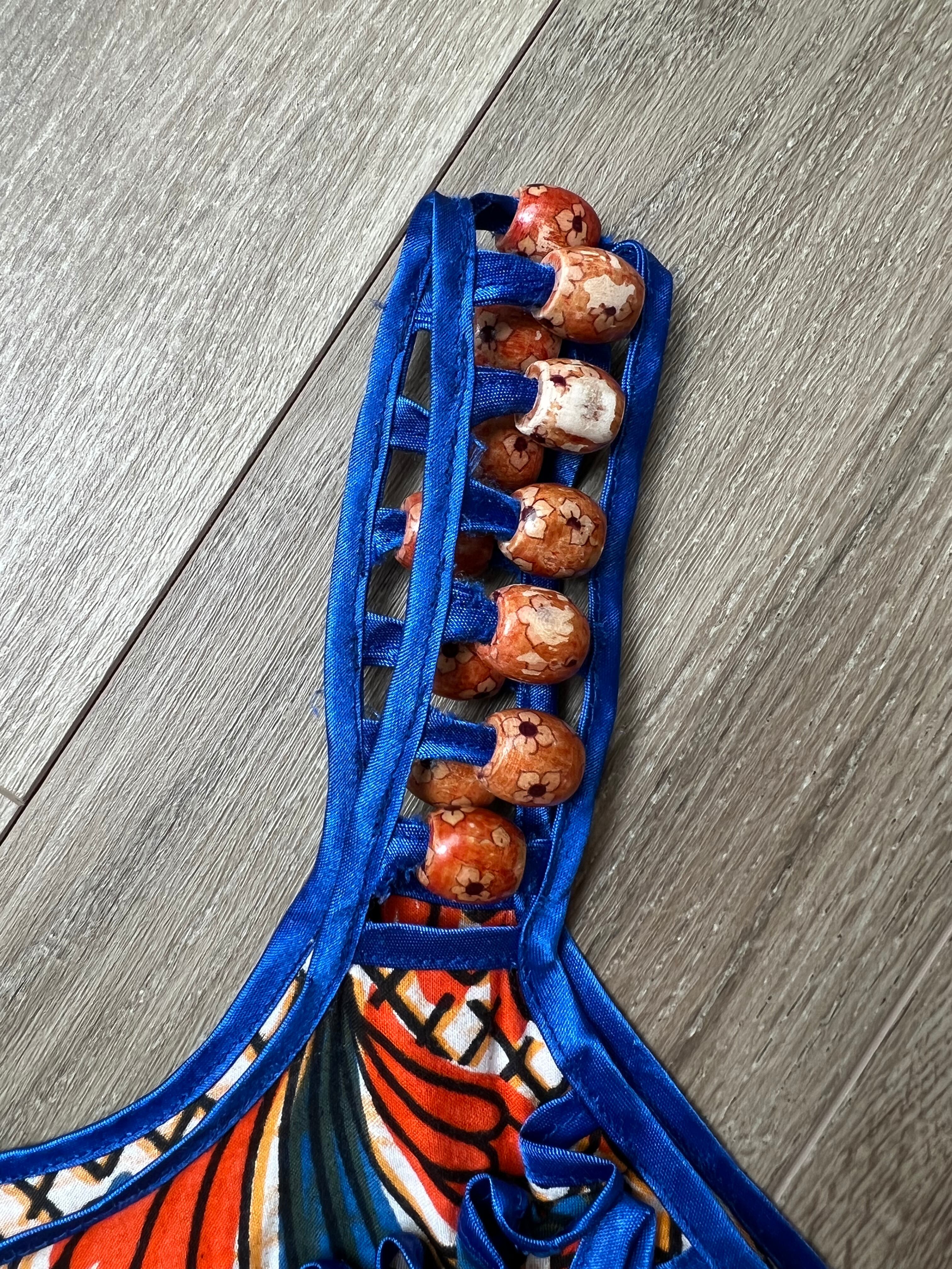 花が描かれたウッドビーズがストラップになっているバティックワンピース。