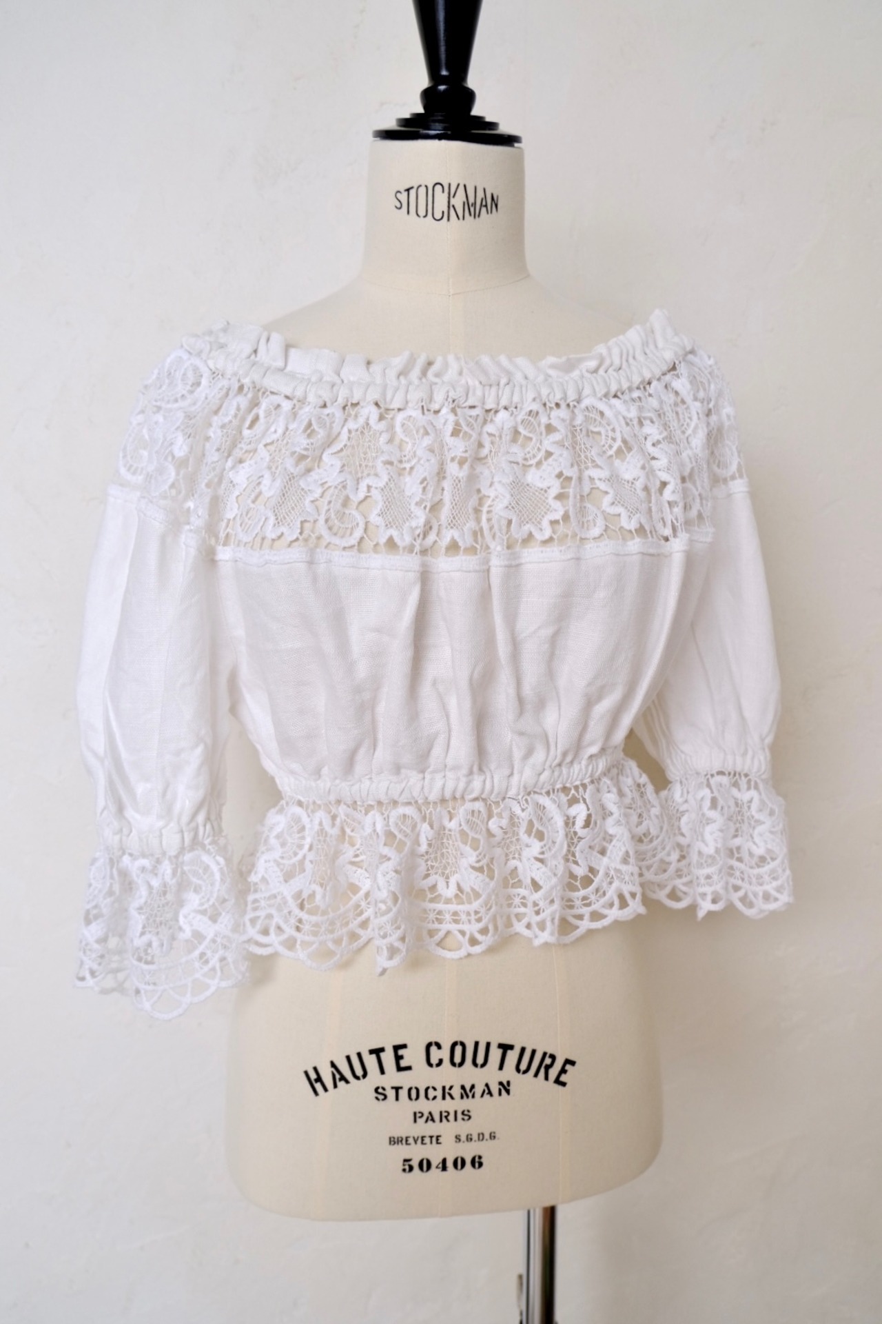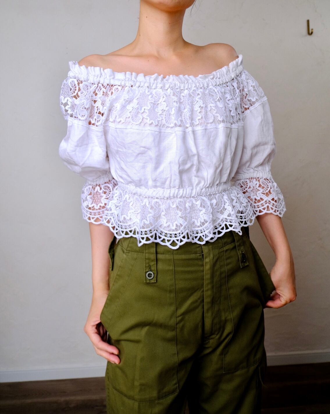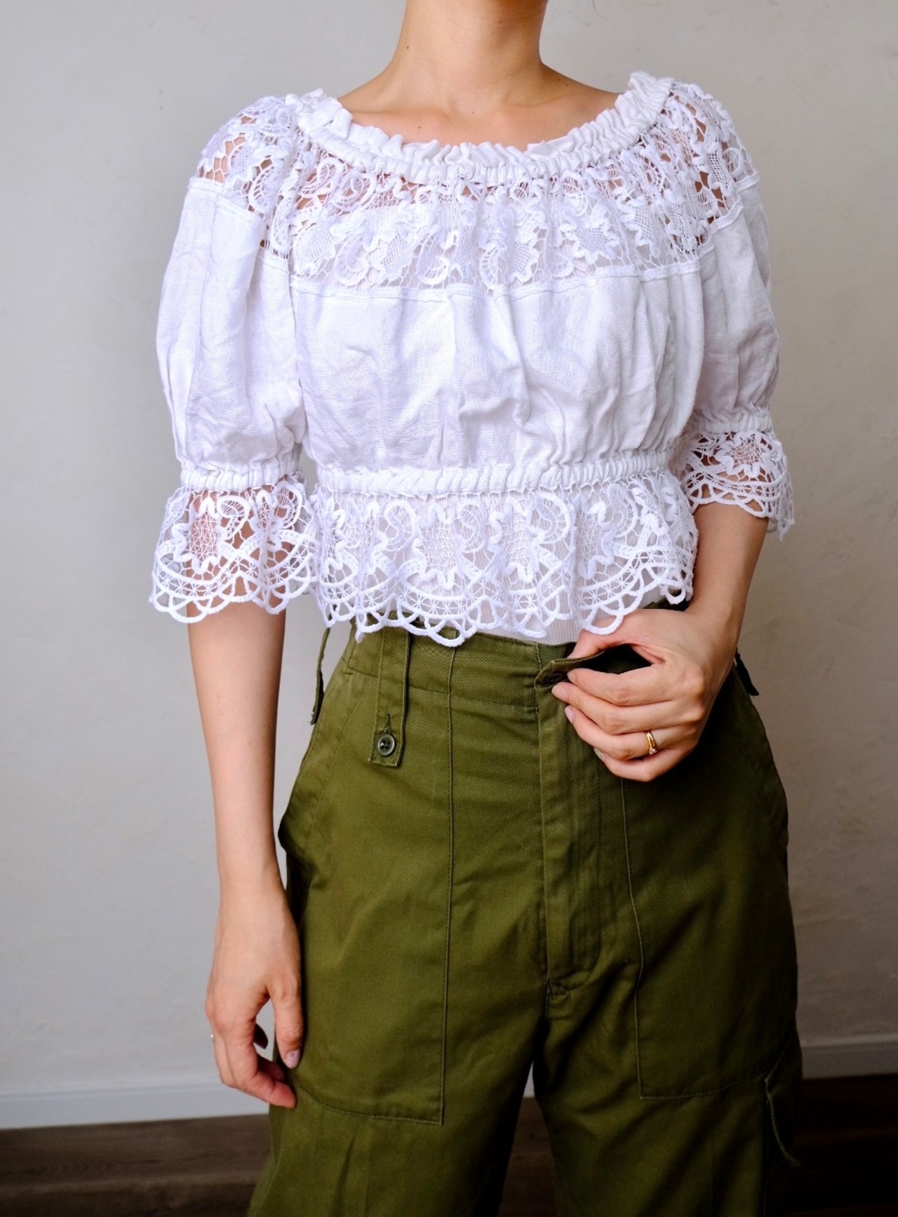 リネンのしっかりとしたファブリックにちょっと珍しいデザインのレース。