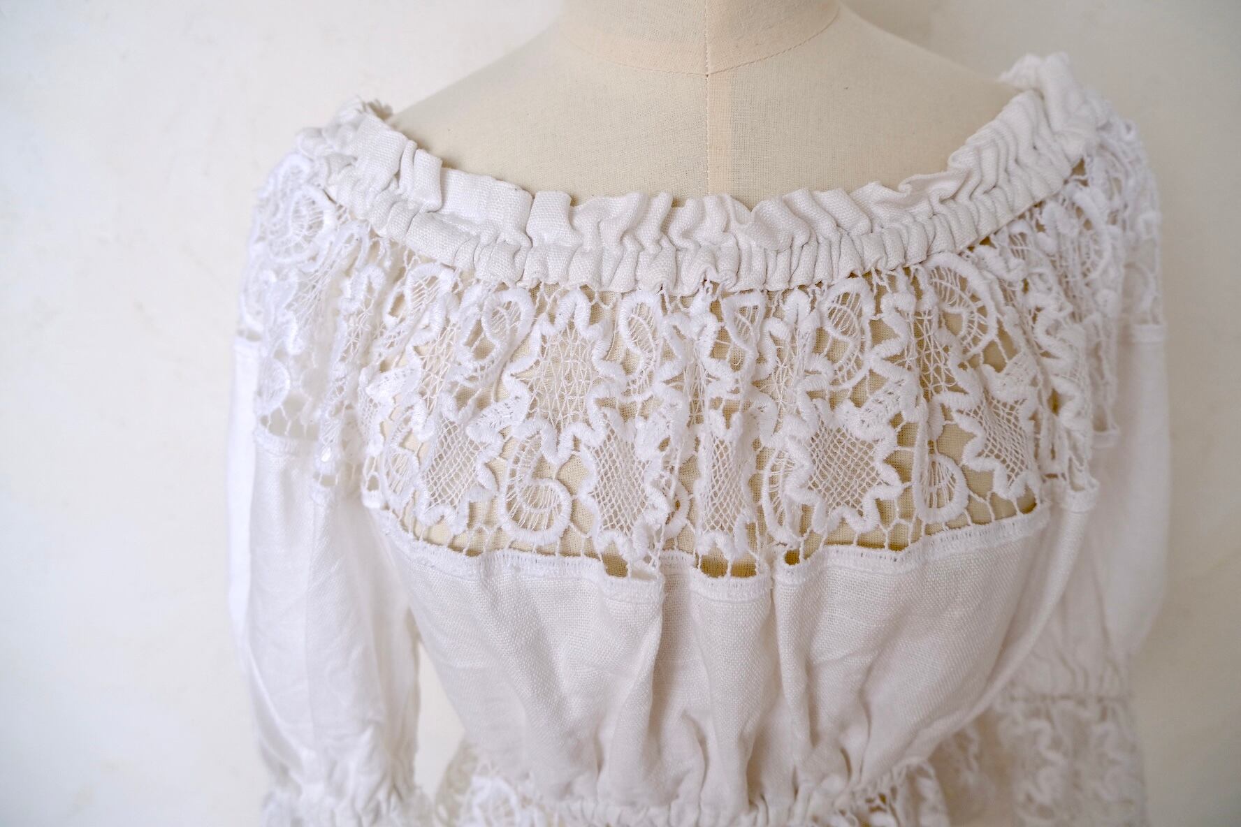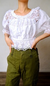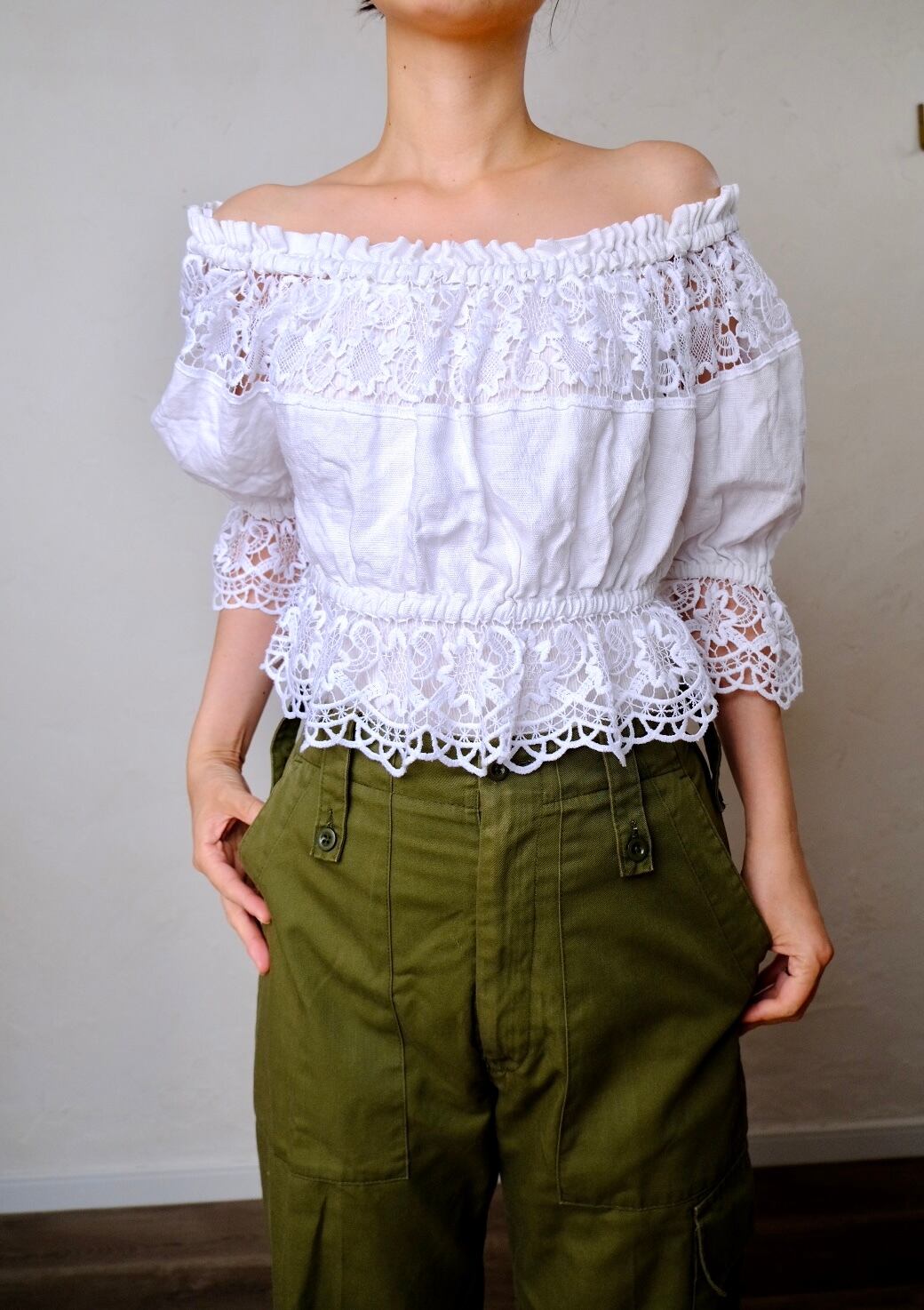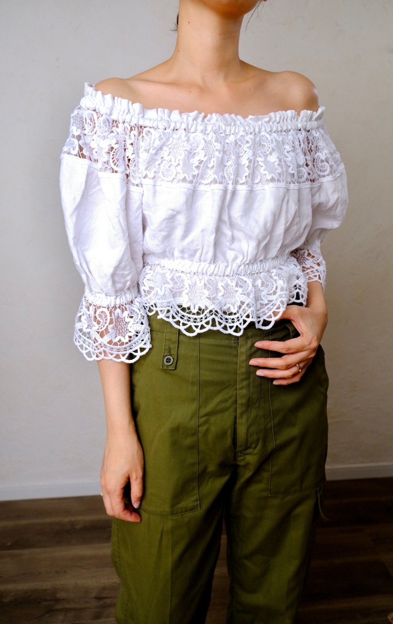 リネンのしっかりとしたファブリックにちょっと珍しいデザインのレース。
