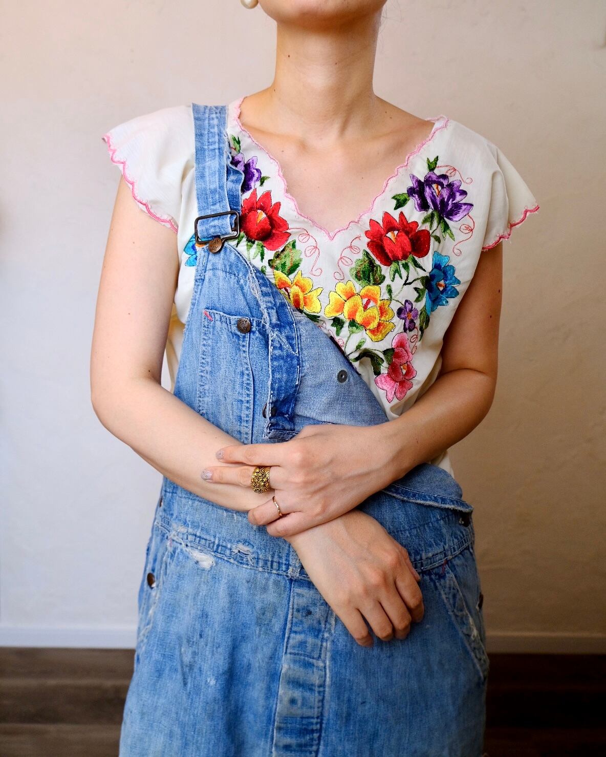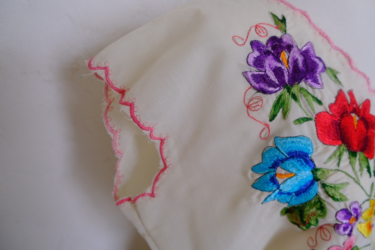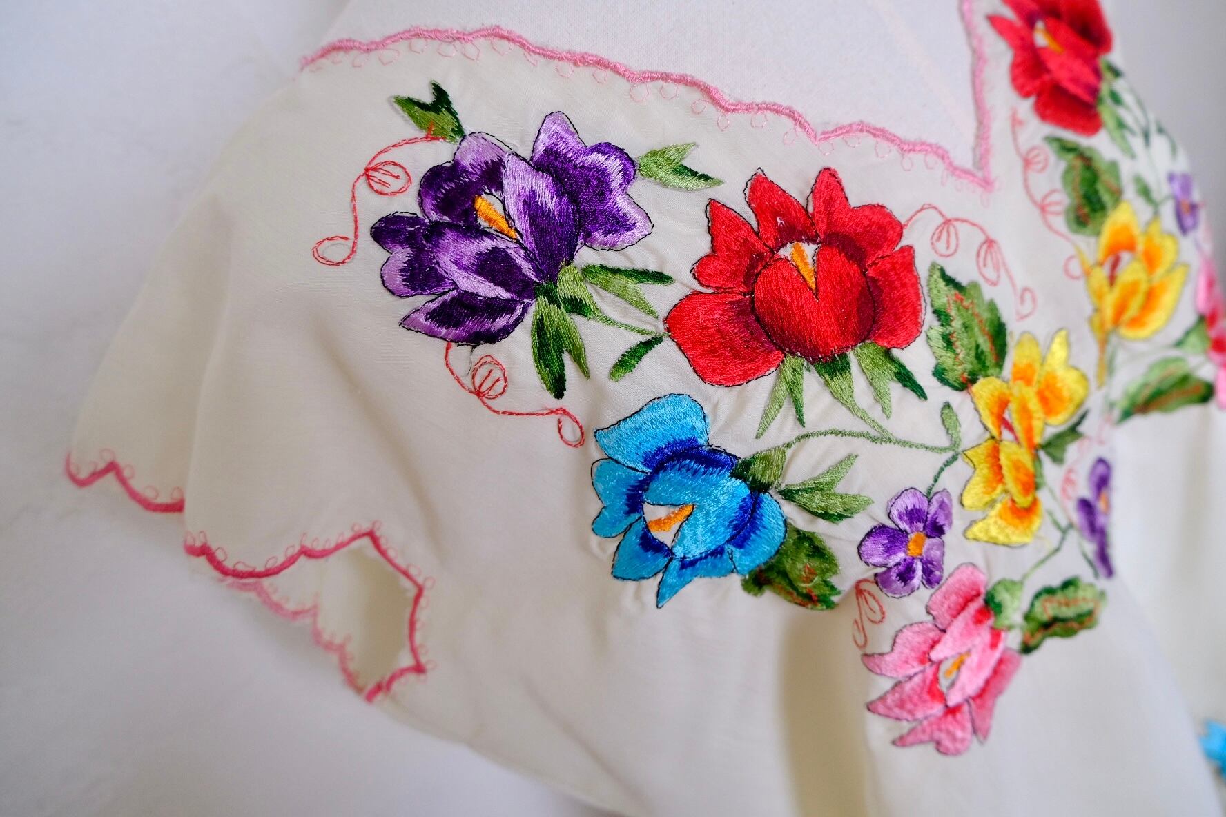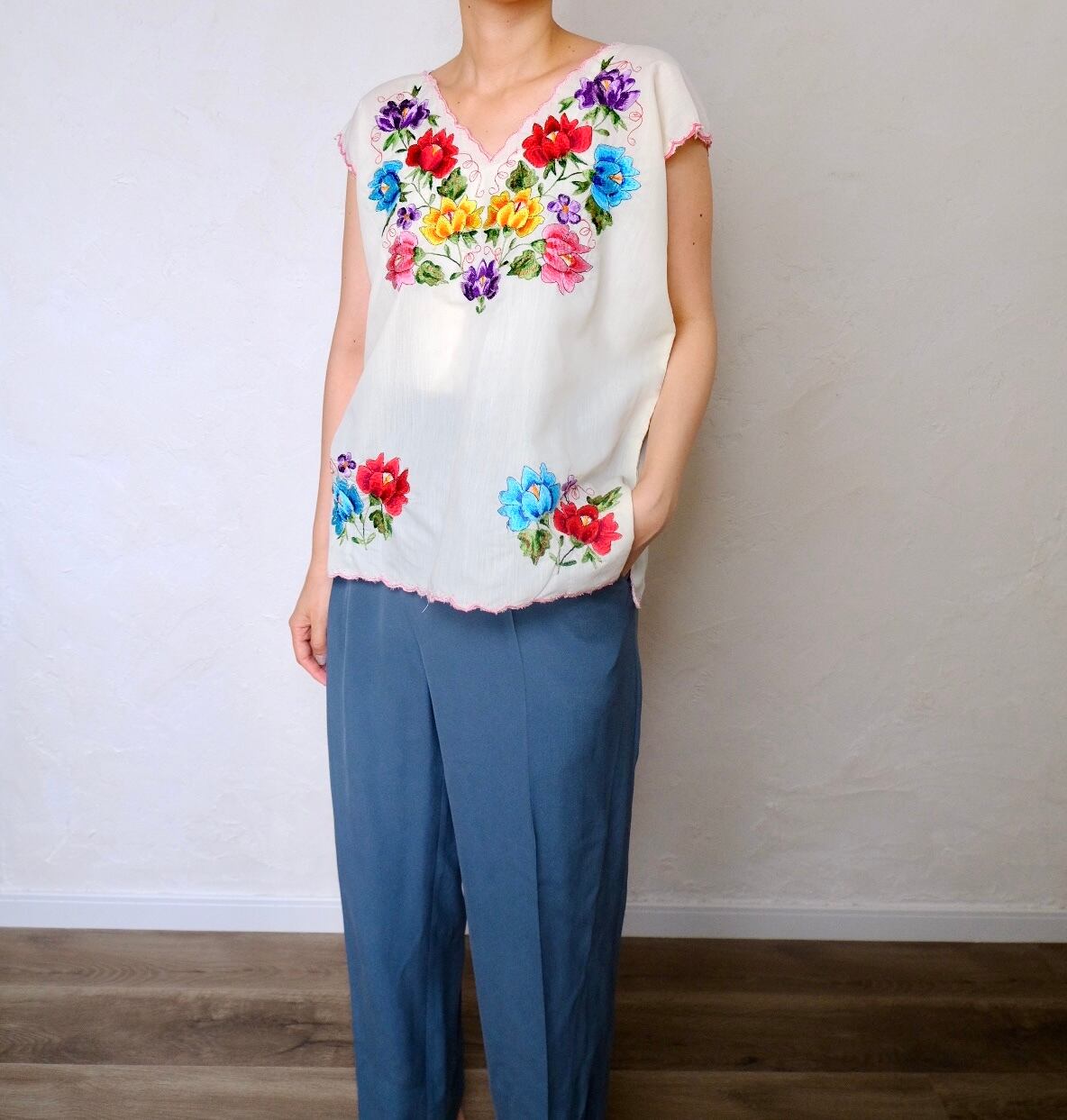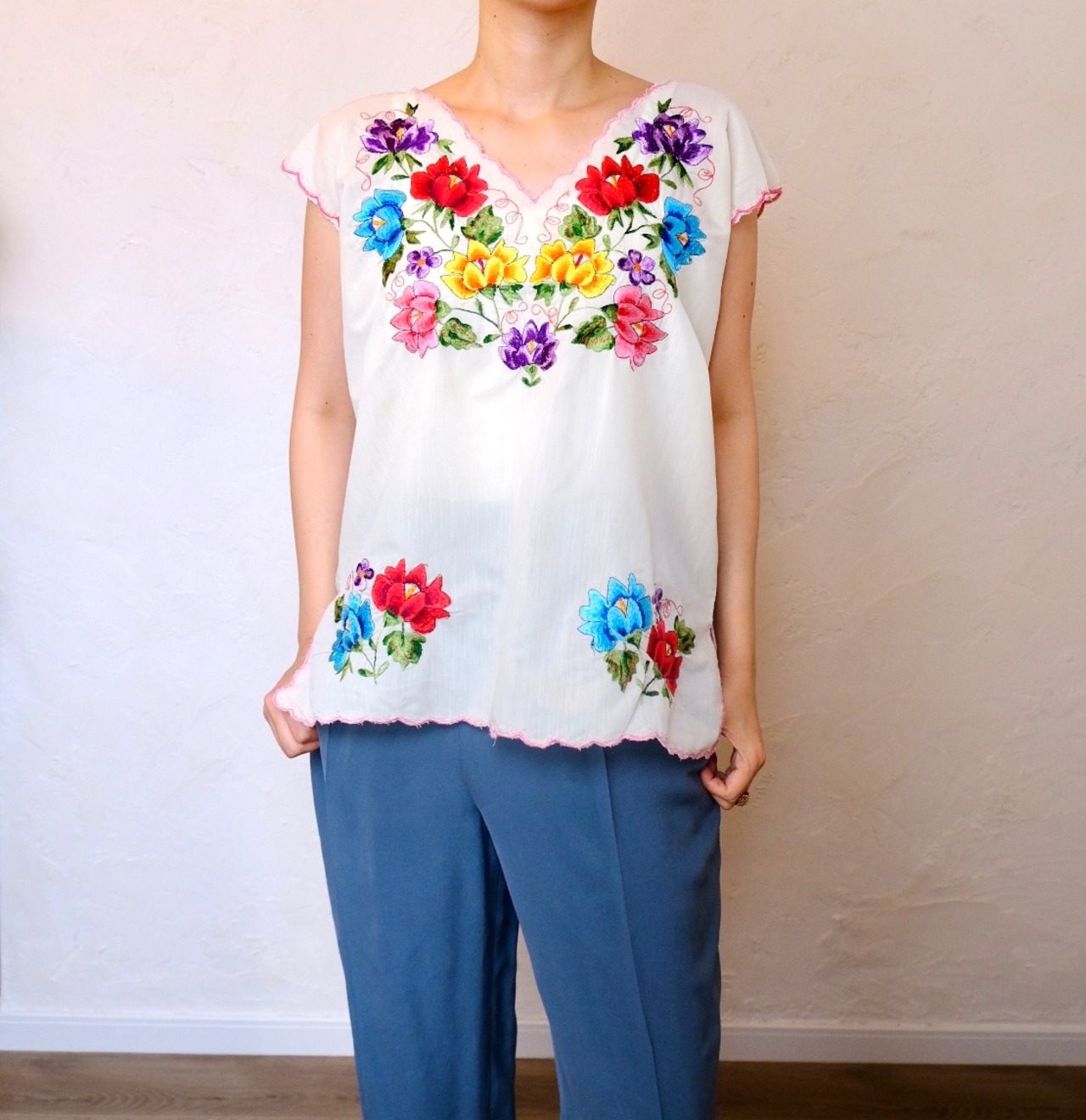 とても華やかで、目を惹きつけるメキシコの花刺繍のブラウス。