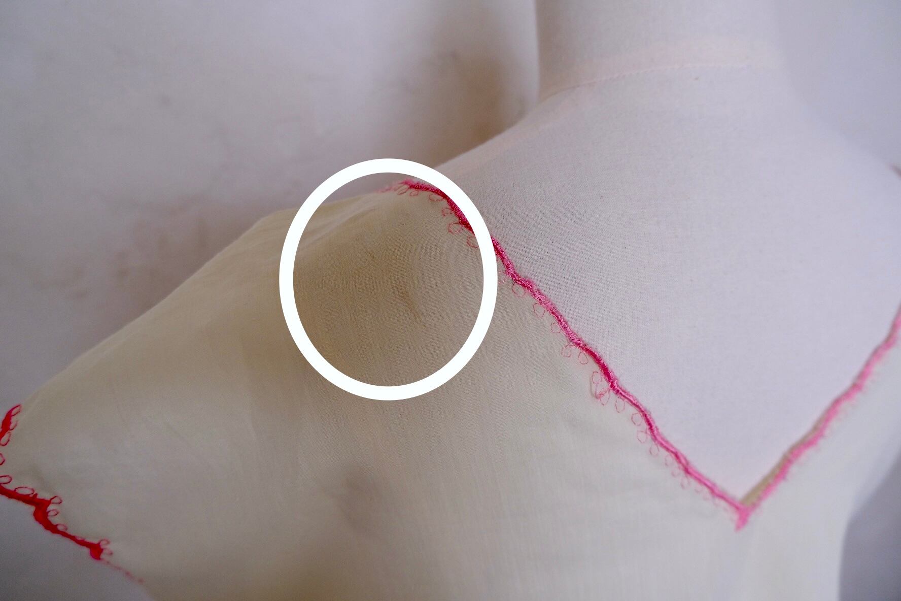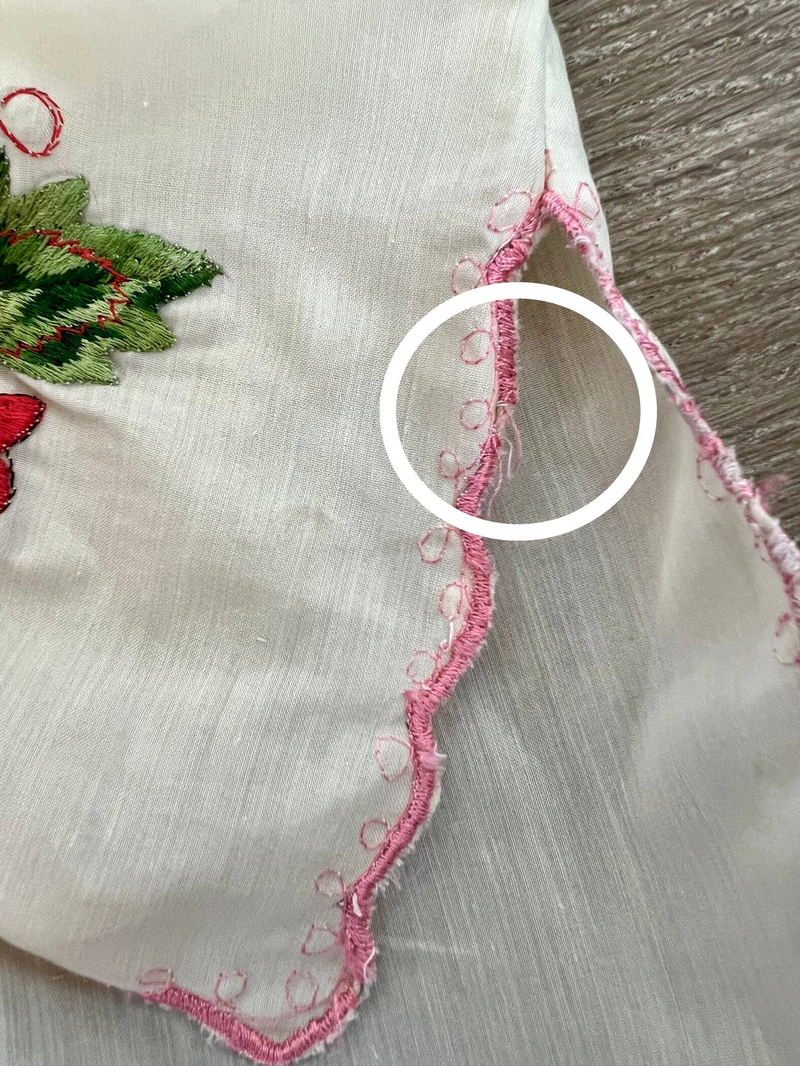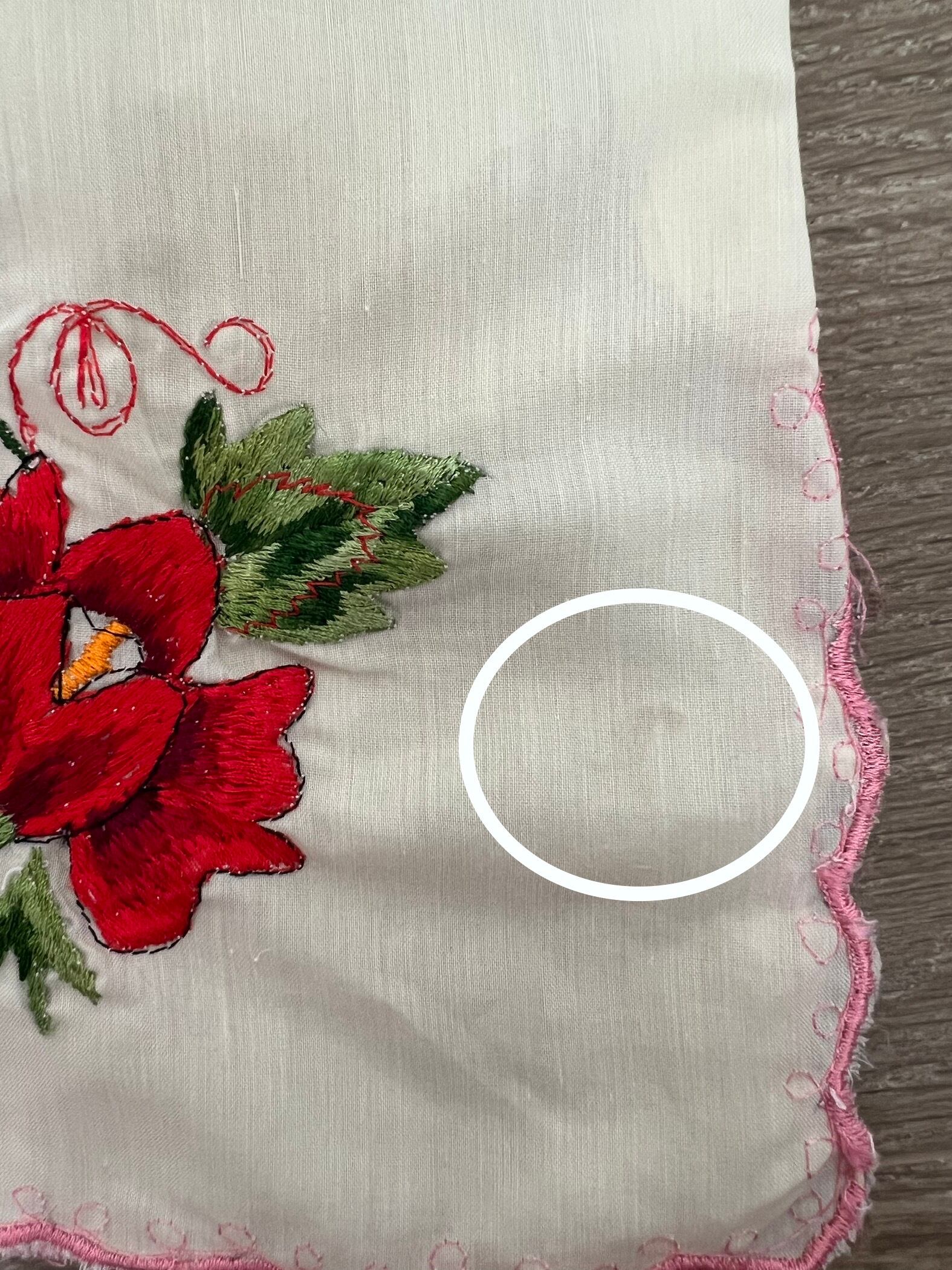 あたりに薄いシミがございます。フロント刺繍部分、左刺繍部分に薄い黒いボールペンの様な汚れがございます。