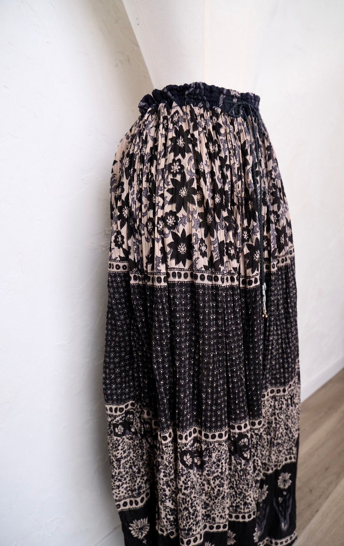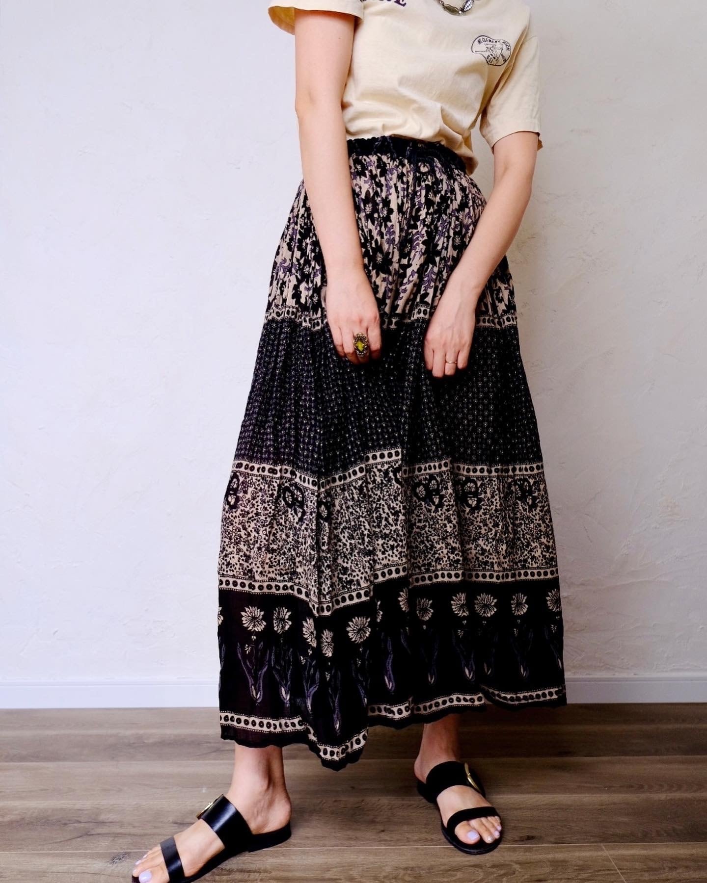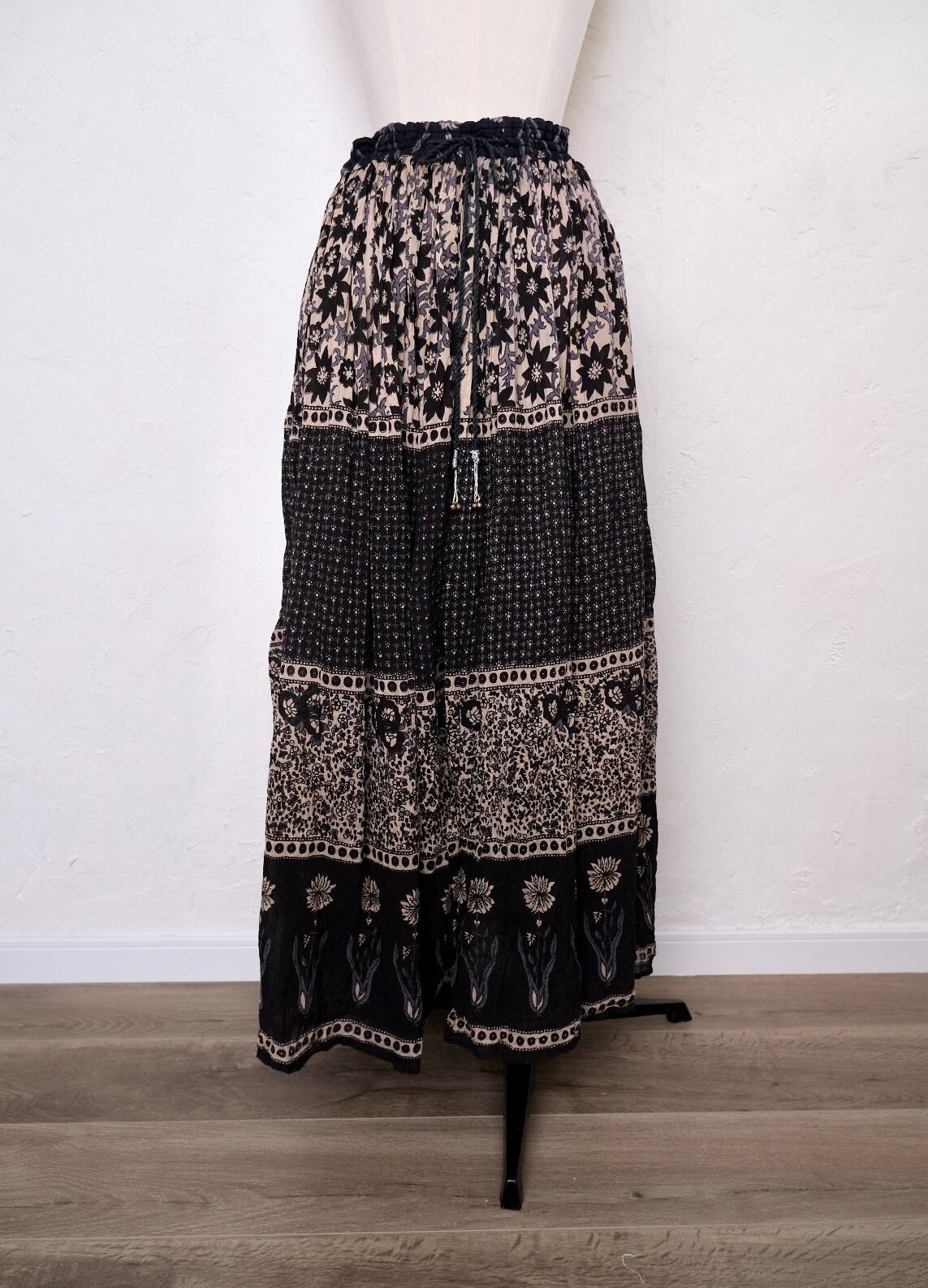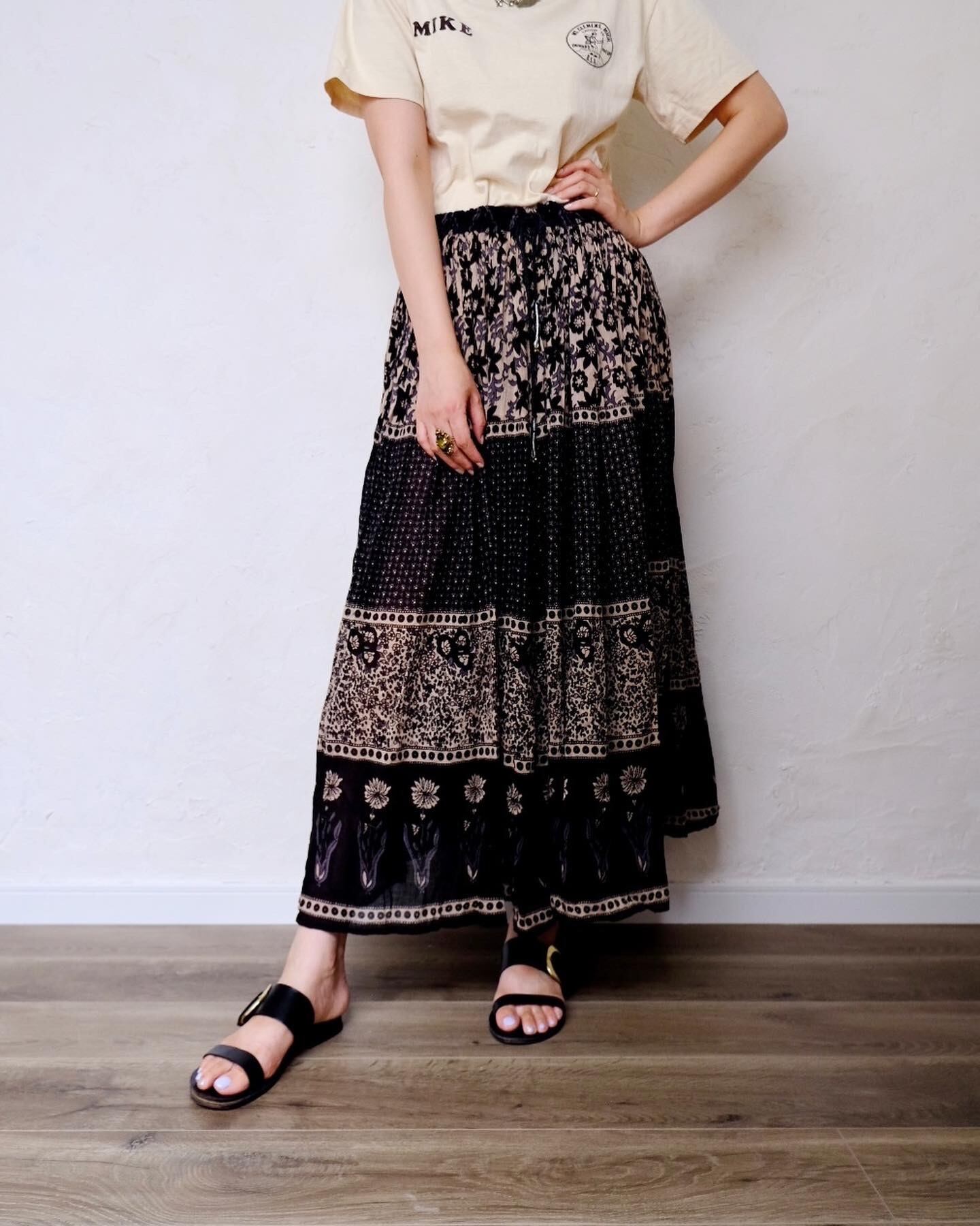 ブラックとベージュベースの落ちついた雰囲気のエスニックフラワーマキシスカート。