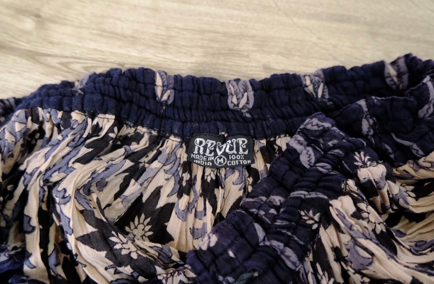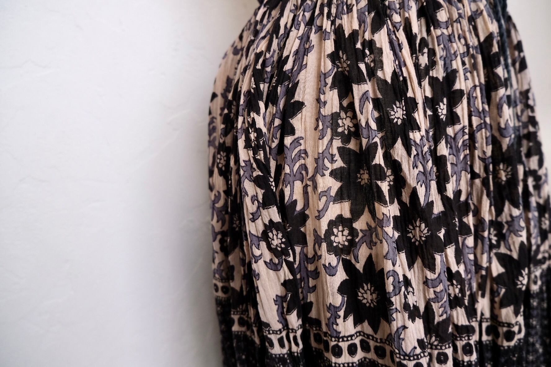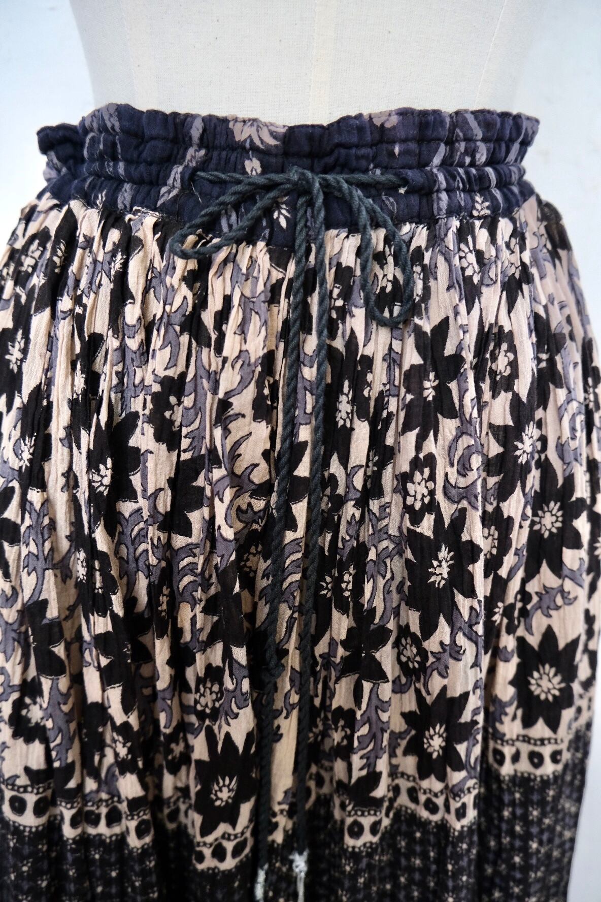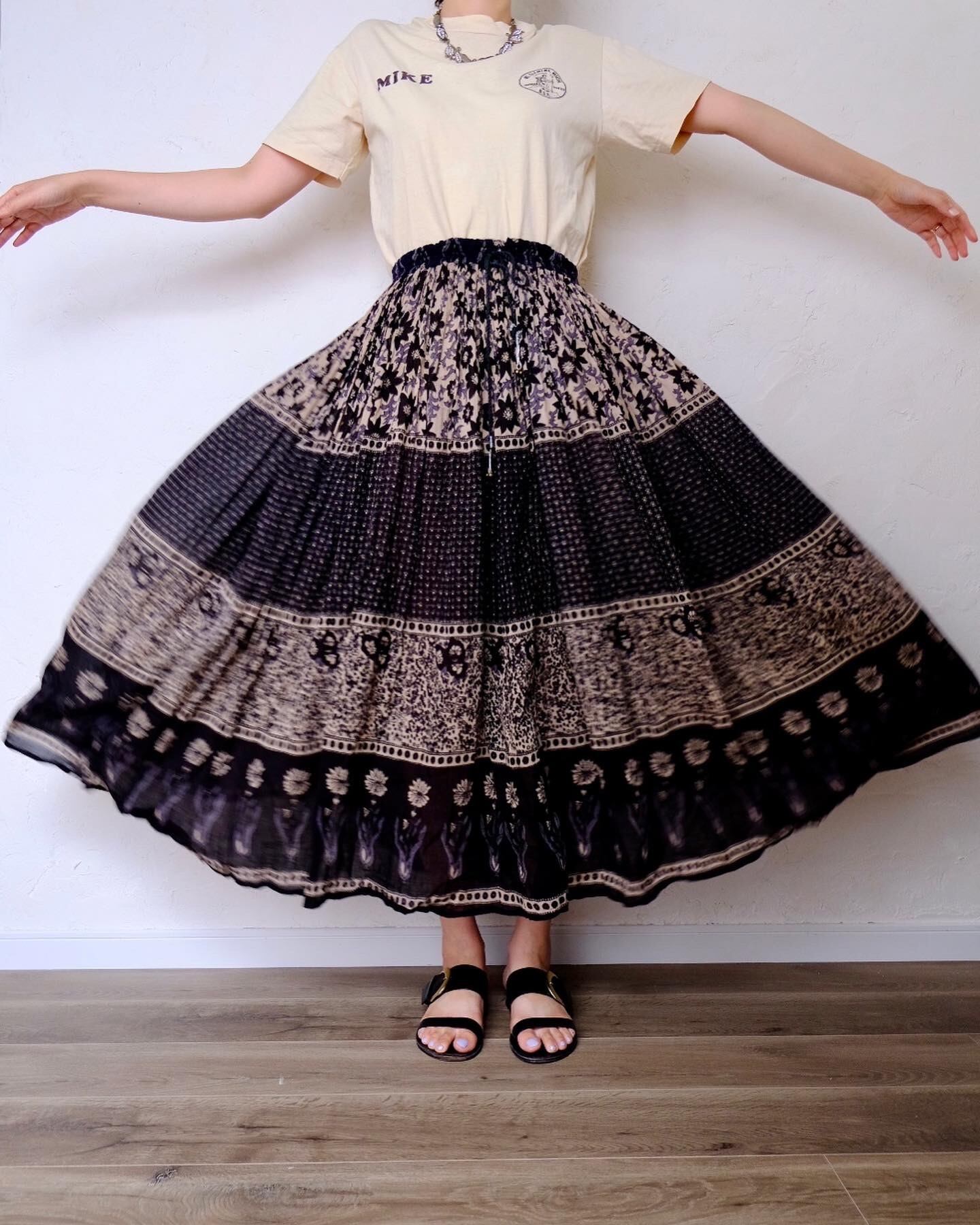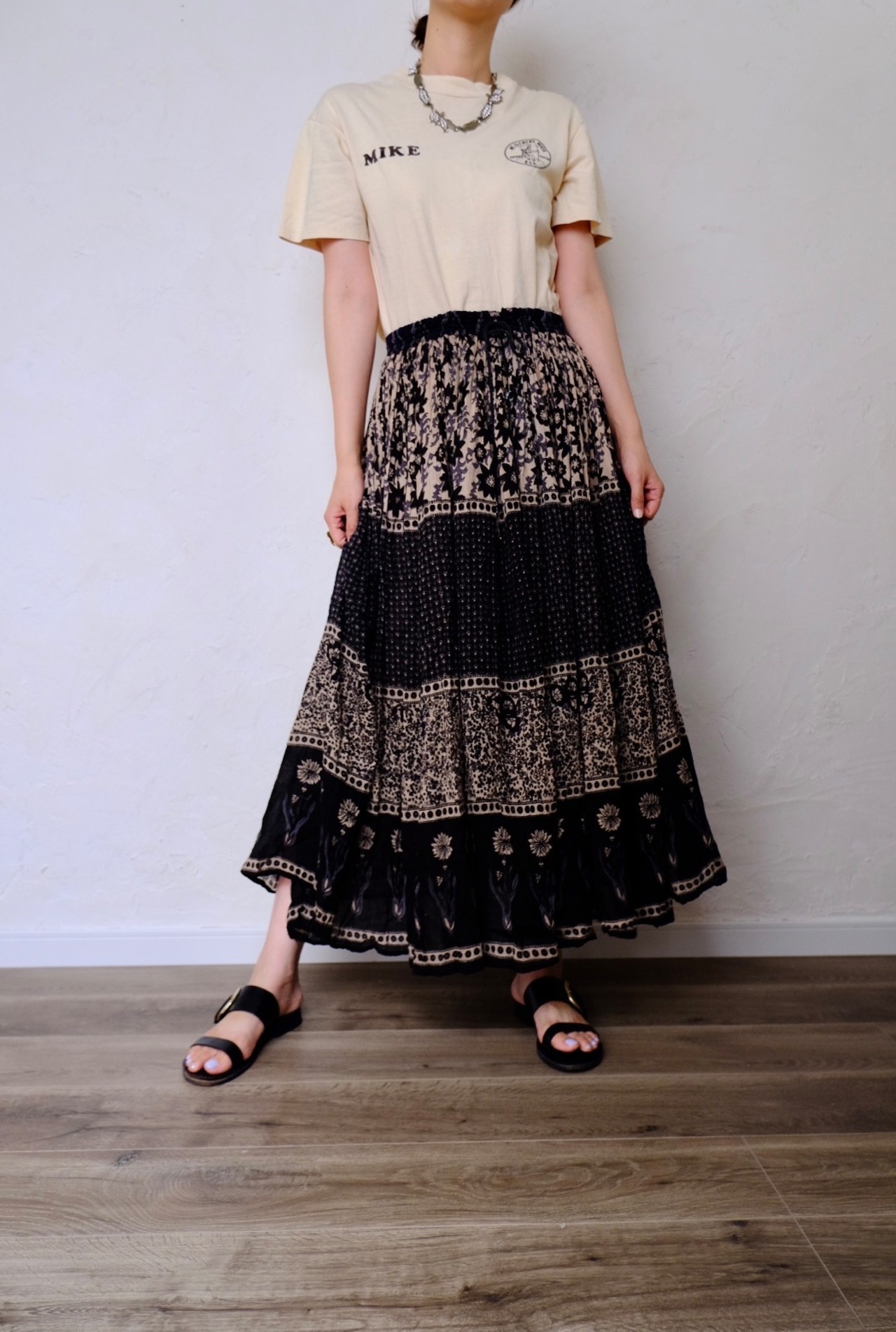 ブラックとベージュベースの落ちついた雰囲気のエスニックフラワーマキシスカート。