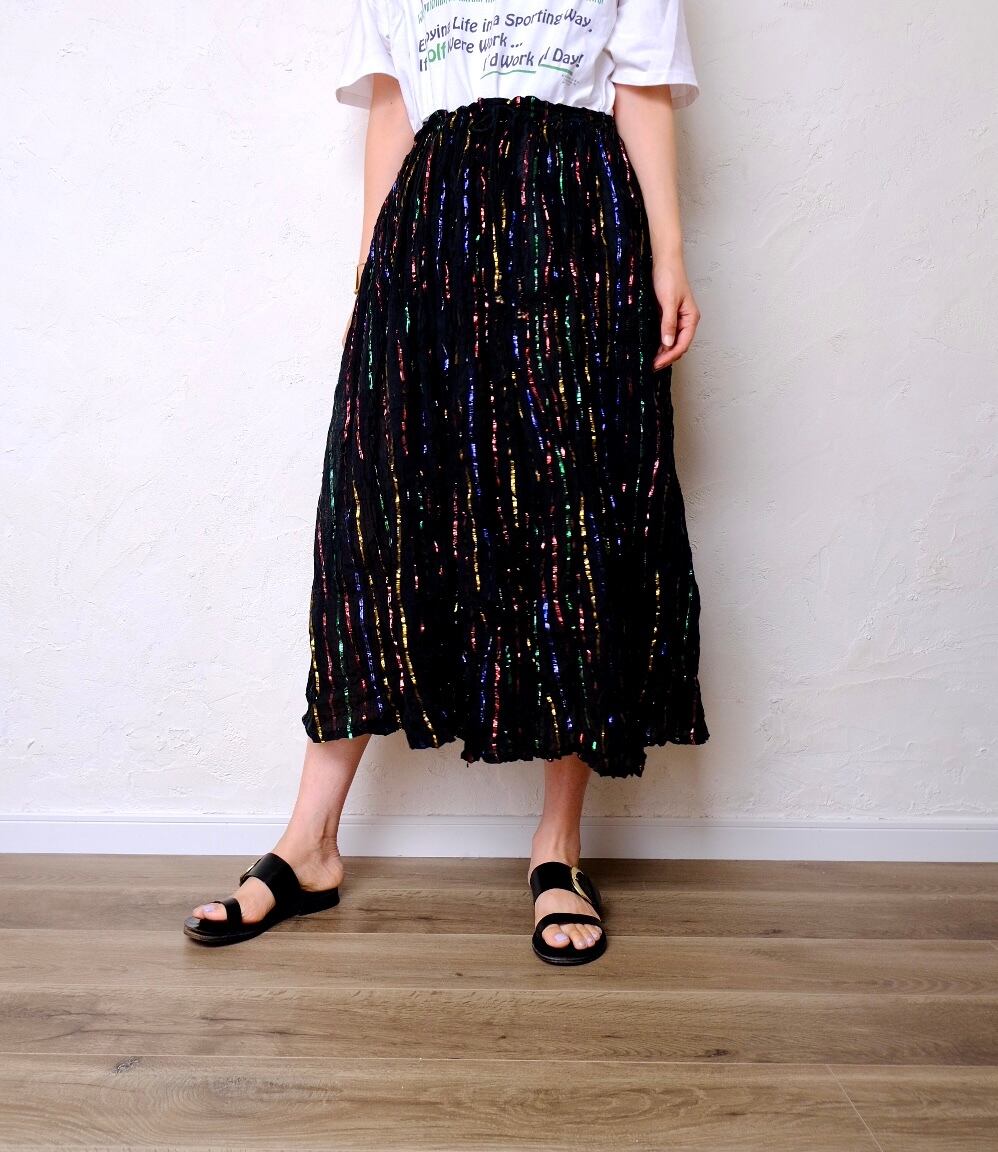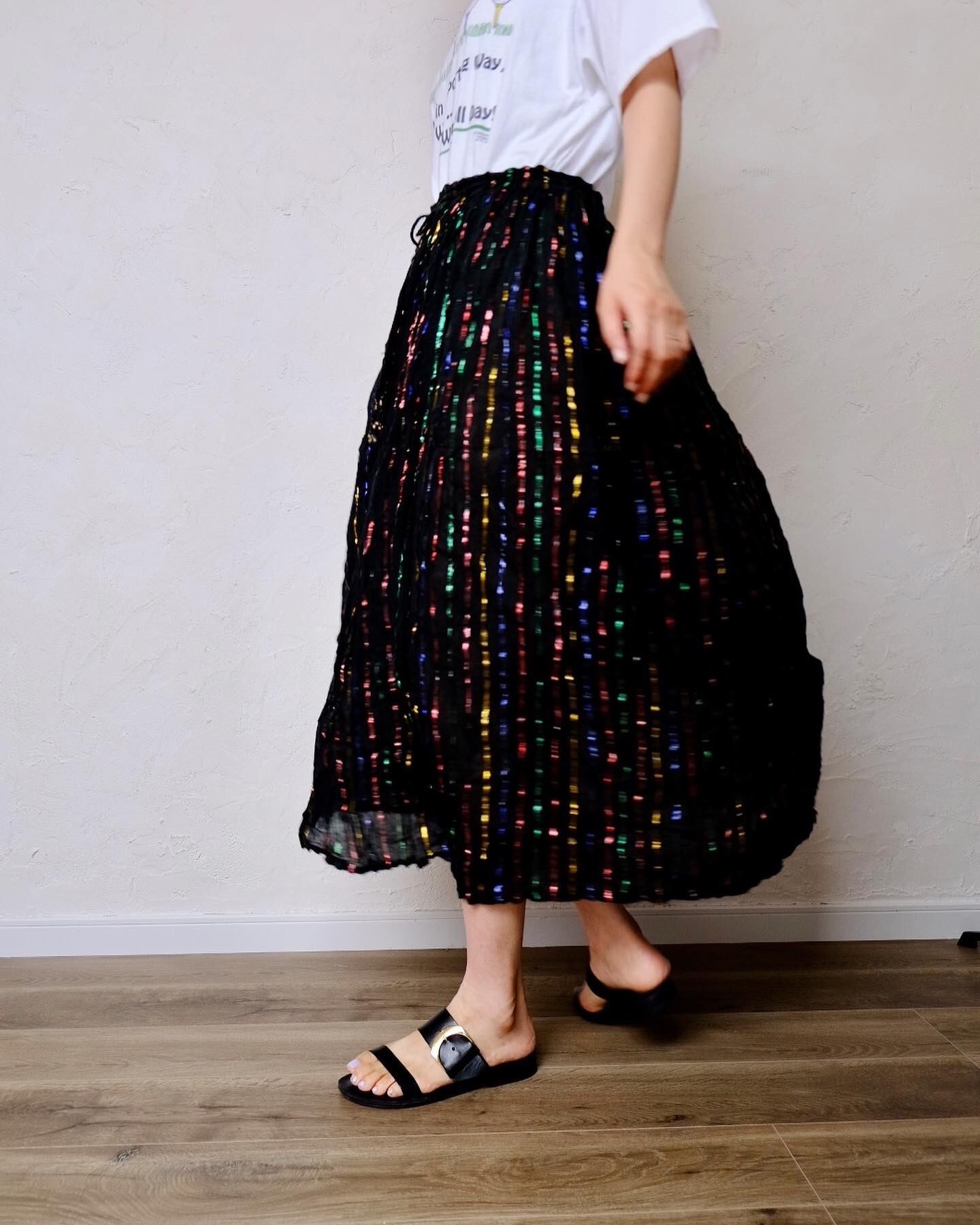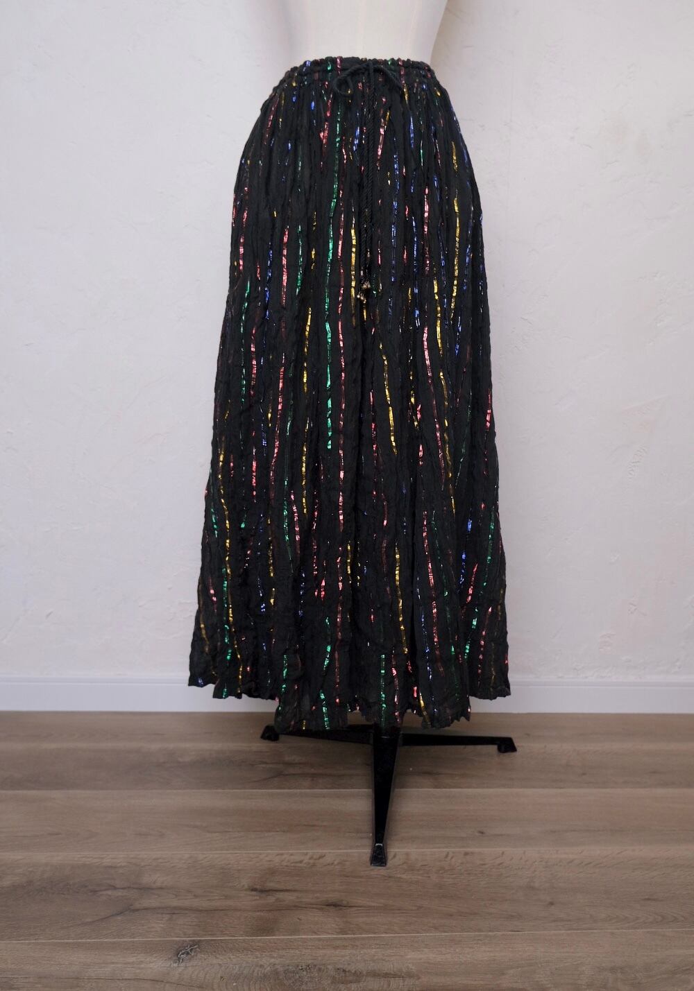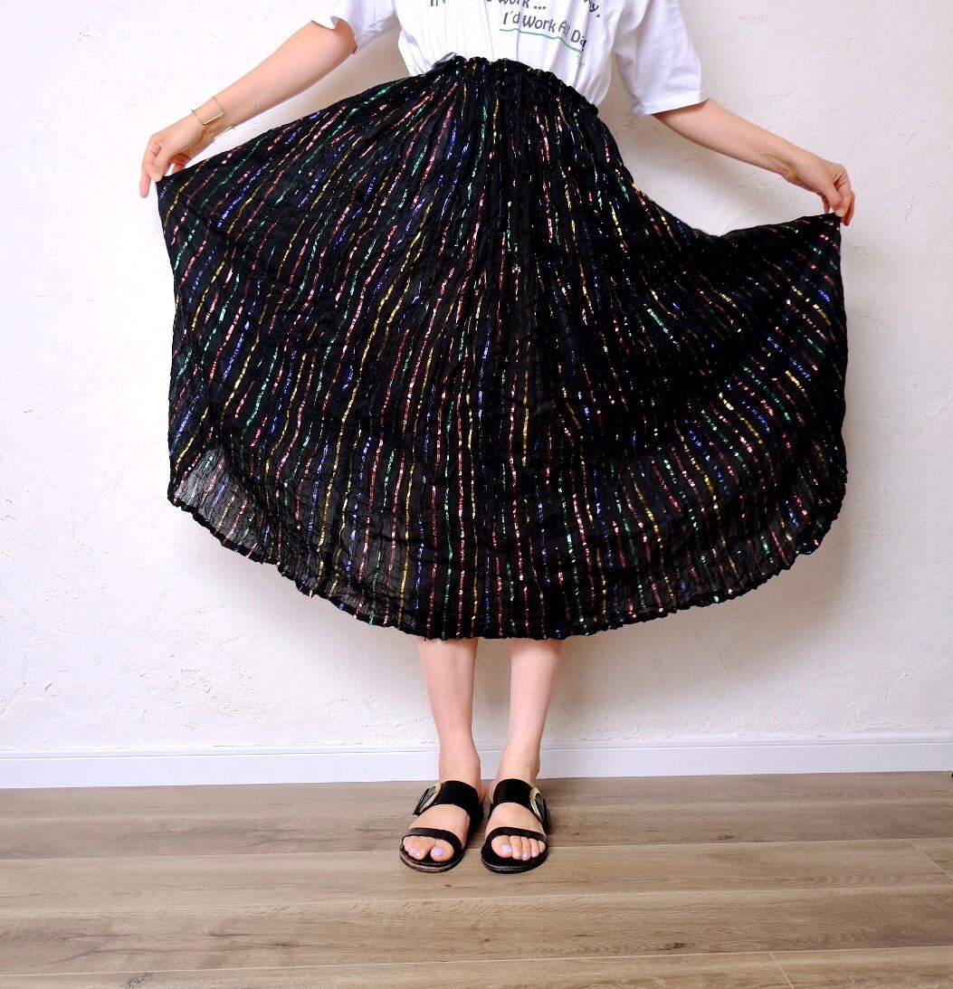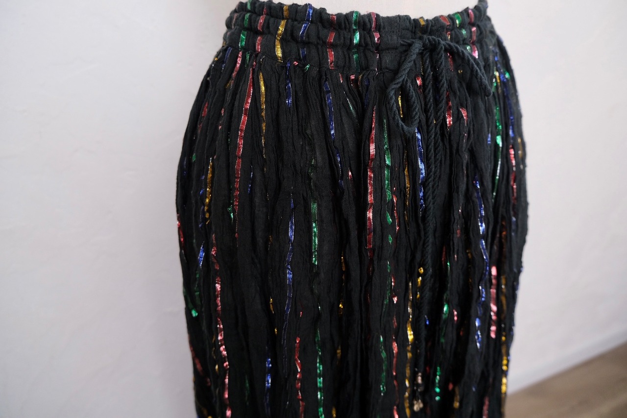 ブラックにマルチカラーのラメストライプがキラキラと、とっても可愛いインド綿スカート。