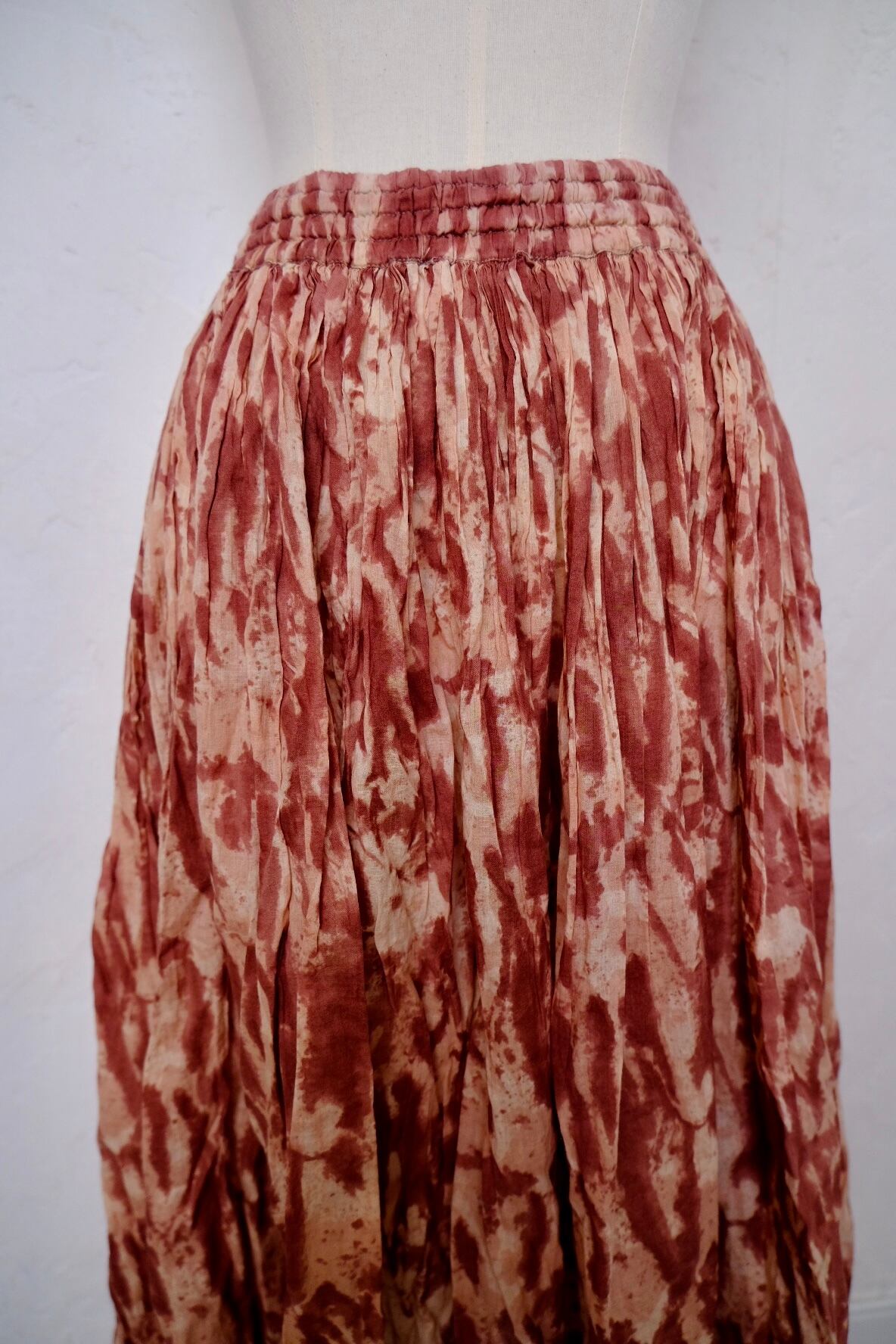 ピンクとブラウンのような絶妙なカラーのタイダイ染めスカート。