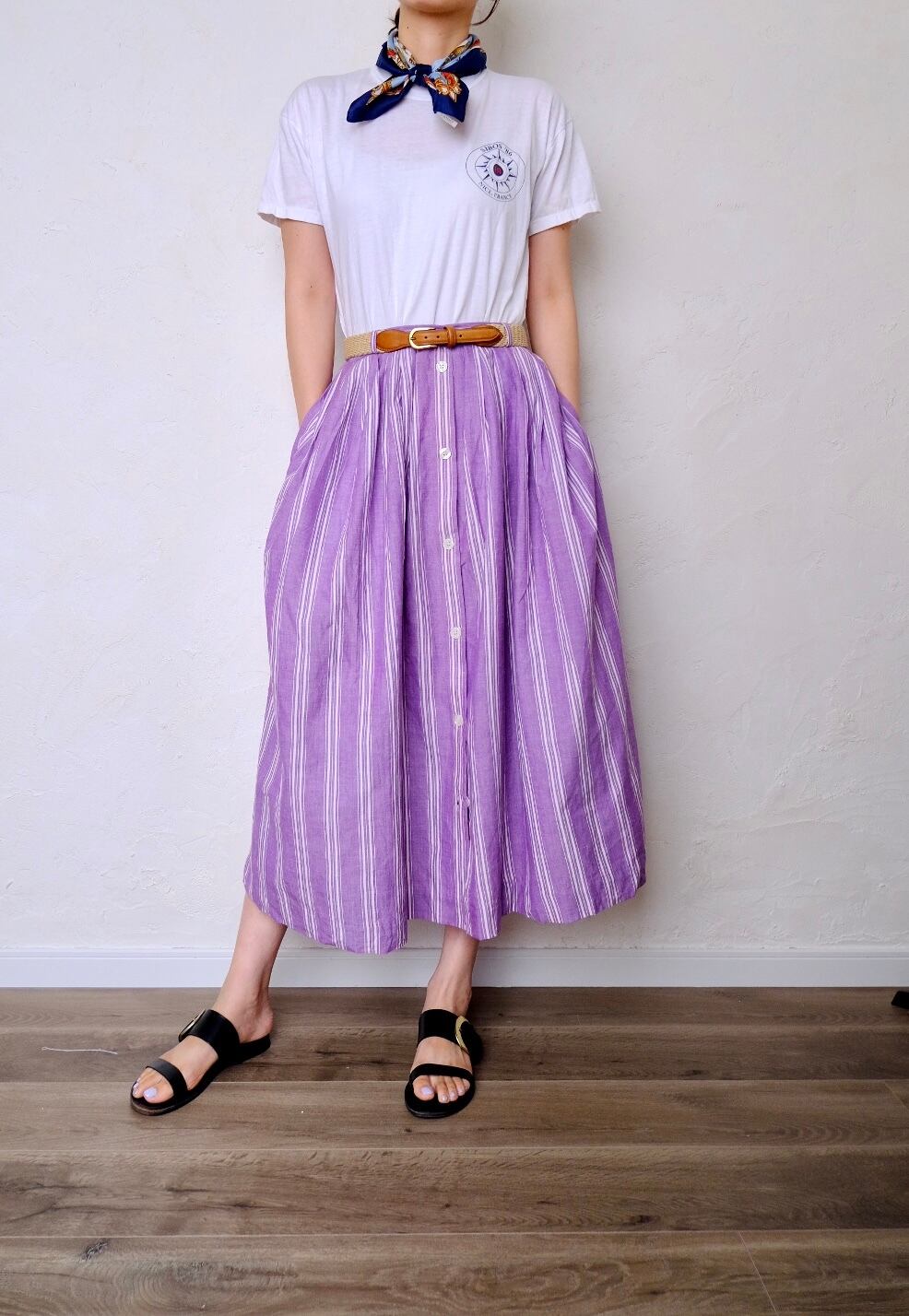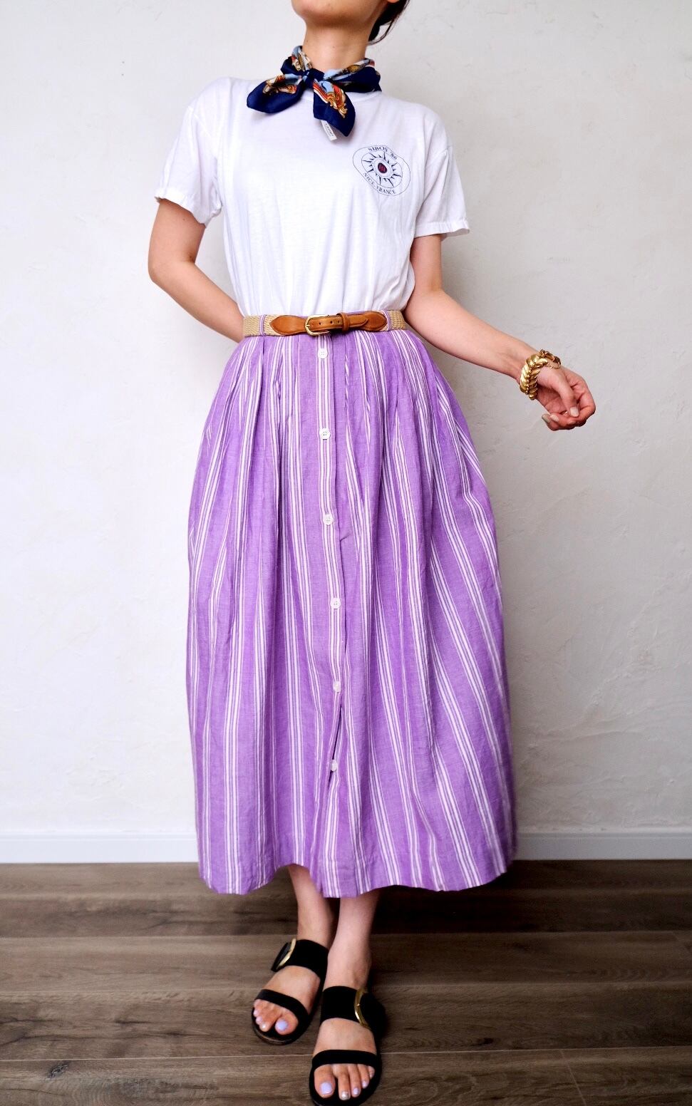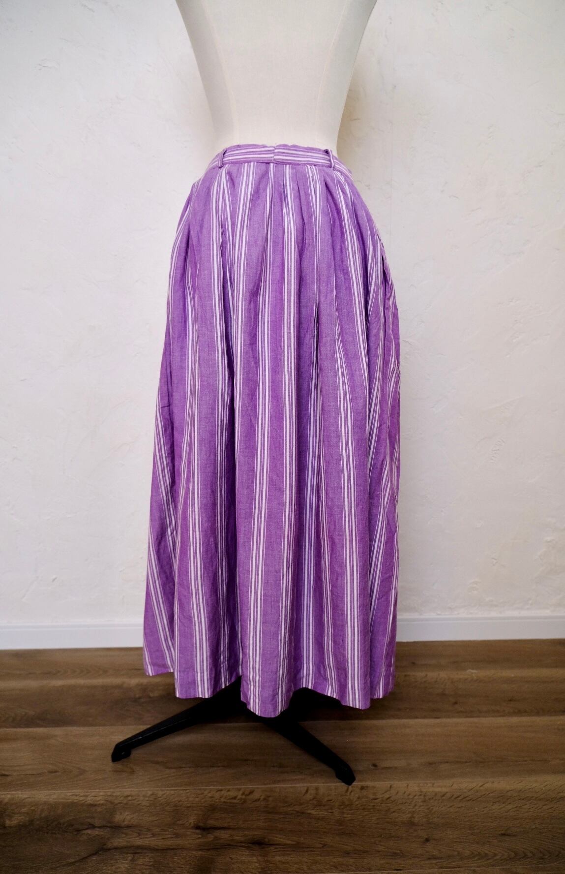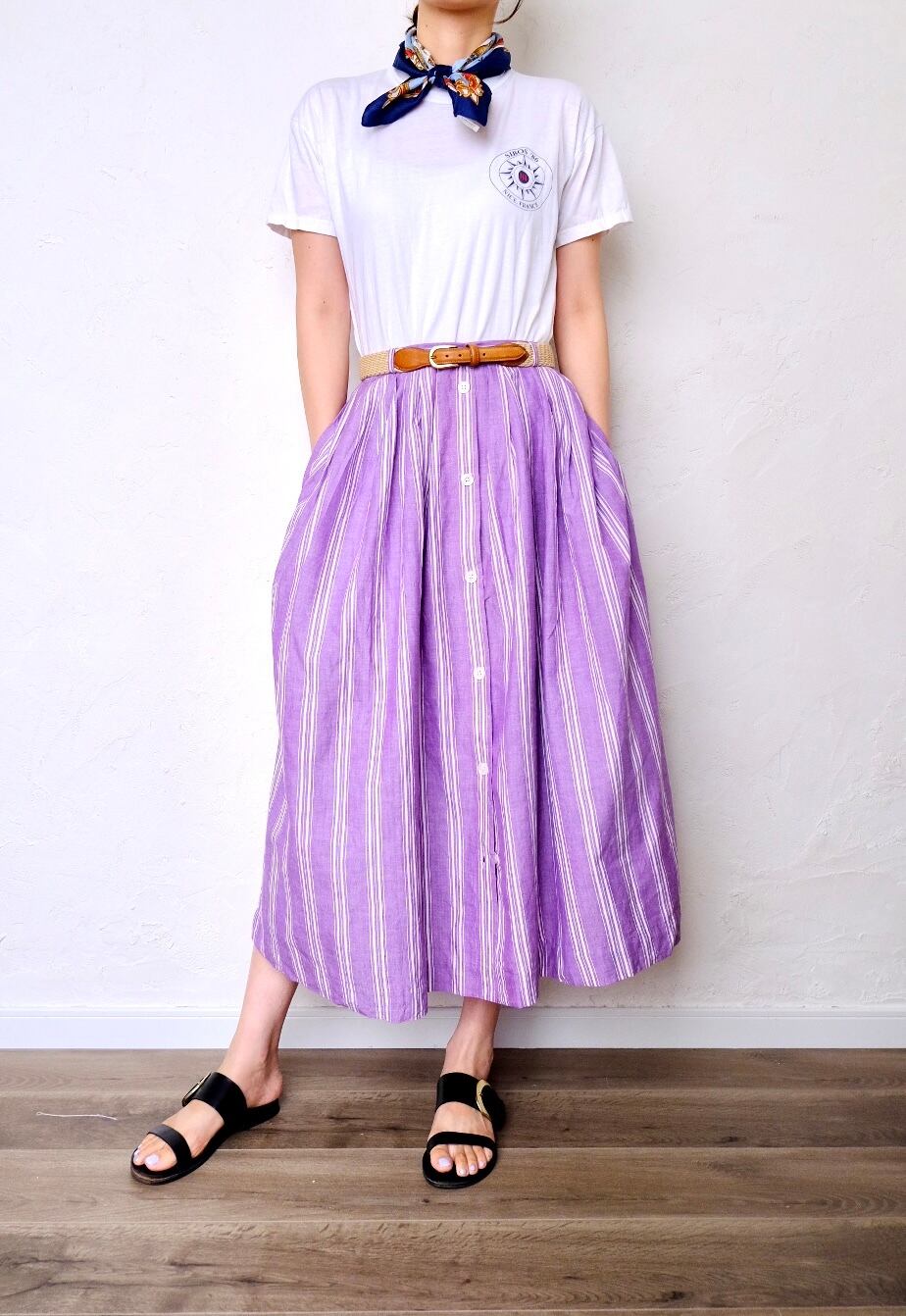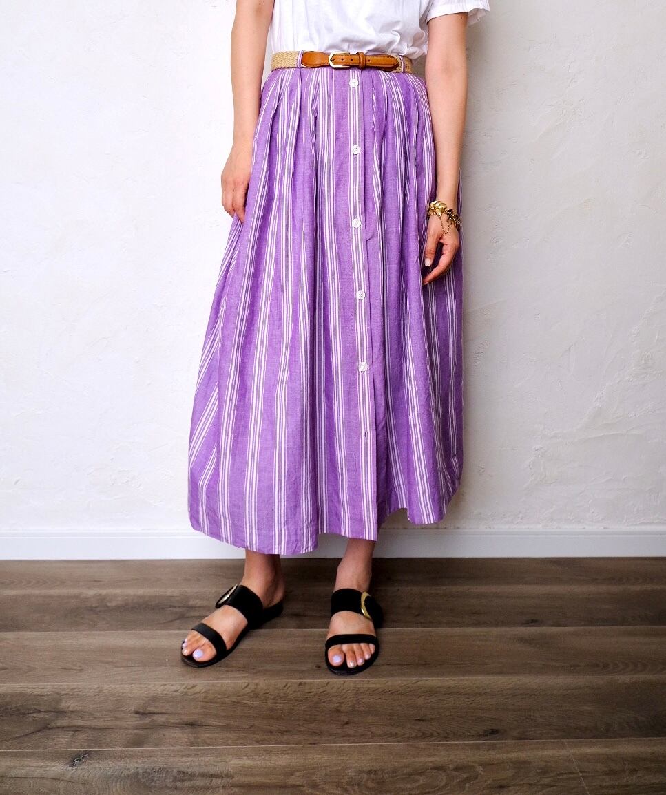 パープルにホワイトのストライプがナチュラルで爽やかなロングスカート。