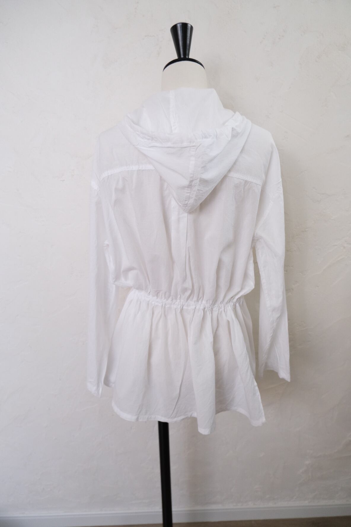 さりげない花の刺繍が入ったフード付きのシャツアウターです。