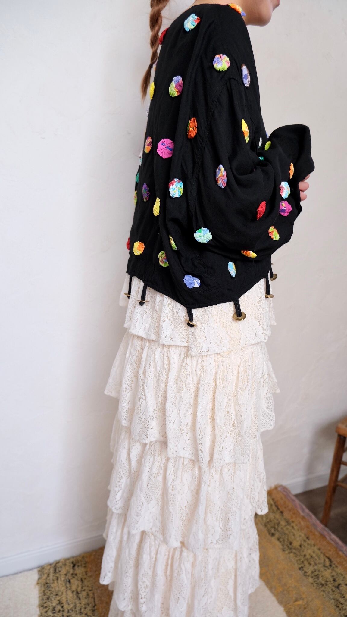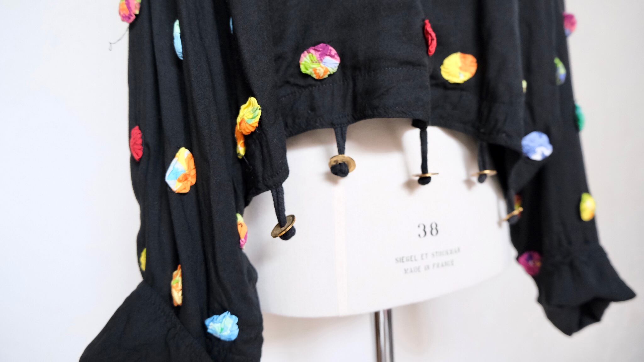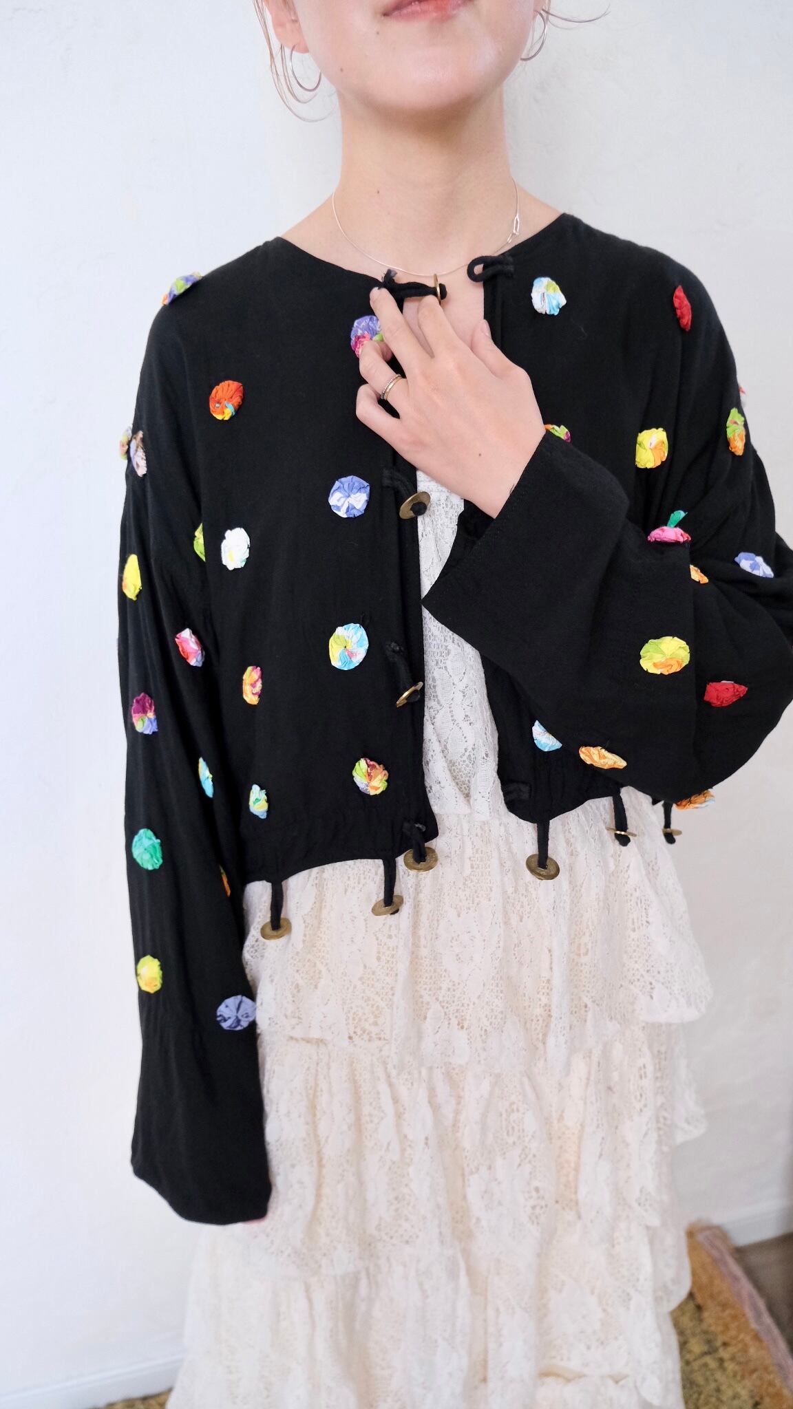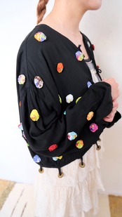 ボタンや裾のゆれる飾りに、コインが使われていて、個性的です。