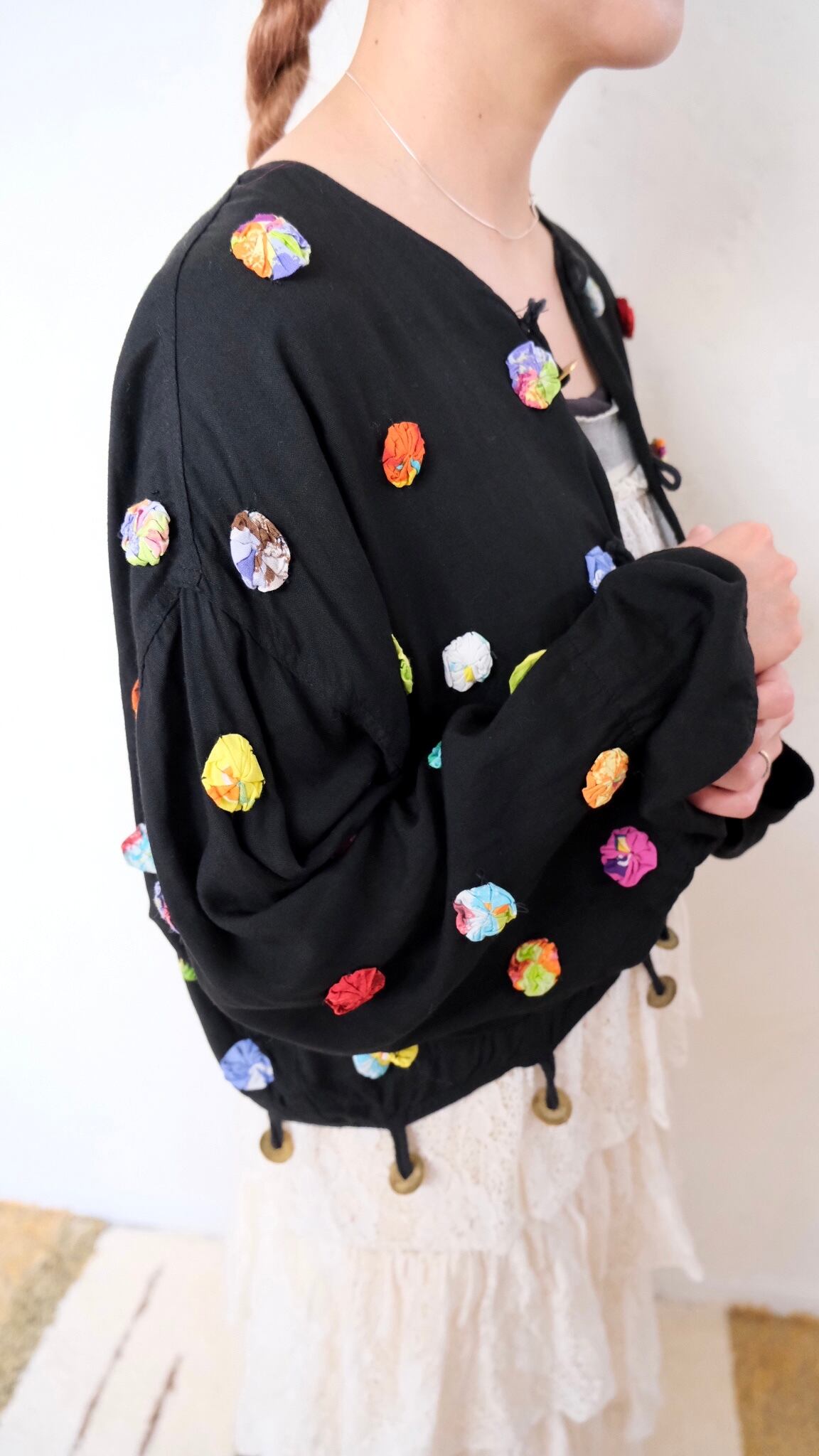 ヨーヨーキルトはナチュラルな印象になりがちですが、こちらはブラックベースにゴールドコインと遊び心のある大人な印象です。
