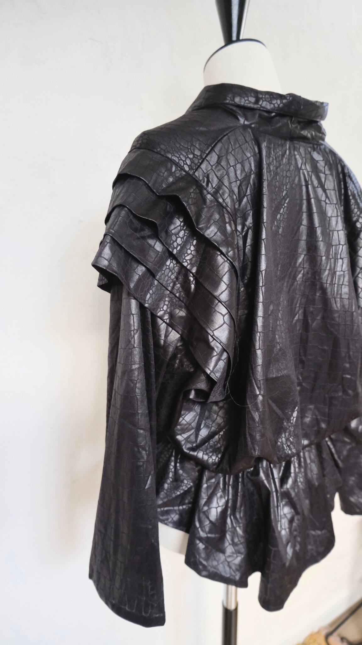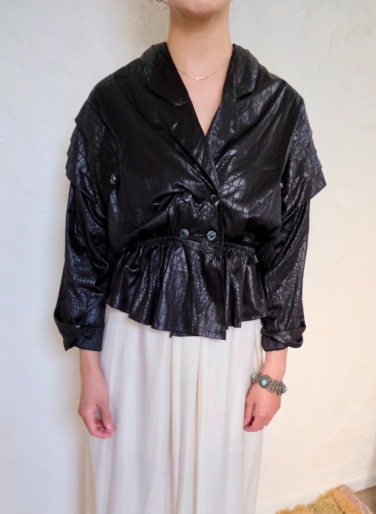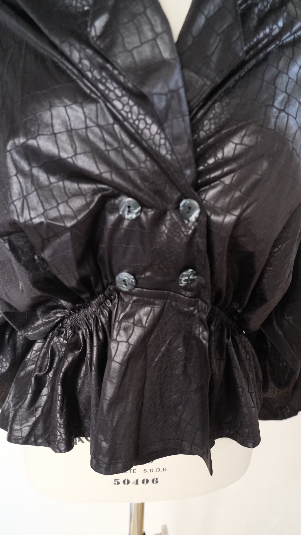 ペプラムのデザインが可愛く、レザーライクの甘辛なバランスが抜群の一枚。