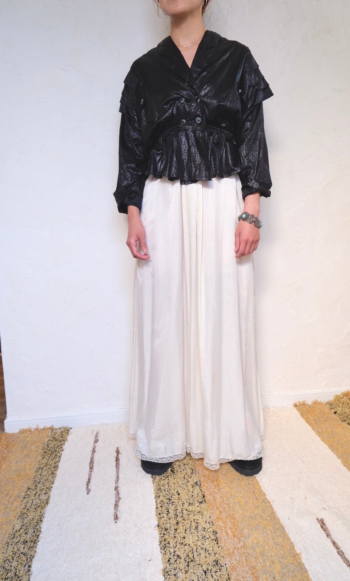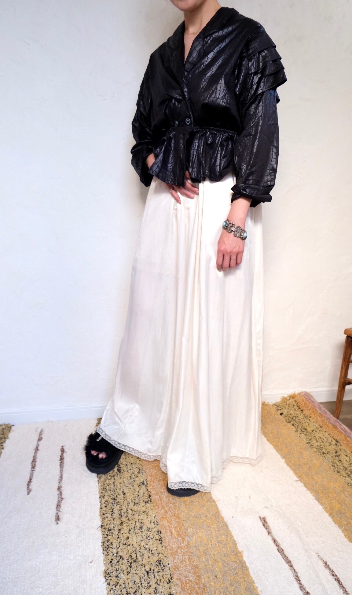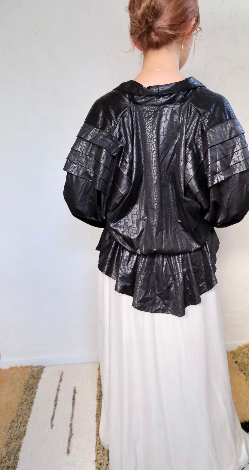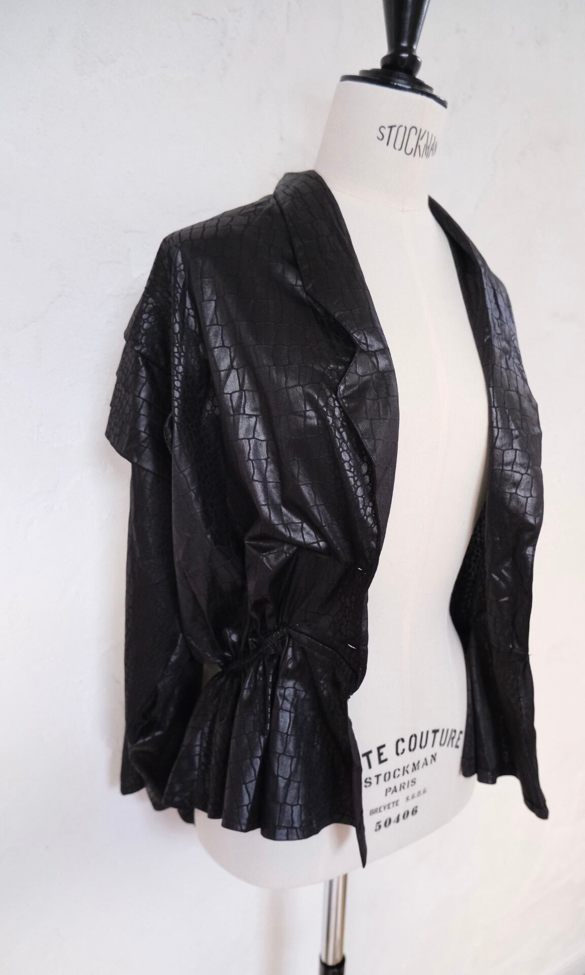 ペプラムのデザインが可愛く、レザーライクの甘辛なバランスが抜群の一枚。