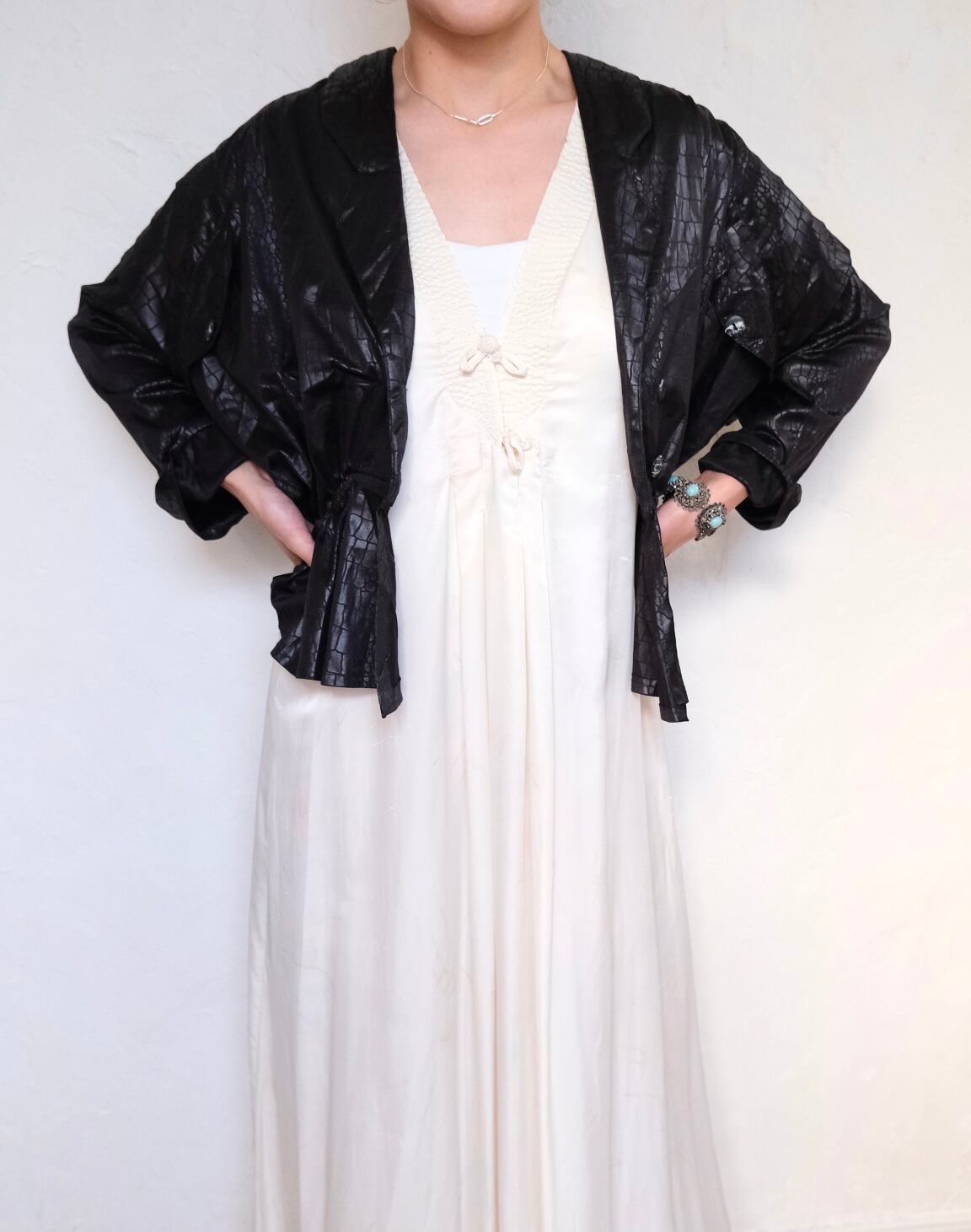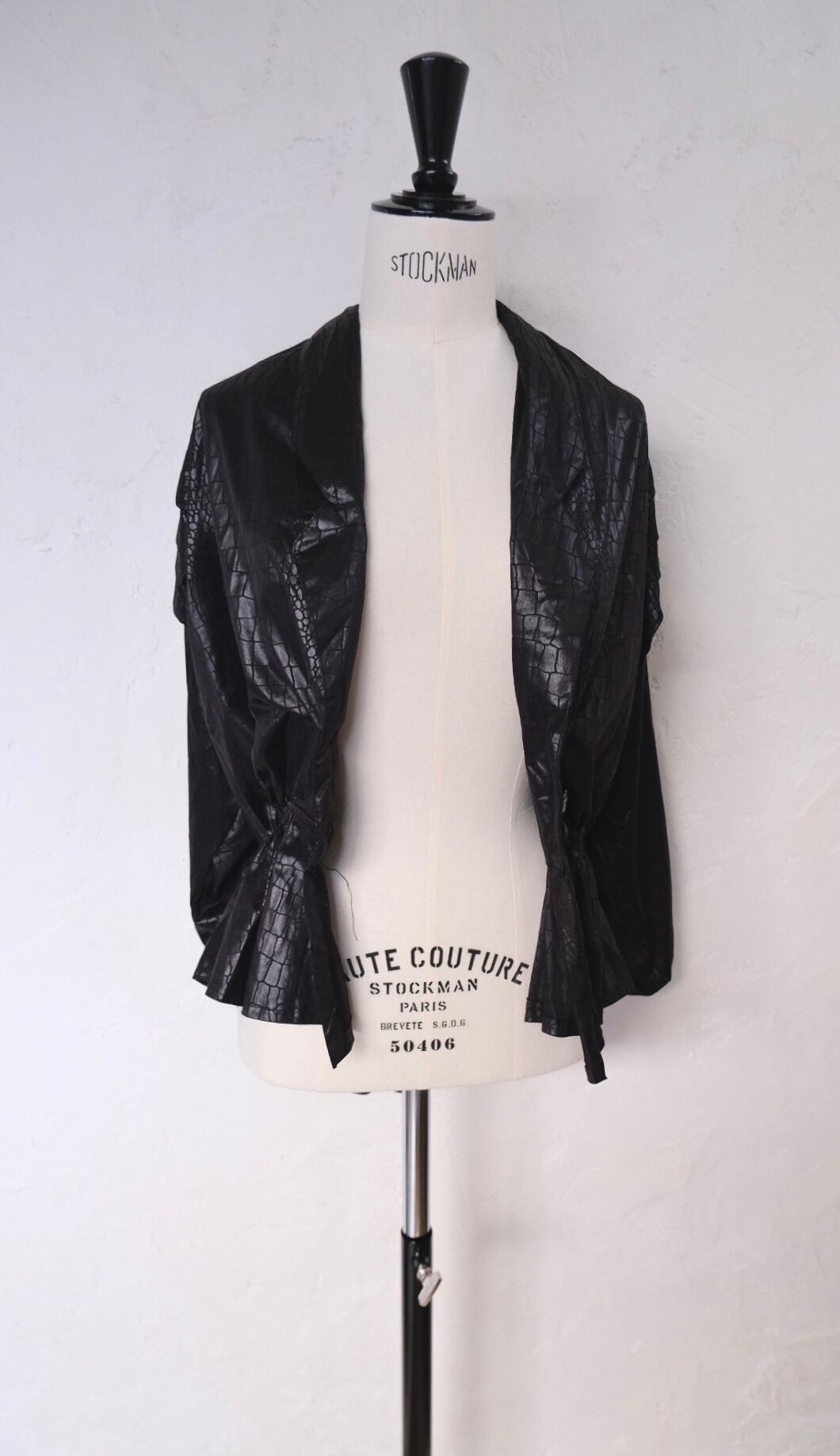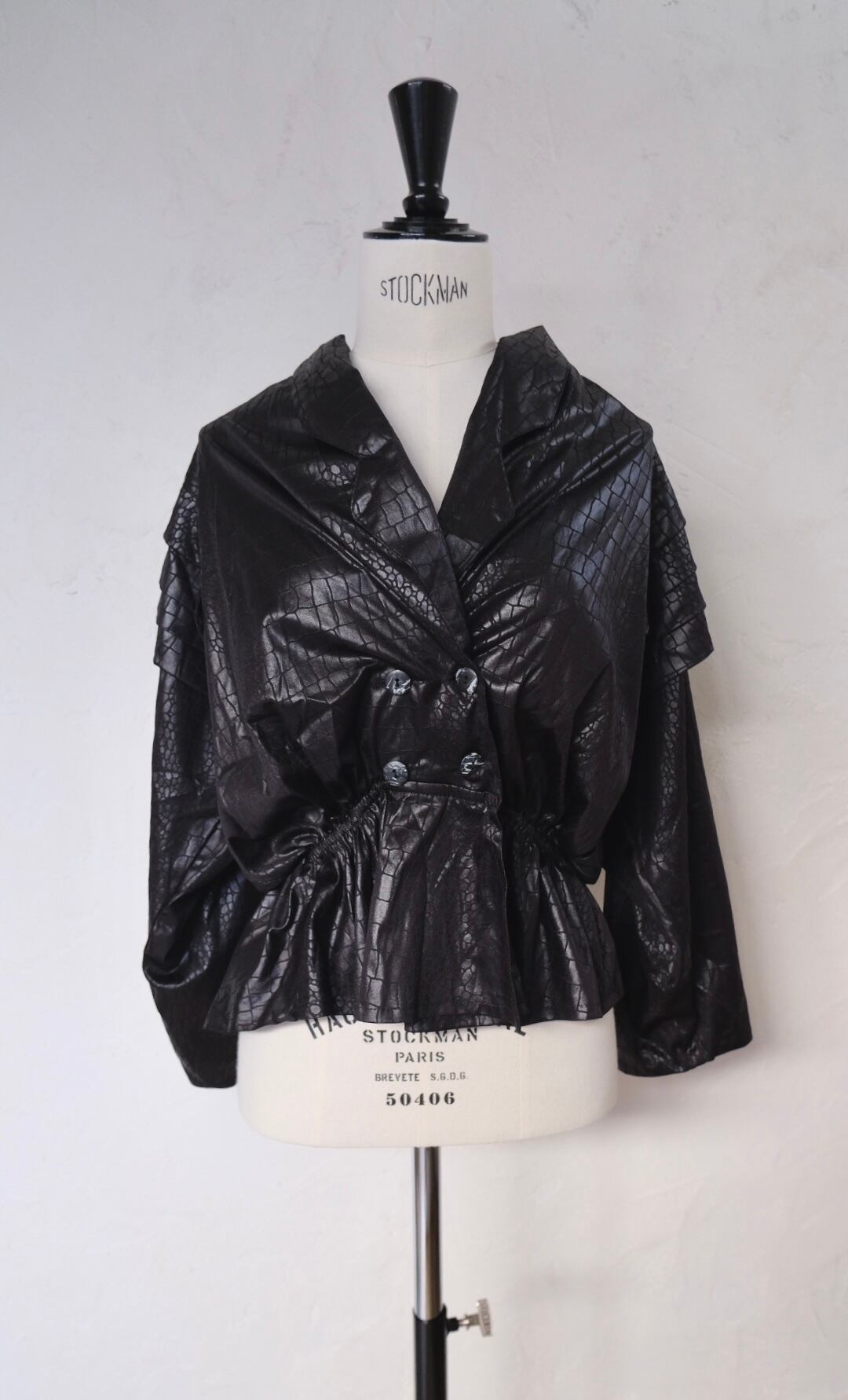 型押しレザーの加工がされた、ポリエステルの様なお素材のジャケット。