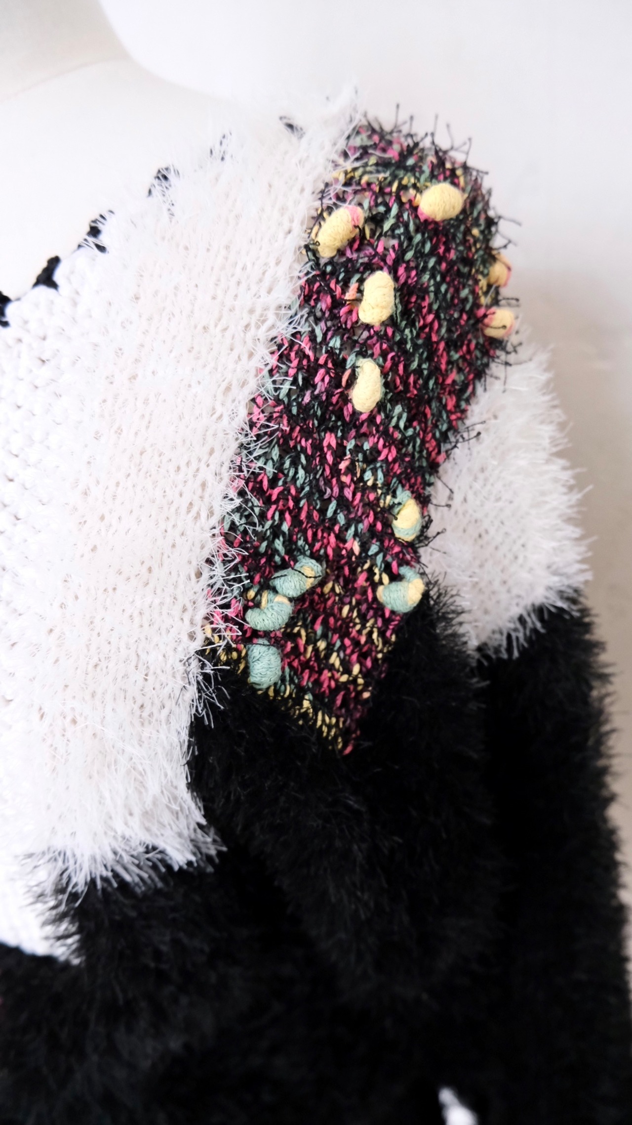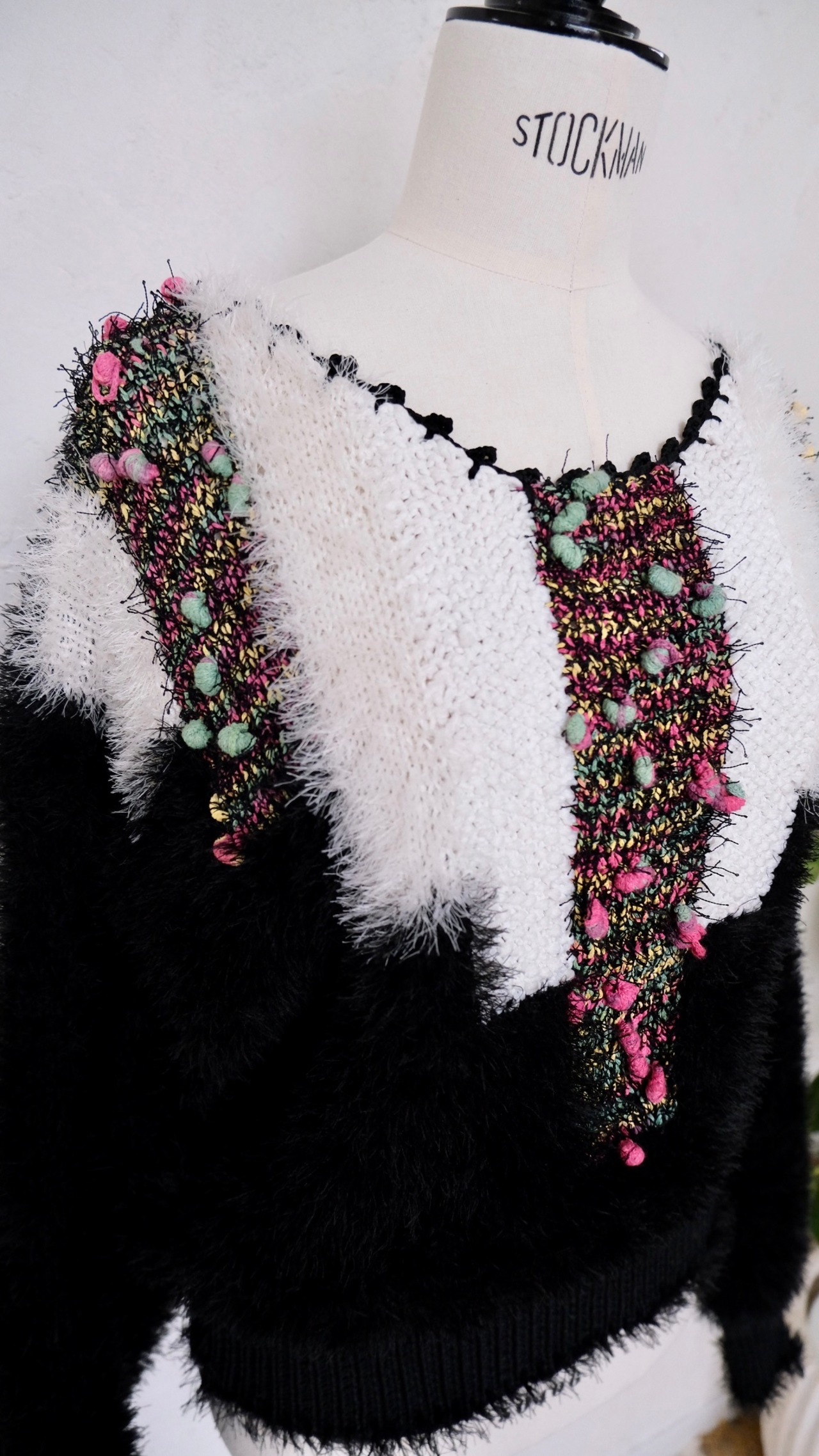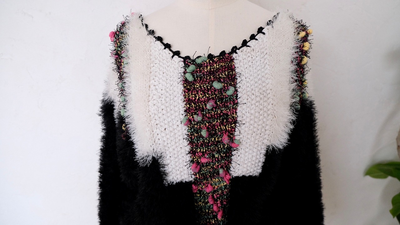 モノトーンベースにカラフルな糸やポンポンの装飾が大人で遊び心があります。