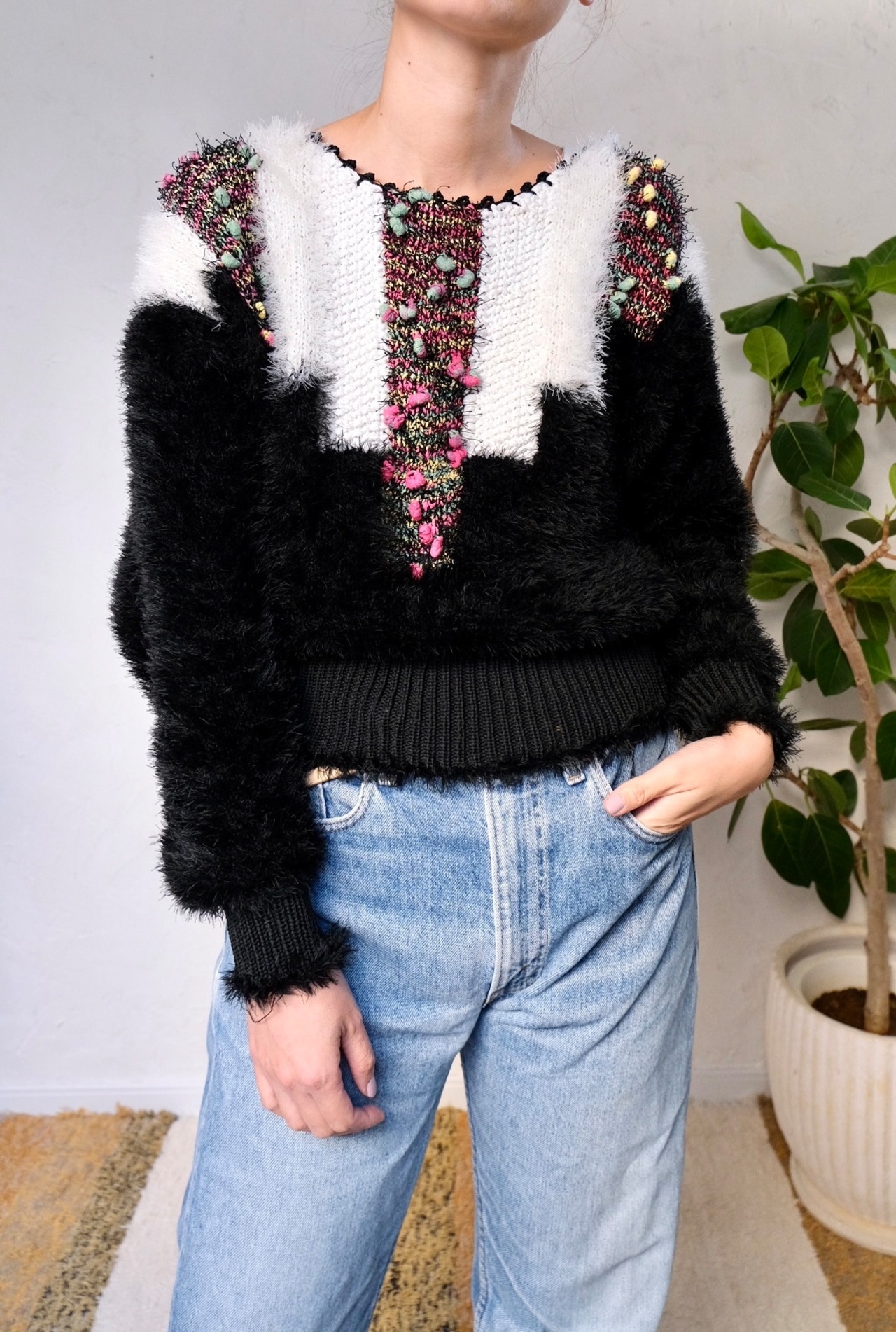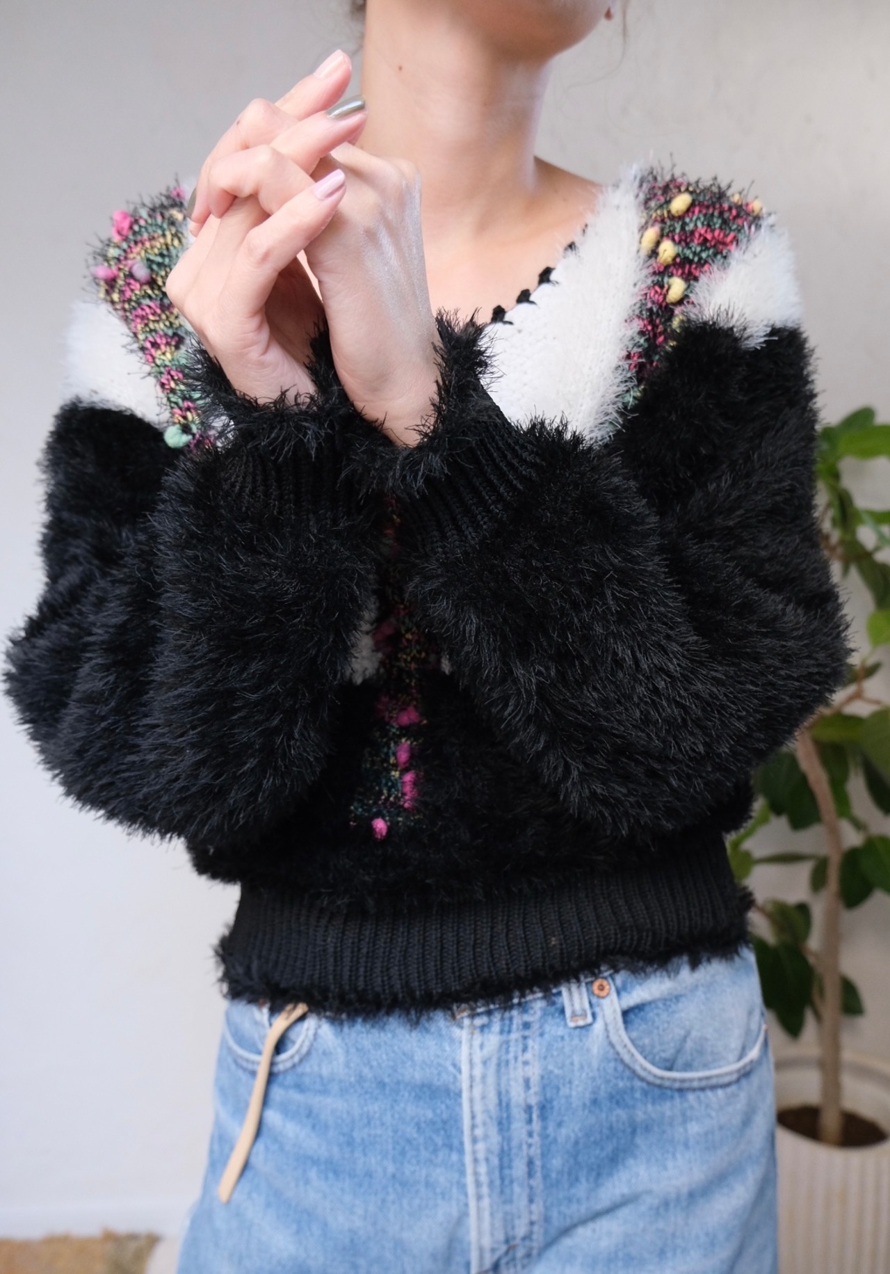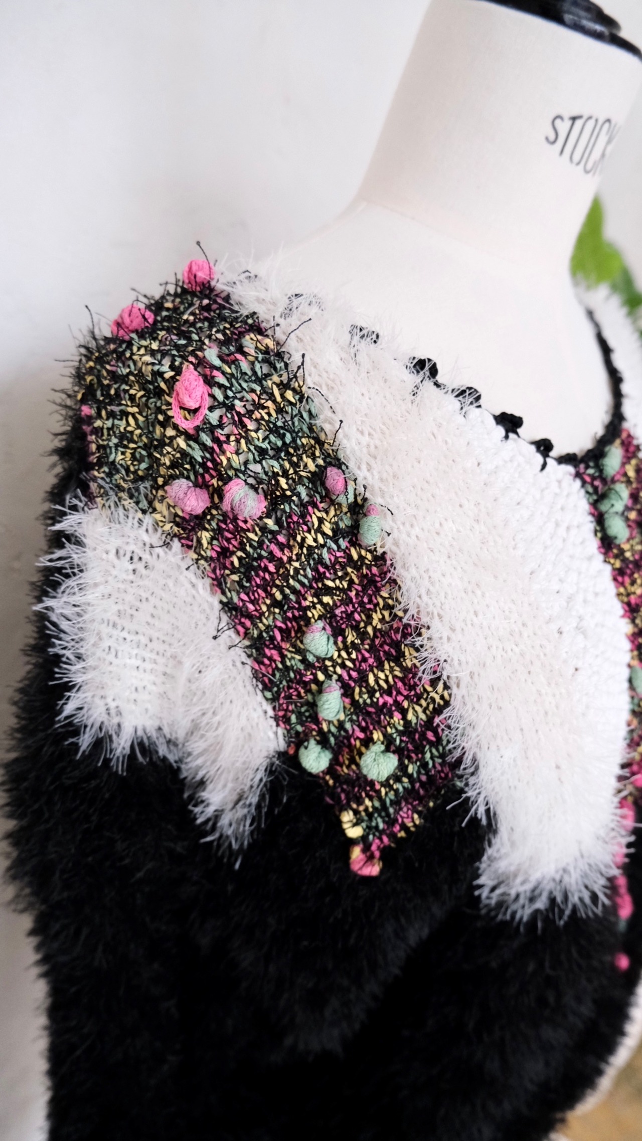 モノトーンベースにカラフルな糸やポンポンの装飾が大人で遊び心があります。