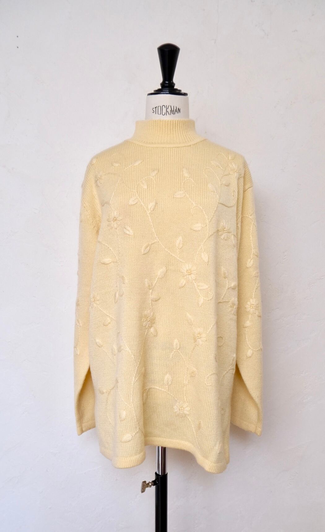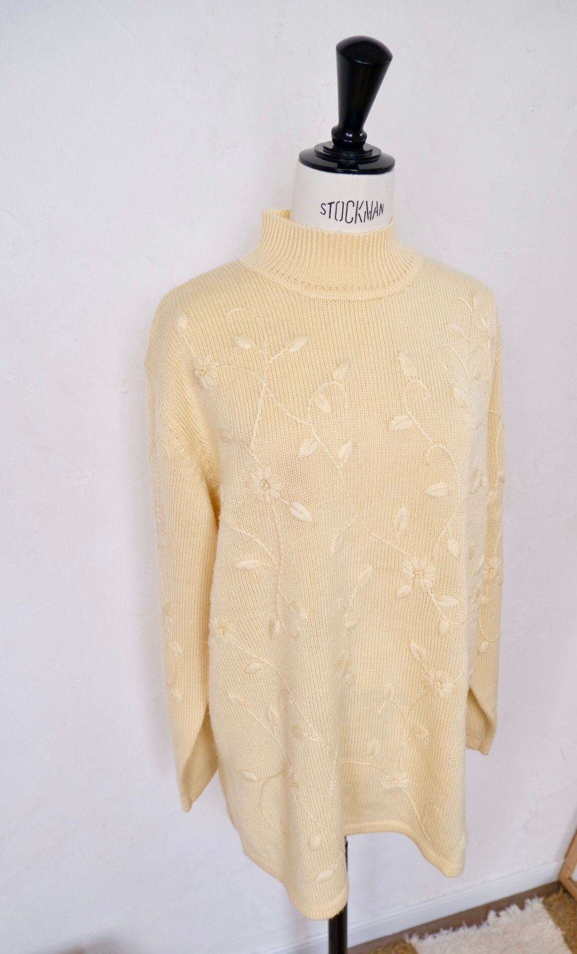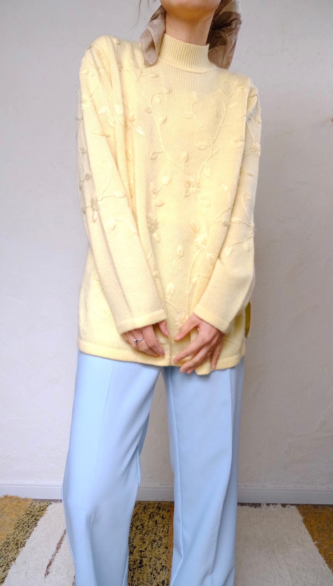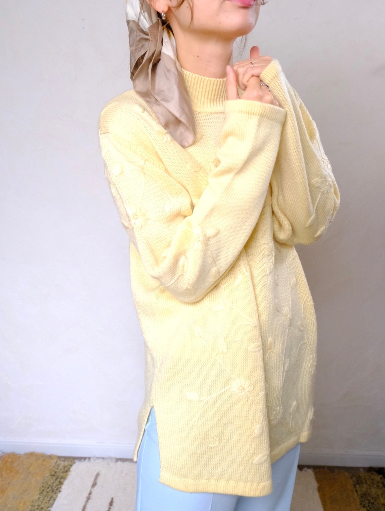 KAREN SCOTTの柔らかいイエローが少し春めいた雰囲気の花刺繍のタートルニット。