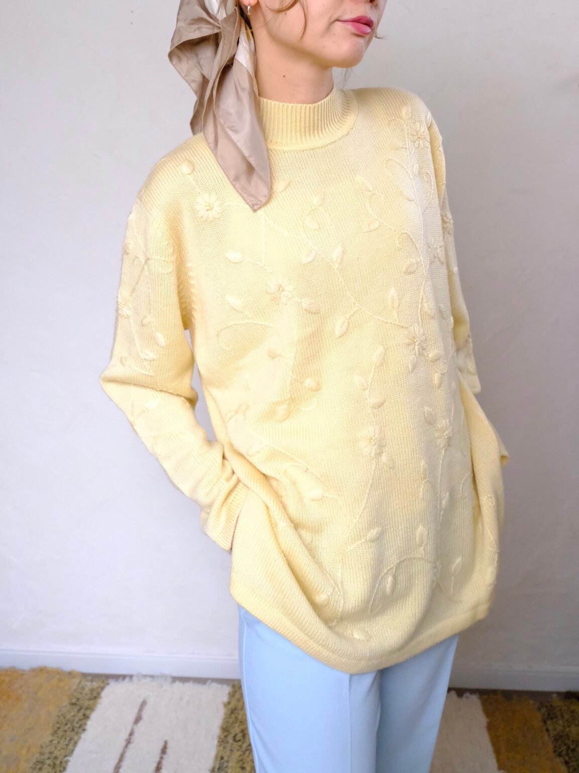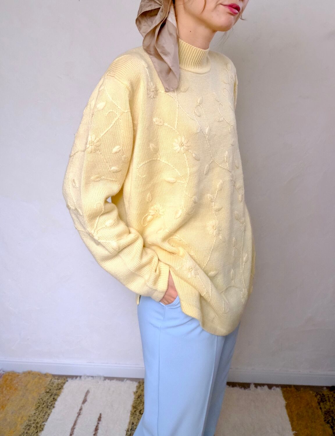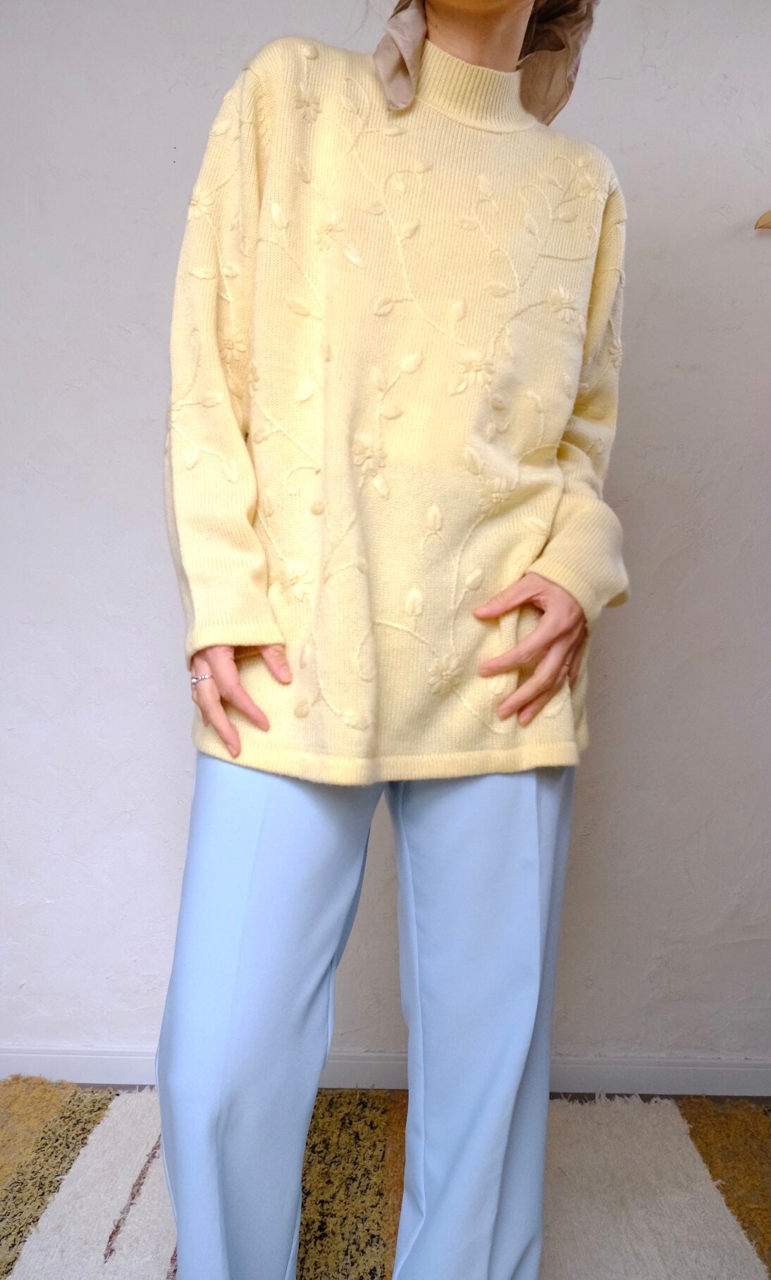 KAREN SCOTTの柔らかいイエローが少し春めいた雰囲気の花刺繍のタートルニット。