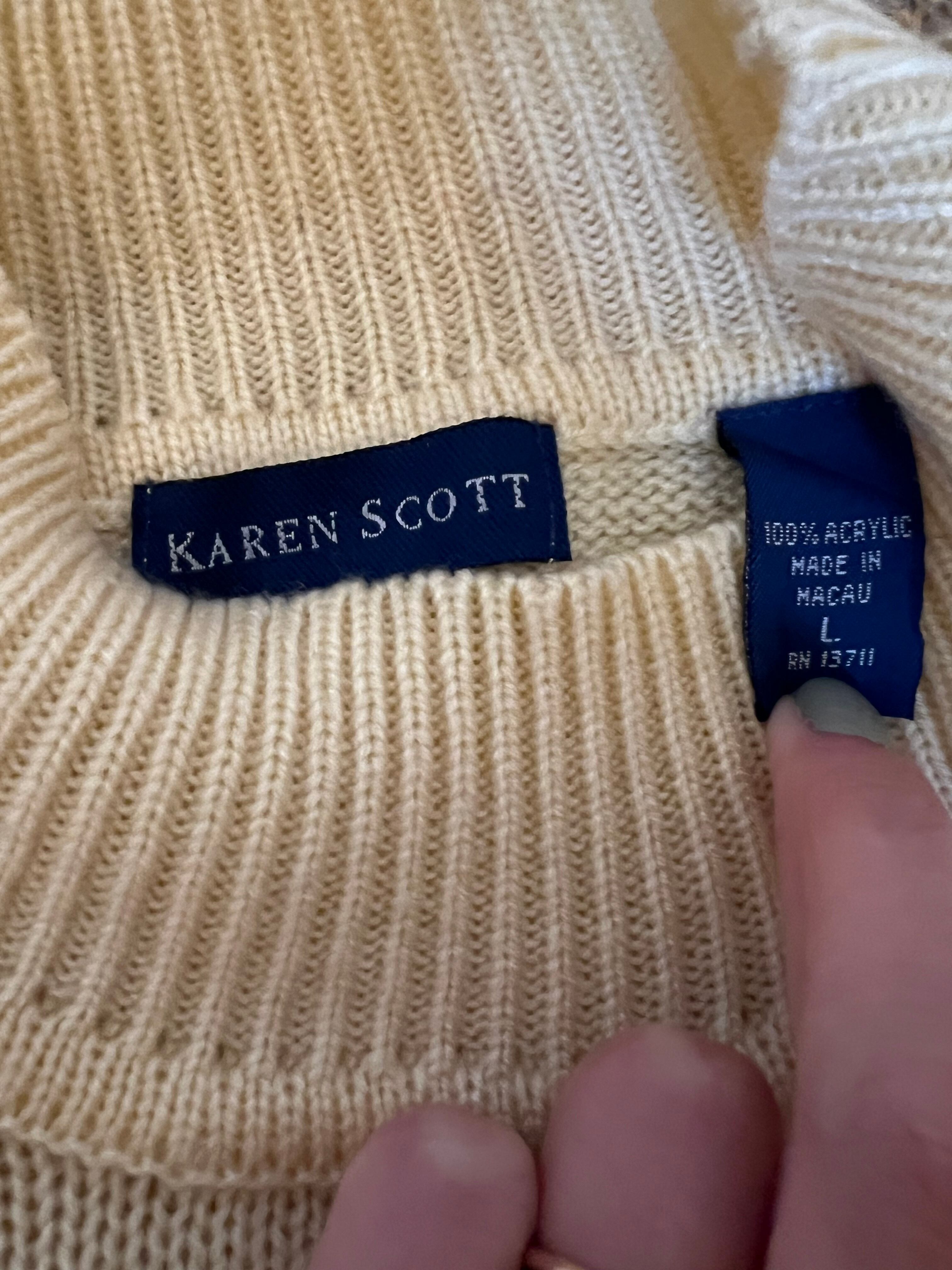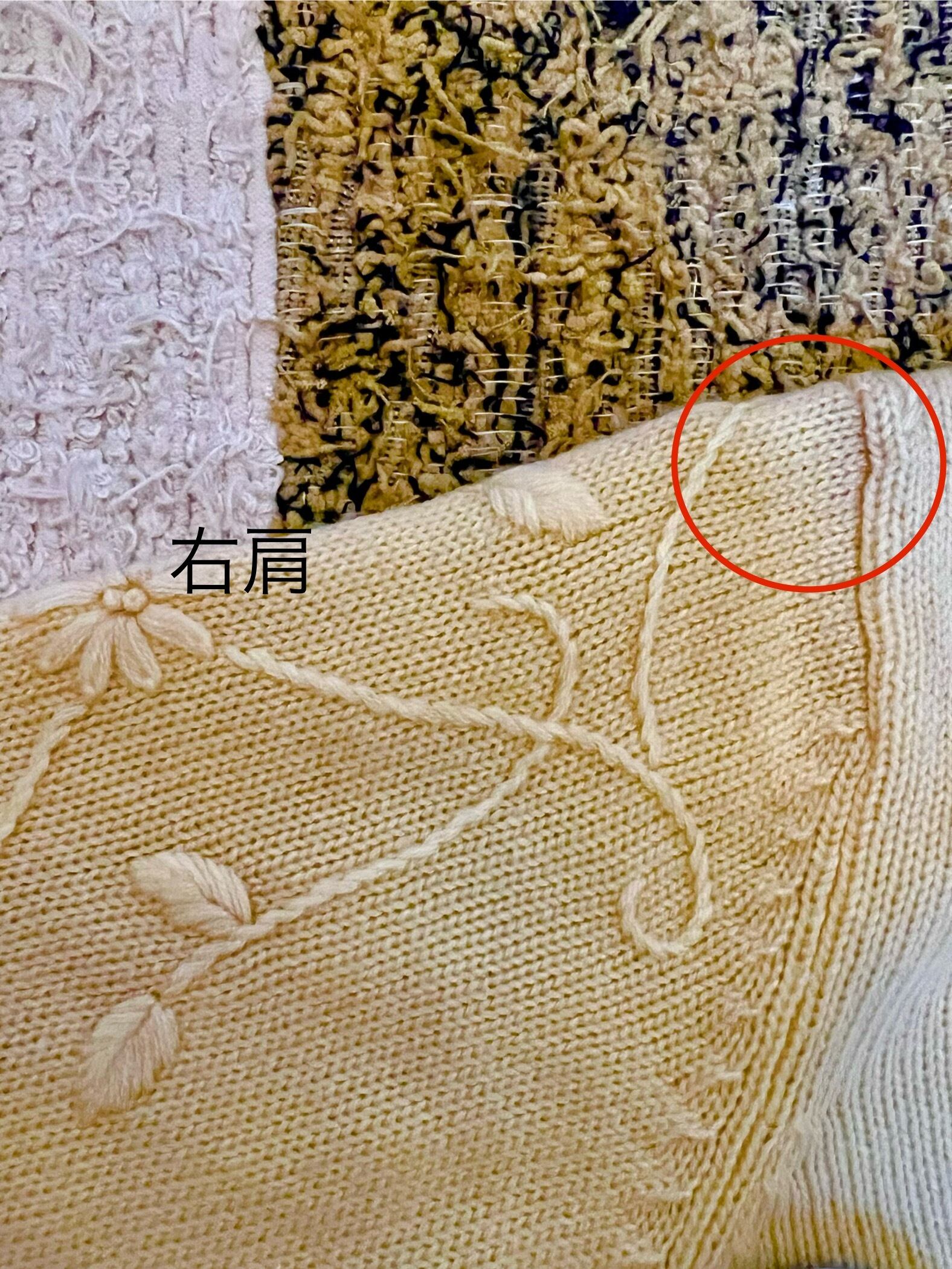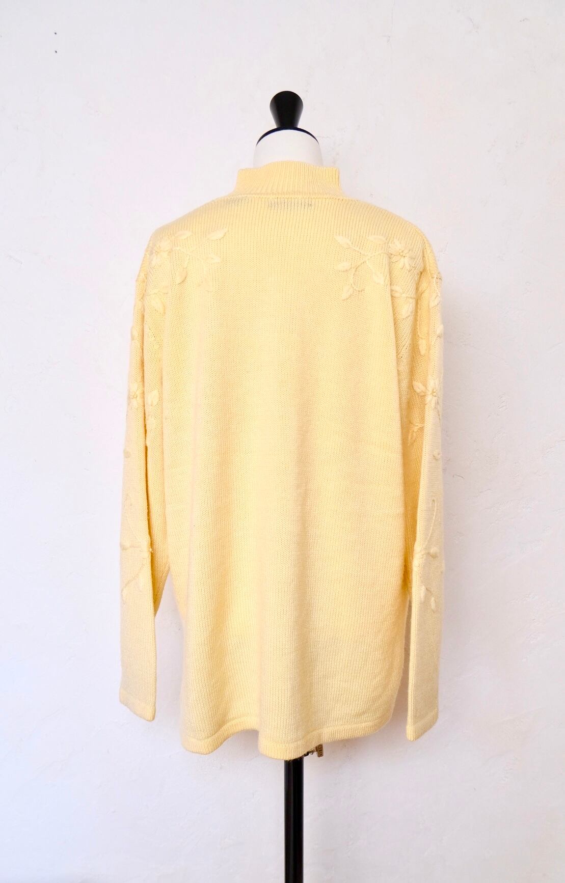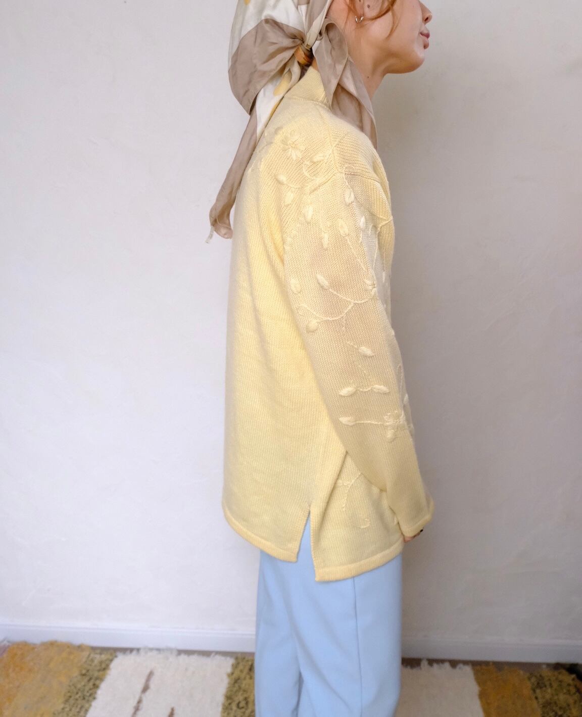 KAREN SCOTTの柔らかいイエローが少し春めいた雰囲気の花刺繍のタートルニット。