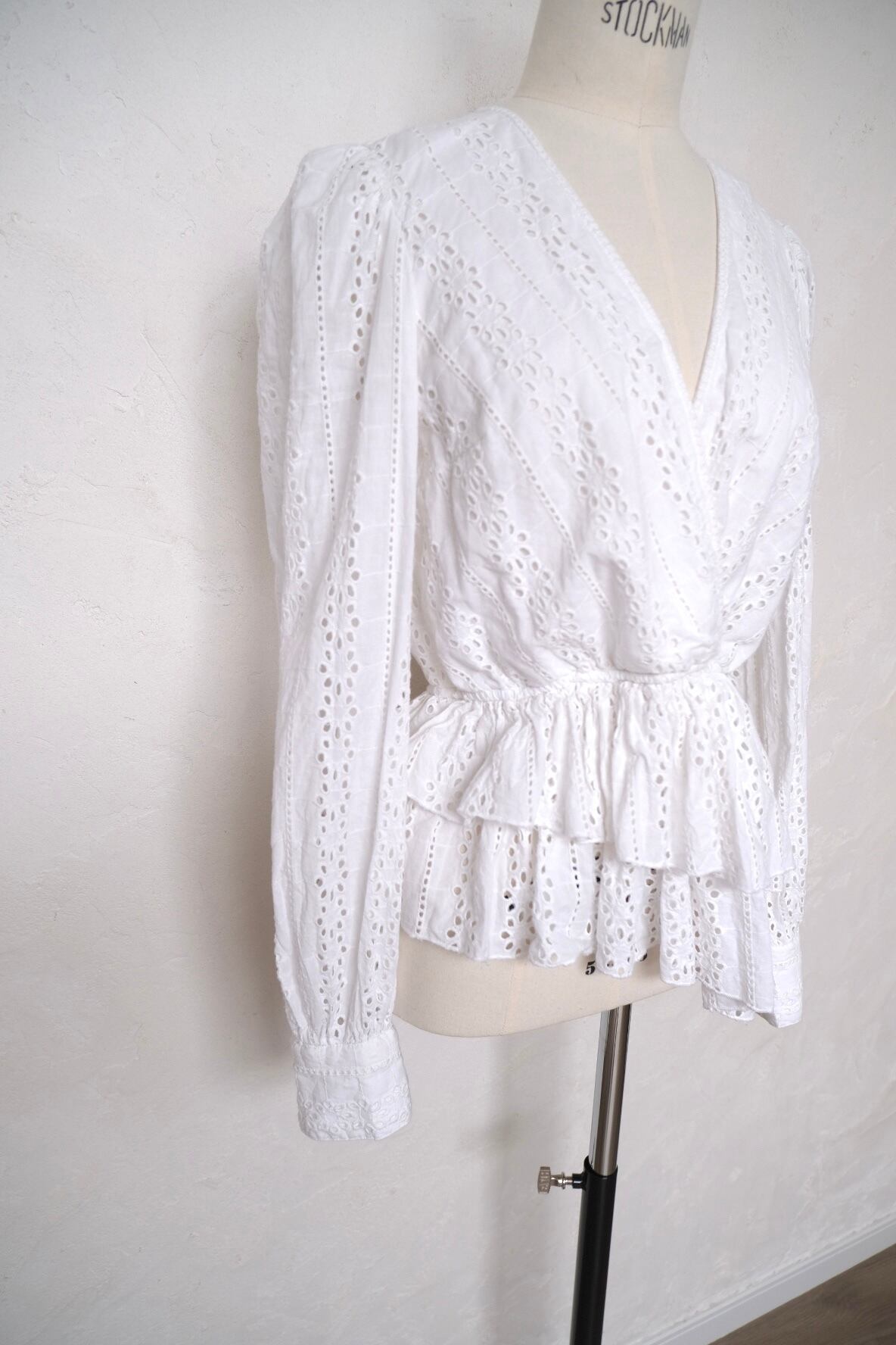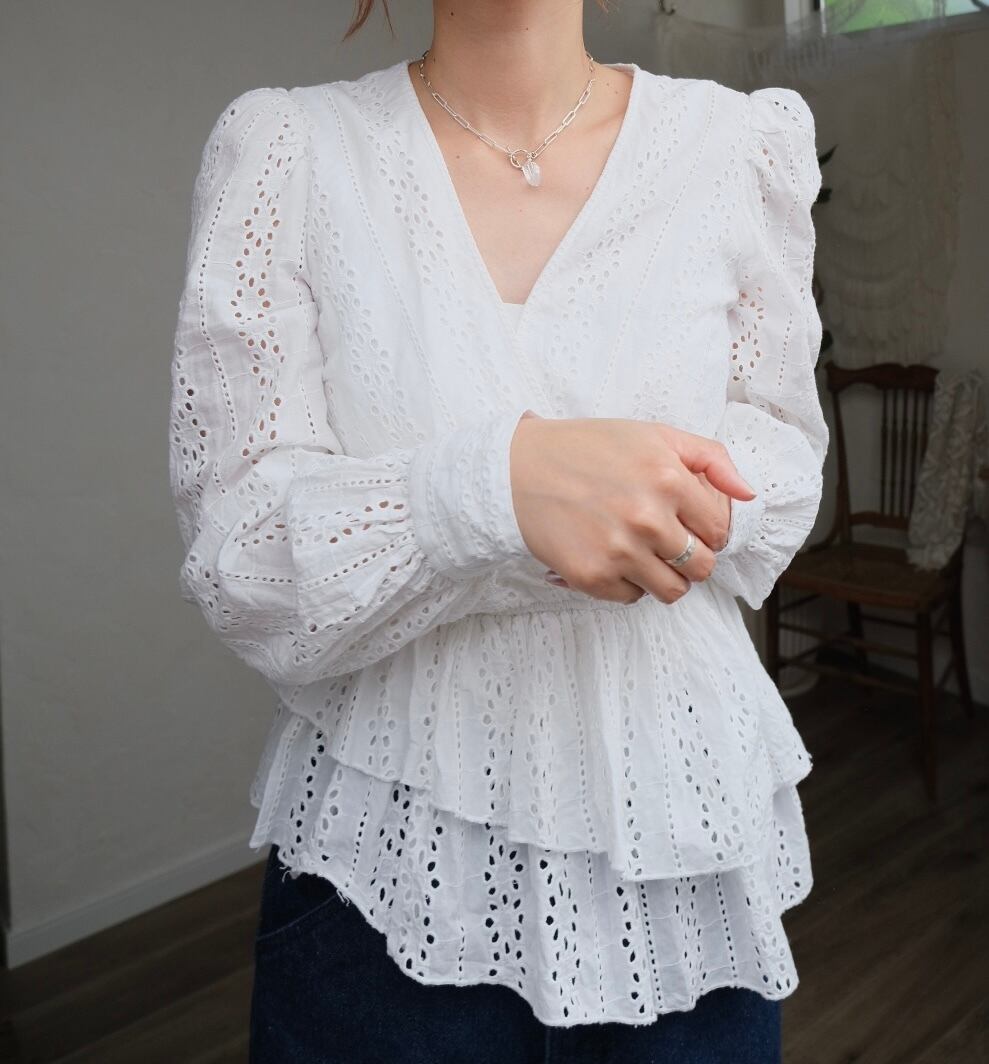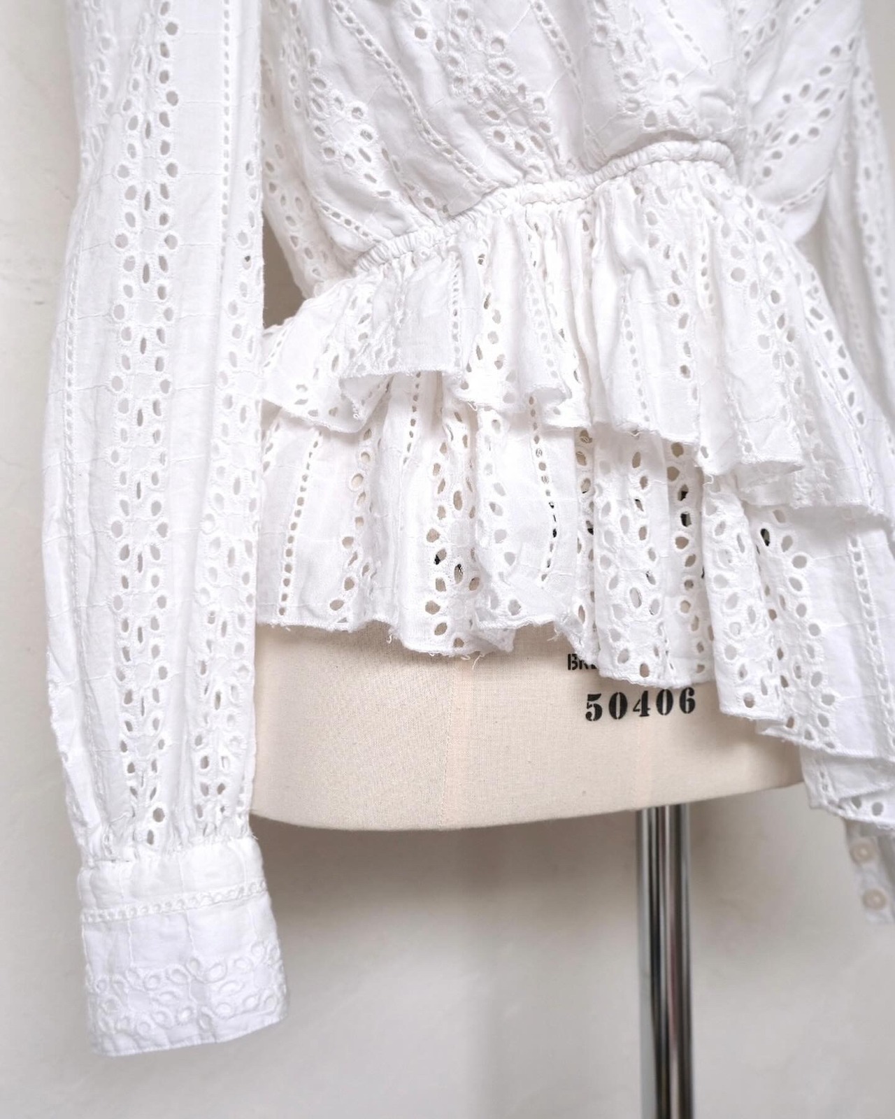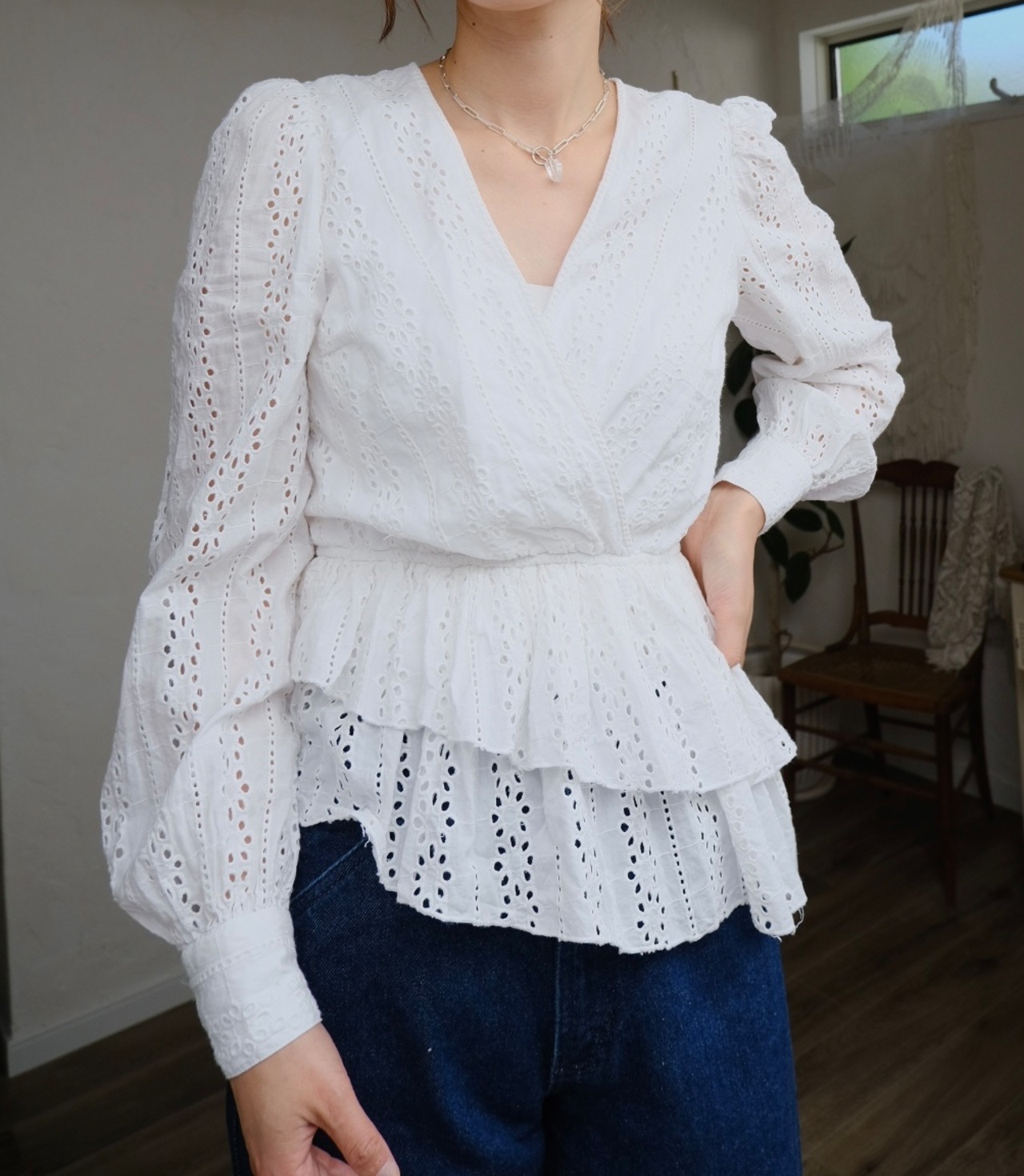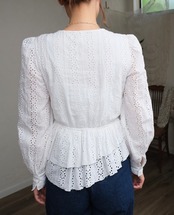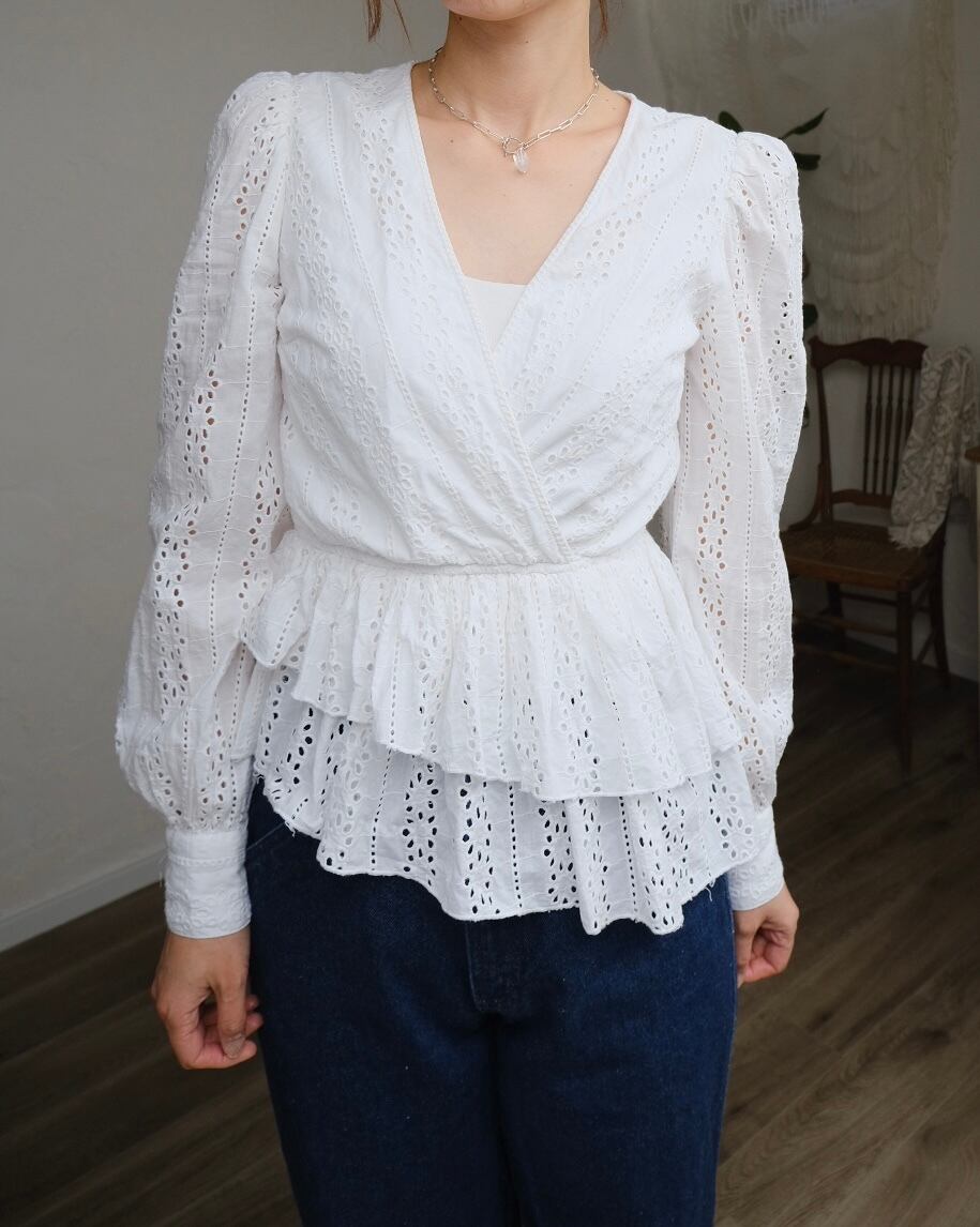 カットワークレースのペプラムの様なデザインのフリルブラウス。