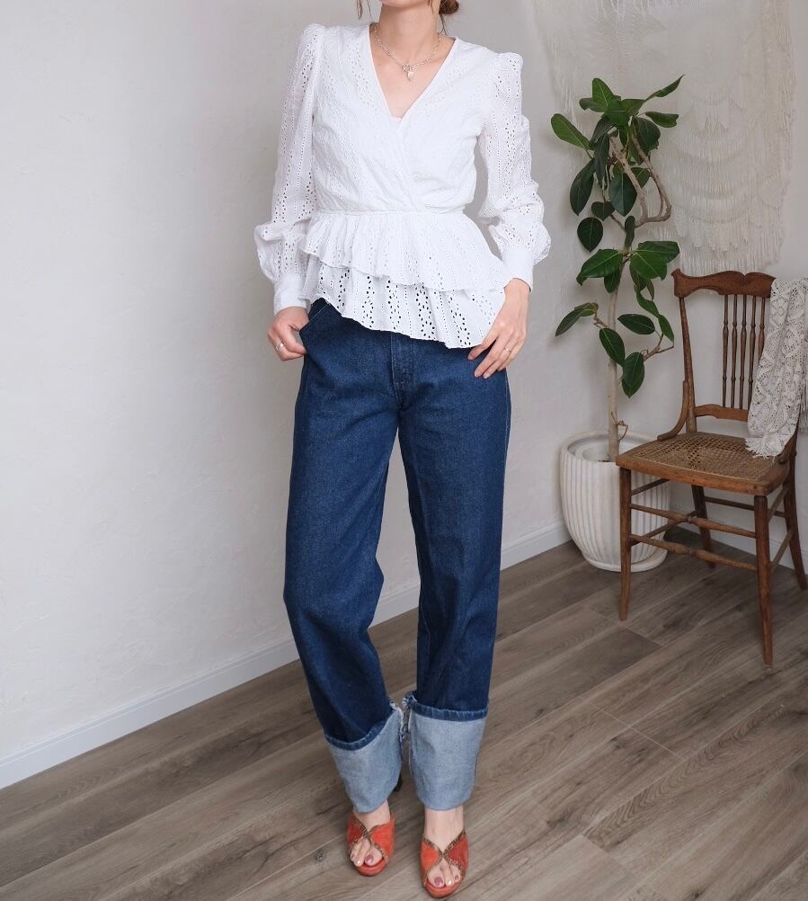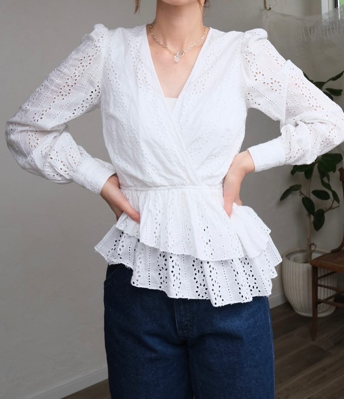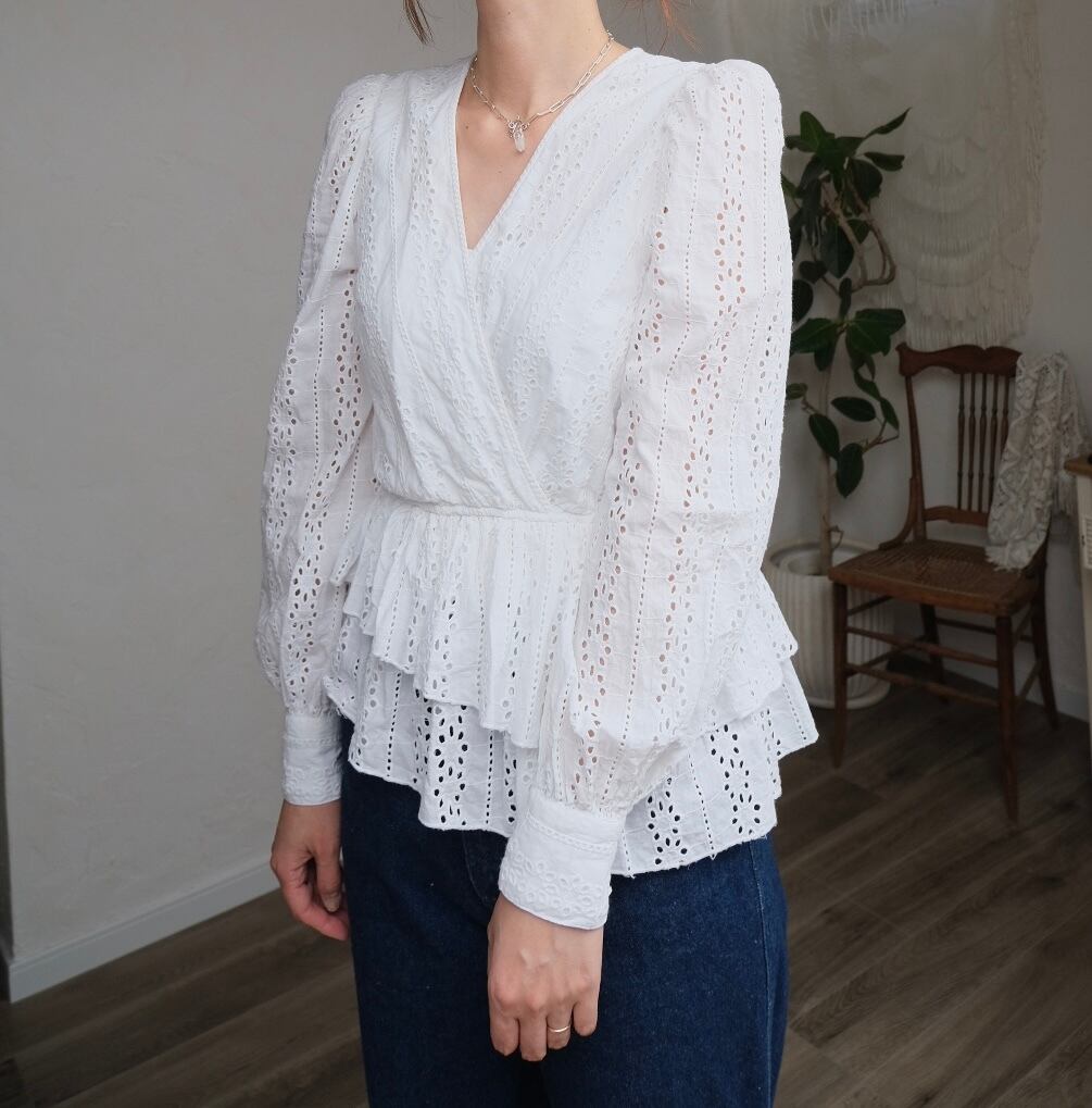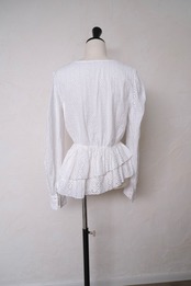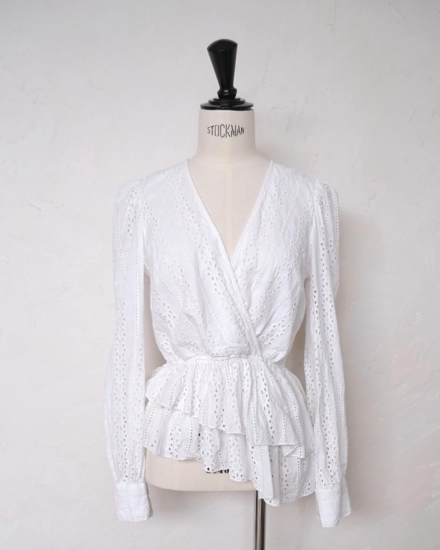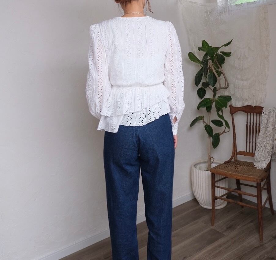 カットワークレースのペプラムの様なデザインのフリルブラウス。
