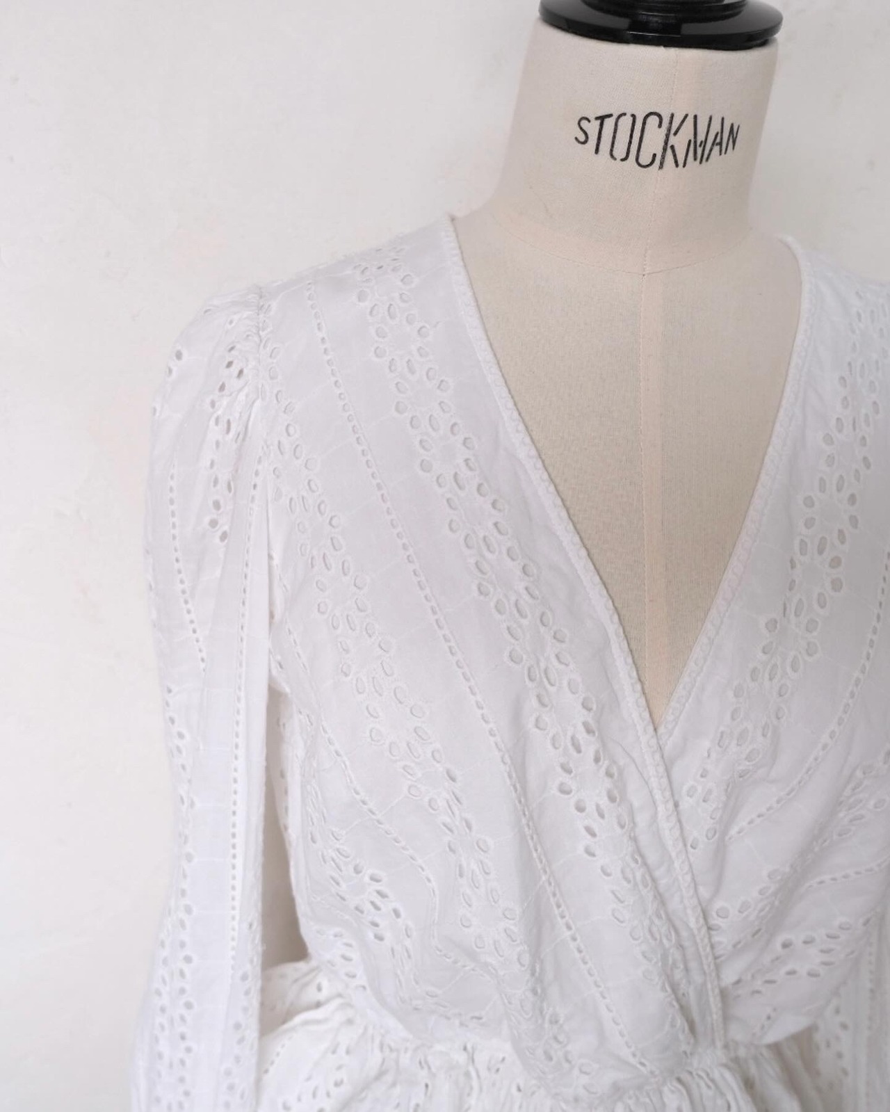 胸元はカシュクール、袖口はシャツの様なボタンタイプなので甘さが引き算され、大人なデザインに。