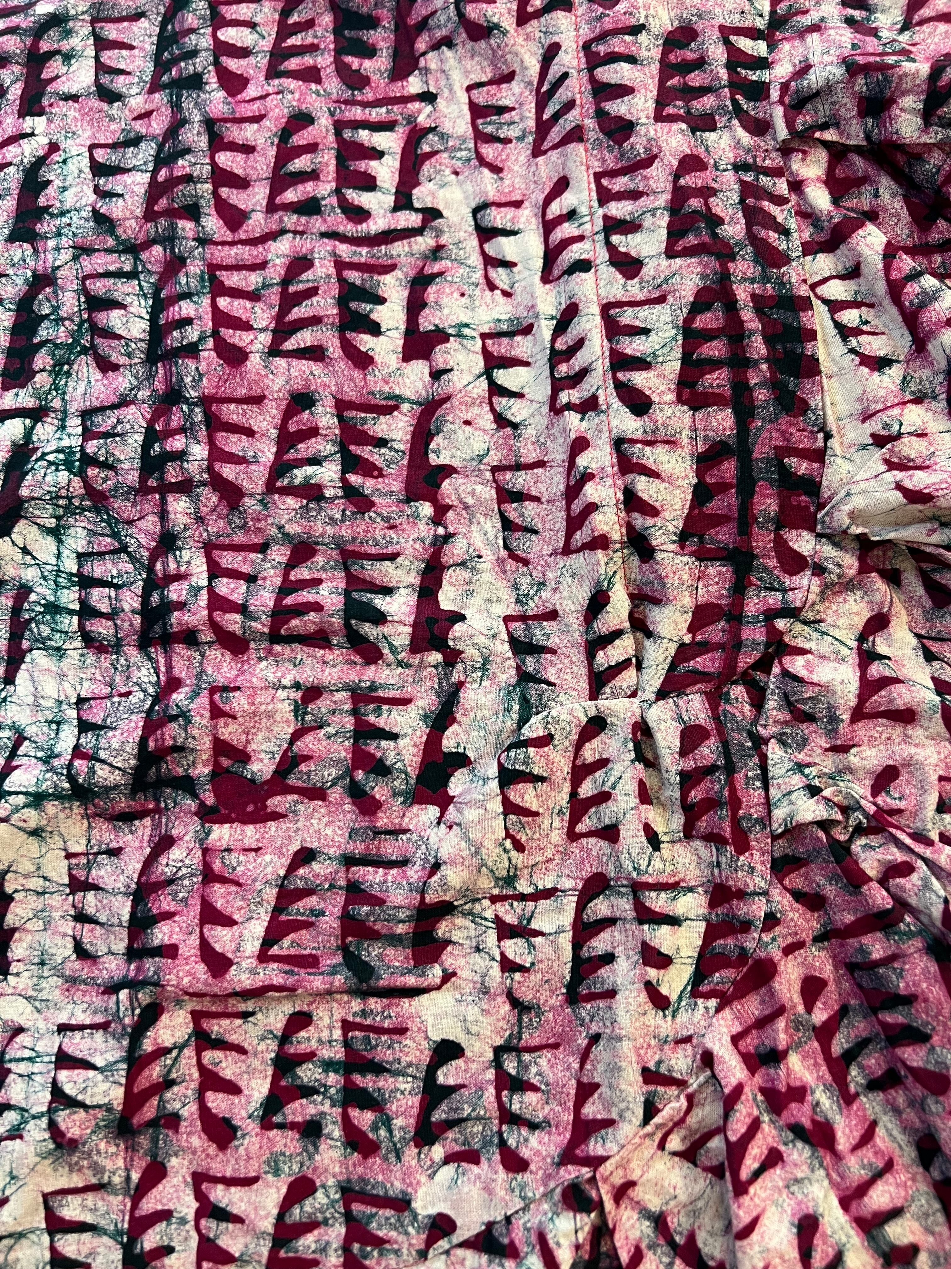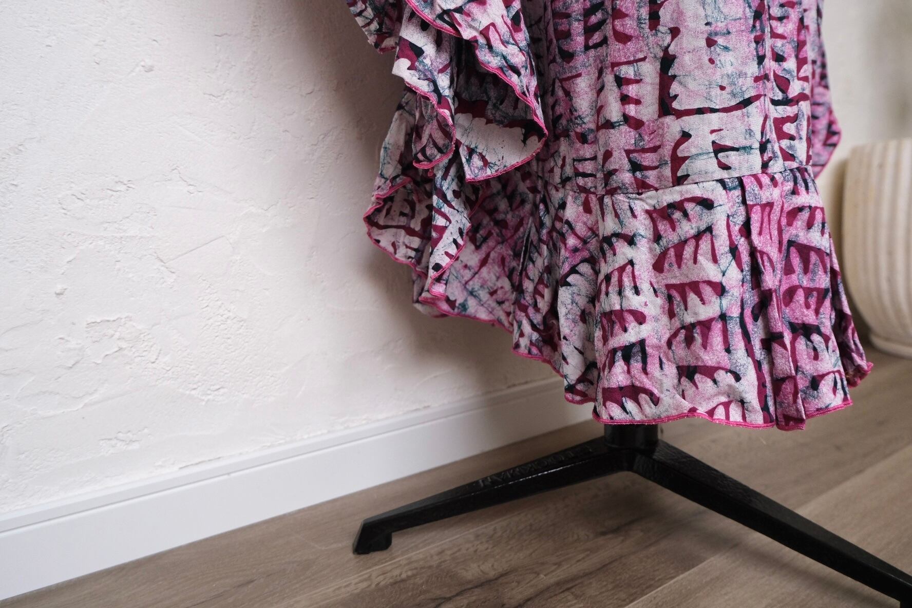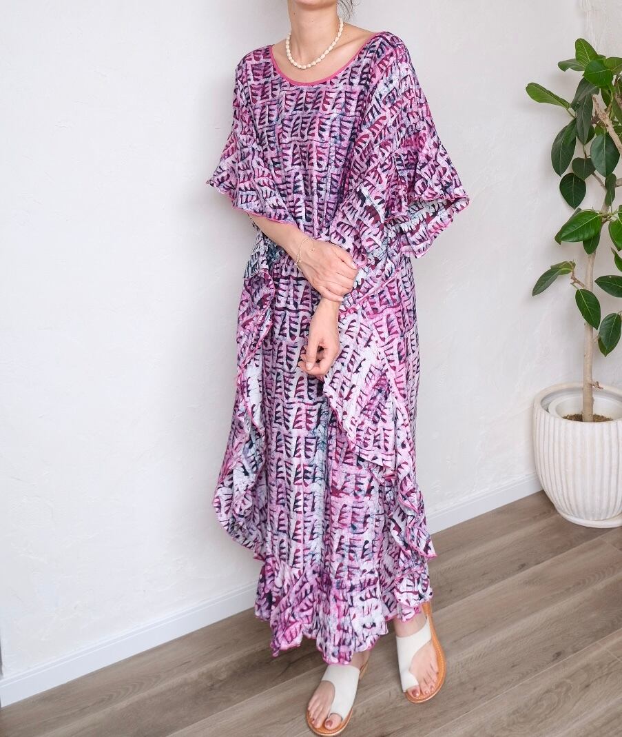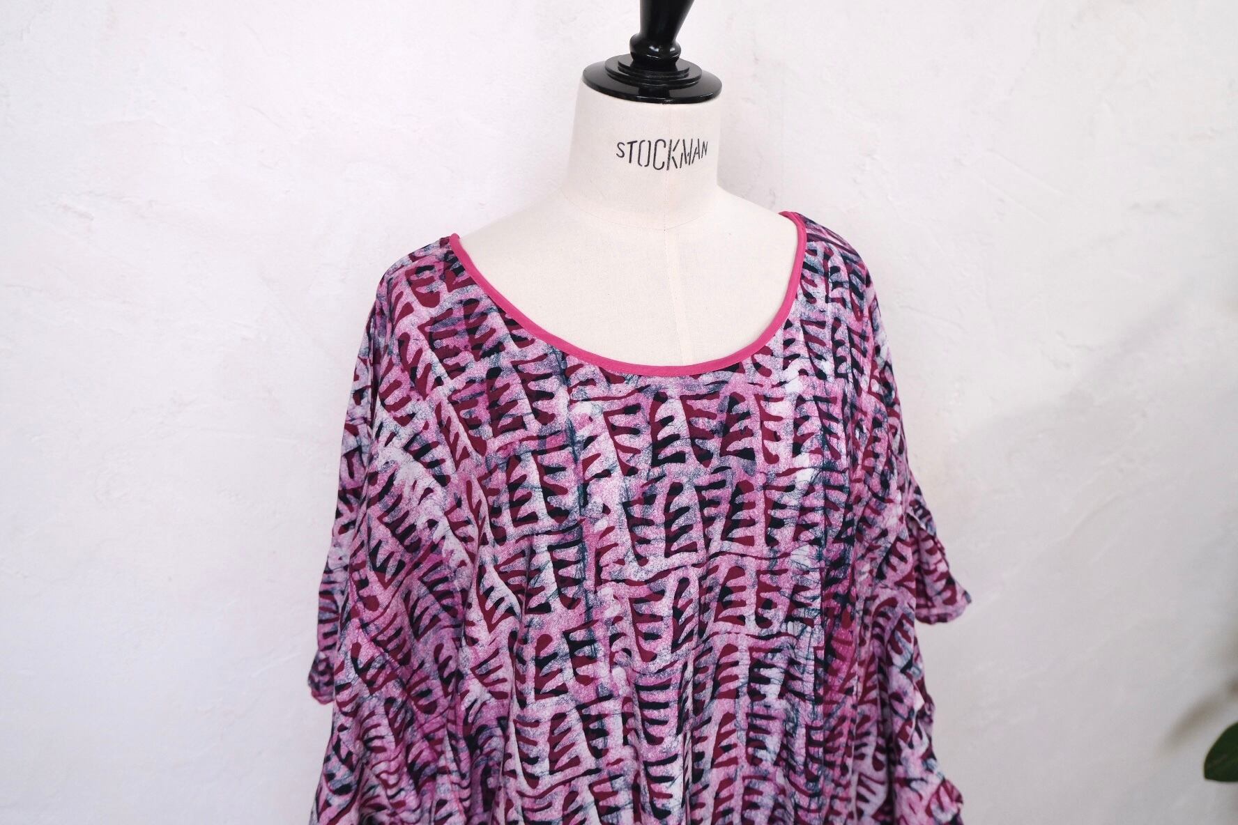 ピンクと紫の間の様な色味ですが柄が大人で甘過ぎず、モード感も感じられるデザイン。