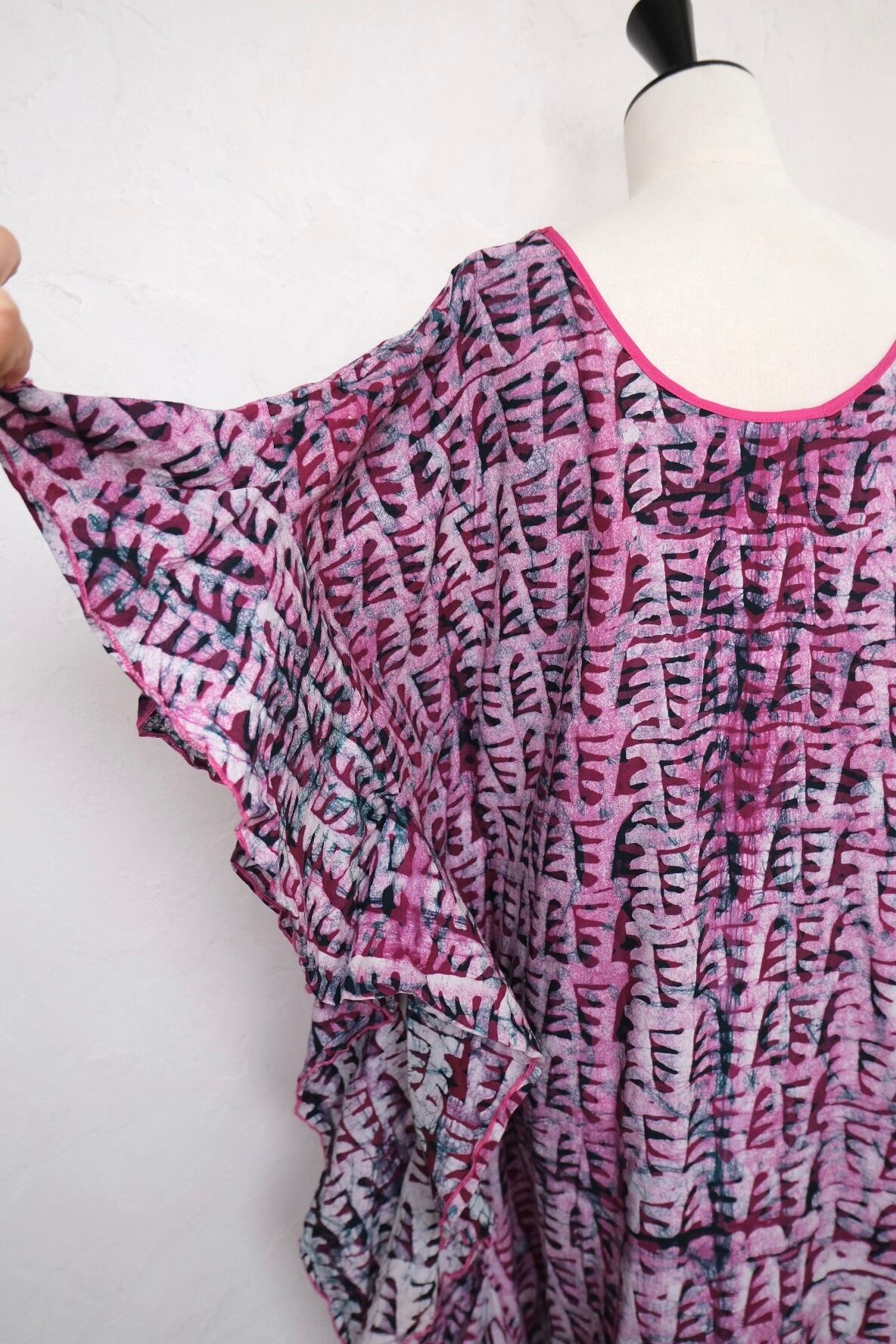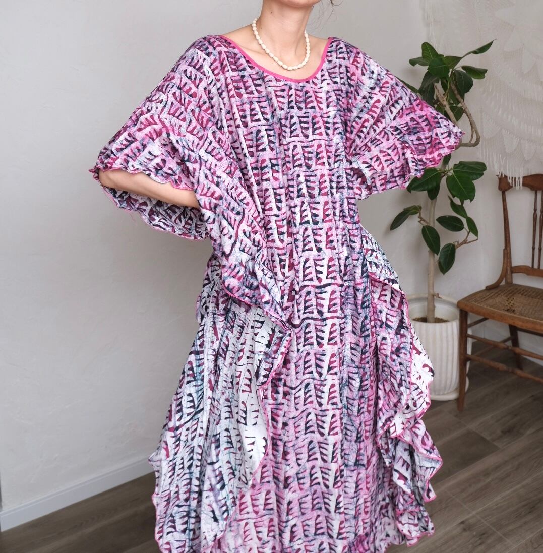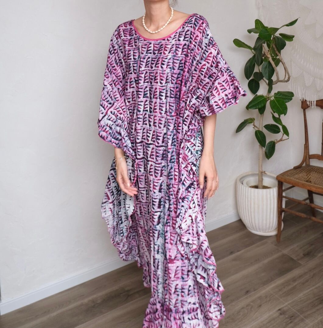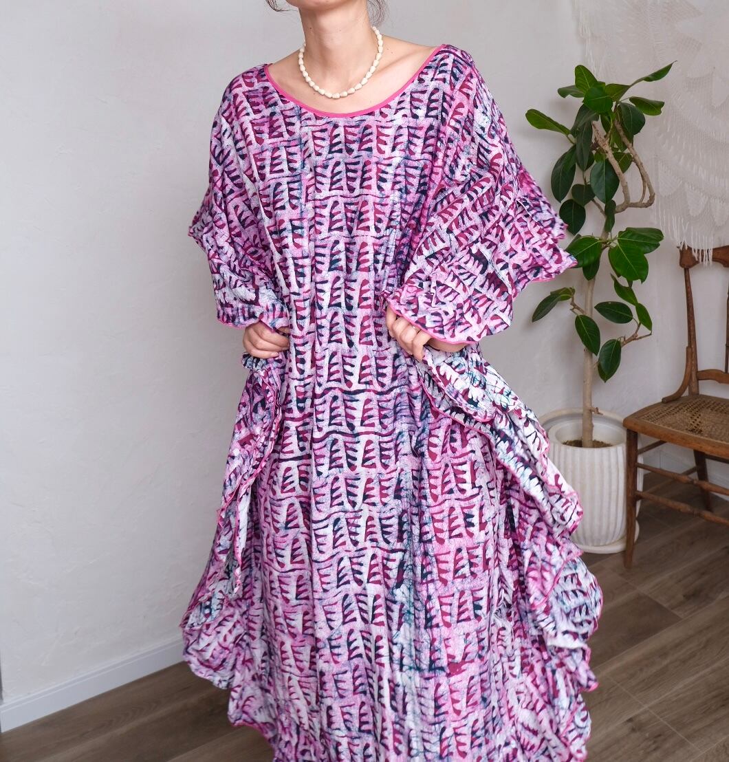 2枚の布を両脇に二本の線で縫っている様なデザインでフリーサイズの様でとっても楽ちんで涼しいです。