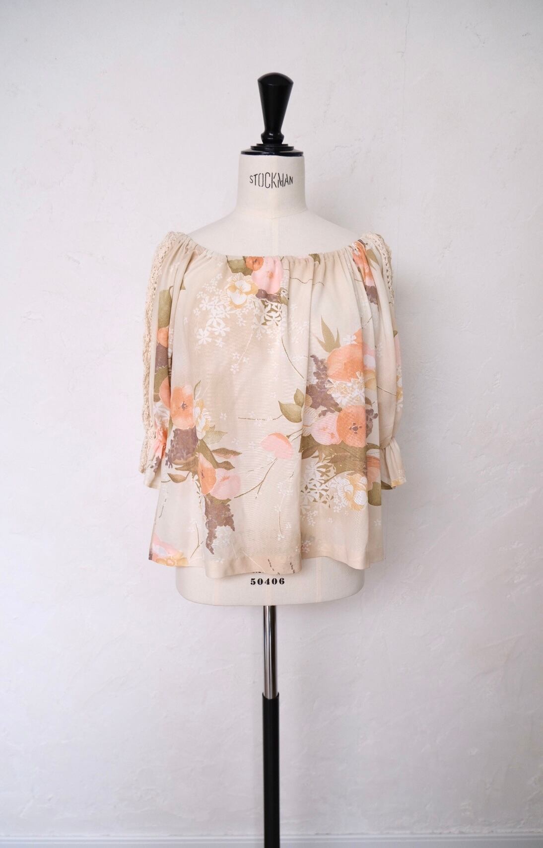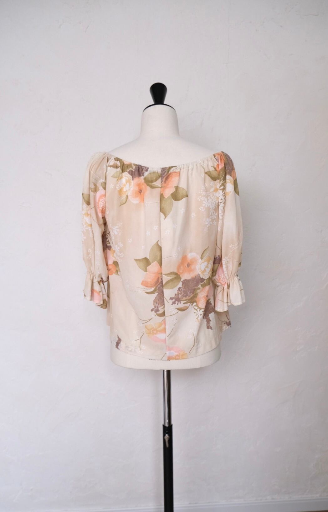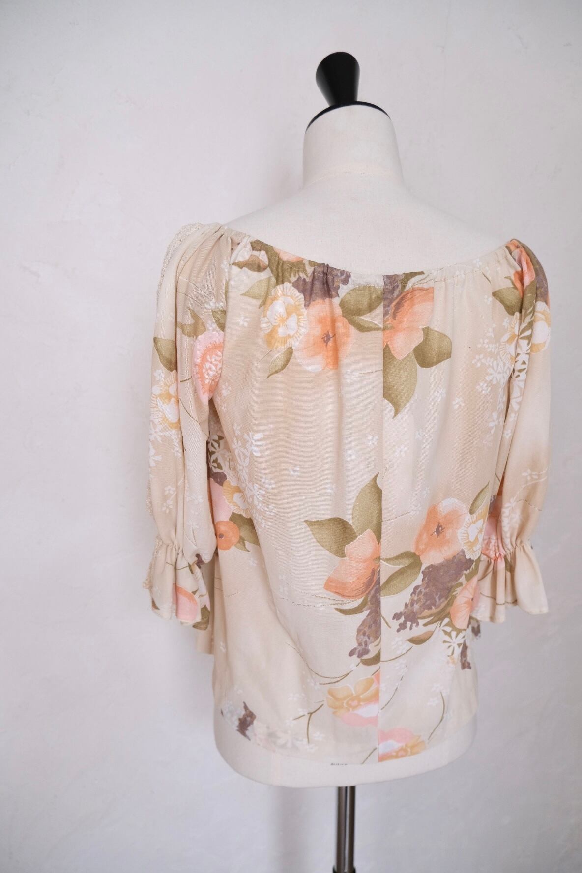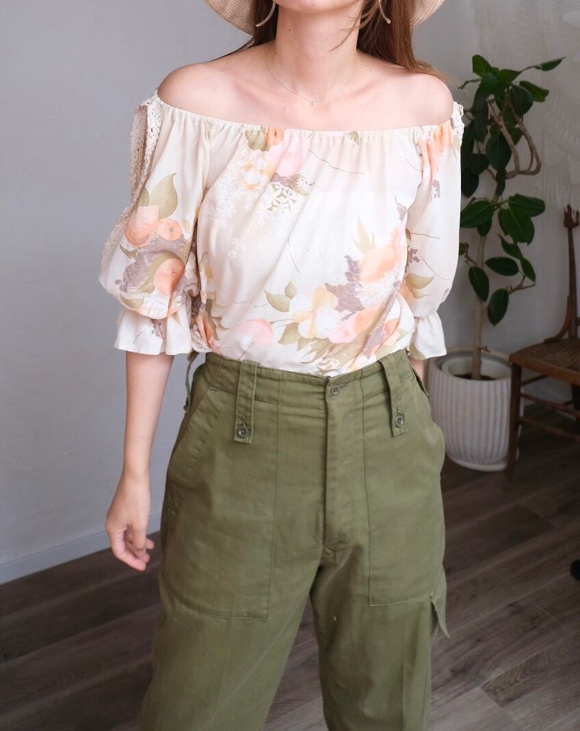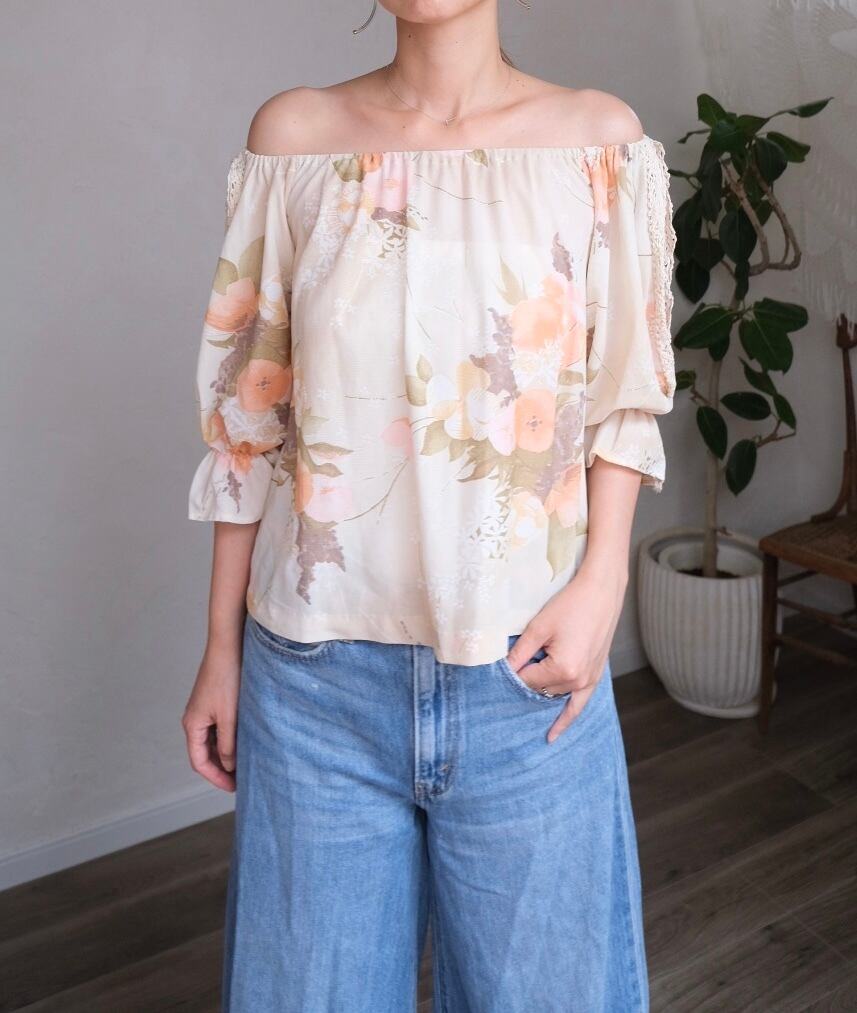 70'sっぽい花柄と肩から袖にかけて空いたデザインが特徴的なブラウス。袖周りのコットンレースもヴィンテージらしさを感じます。