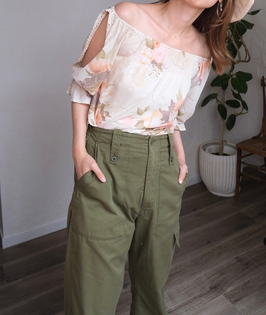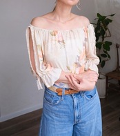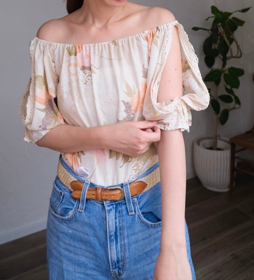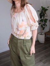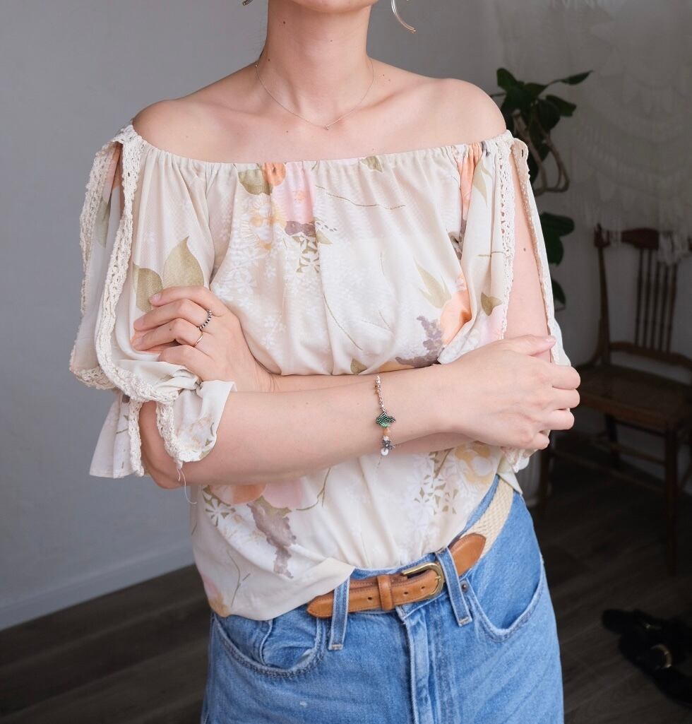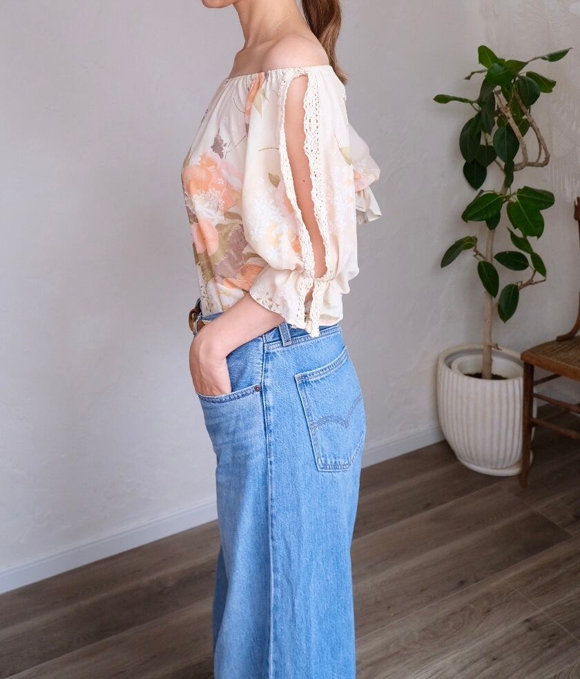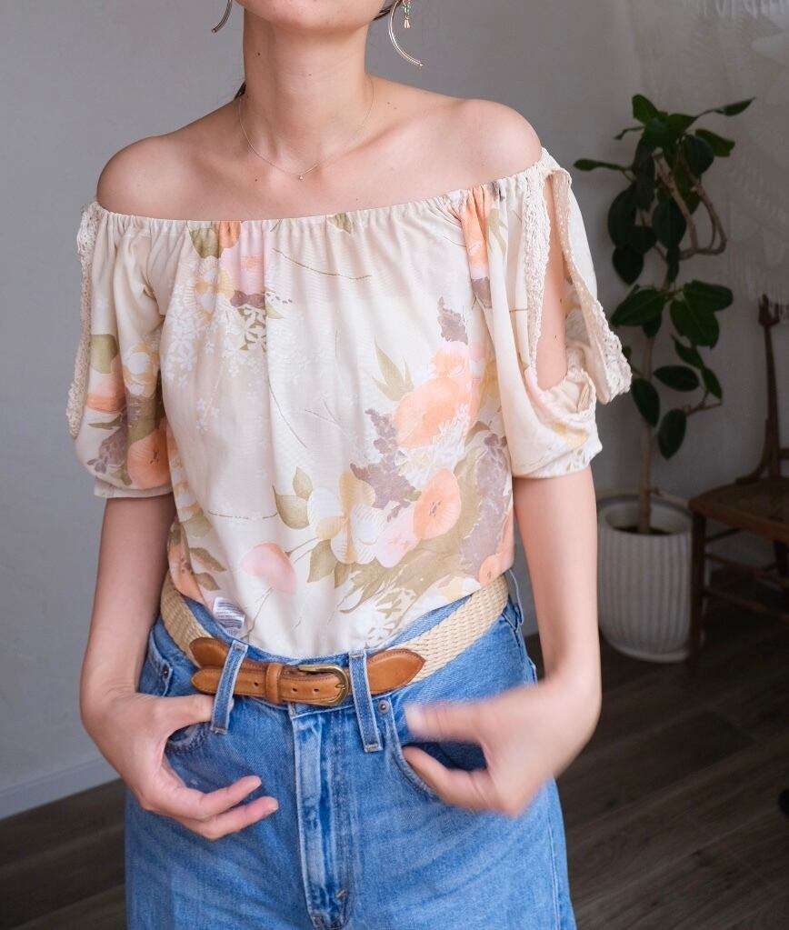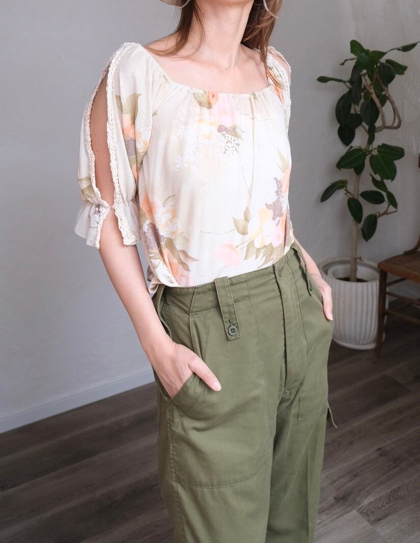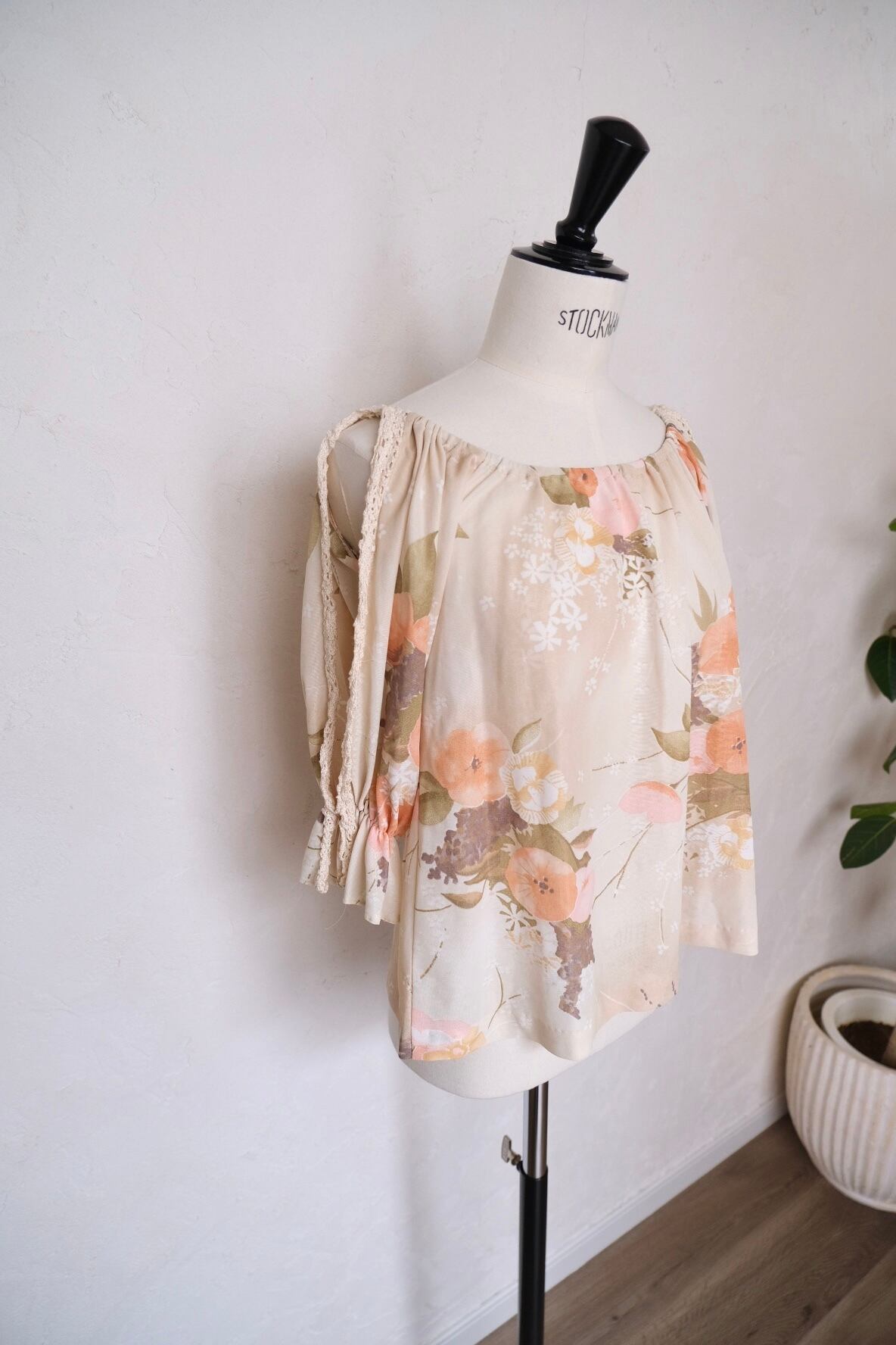 70'sっぽい花柄と肩から袖にかけて空いたデザインが特徴的なブラウス。袖周りのコットンレースもヴィンテージらしさを感じます。