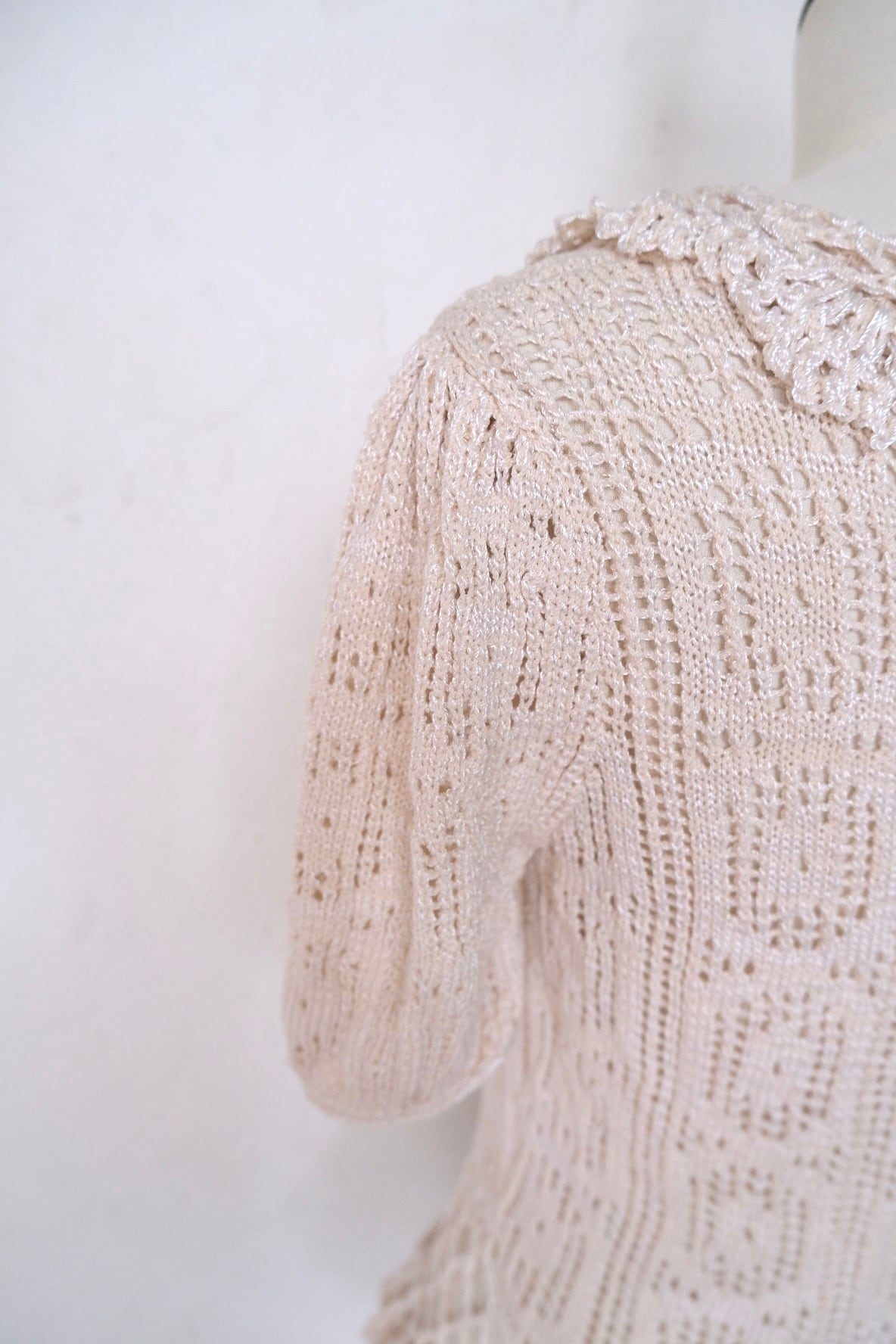 ボディも単一的ではなく模様が入った編み方で、襟もちゃんと付いたデザイン性の高い一枚。