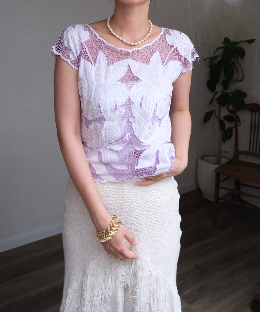 ホワイトにパープルのレースが素敵なフラワーモチーフトップス。
