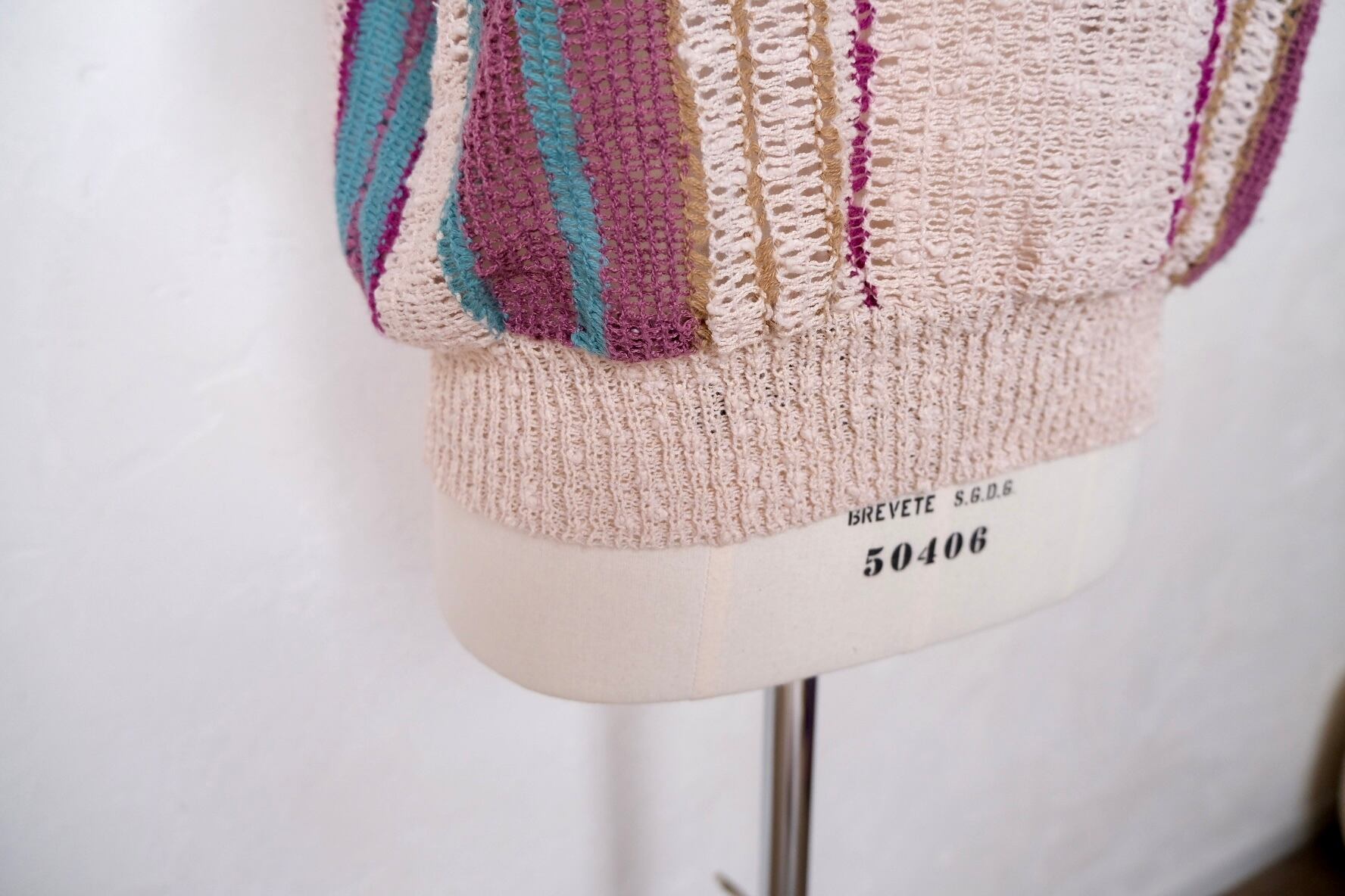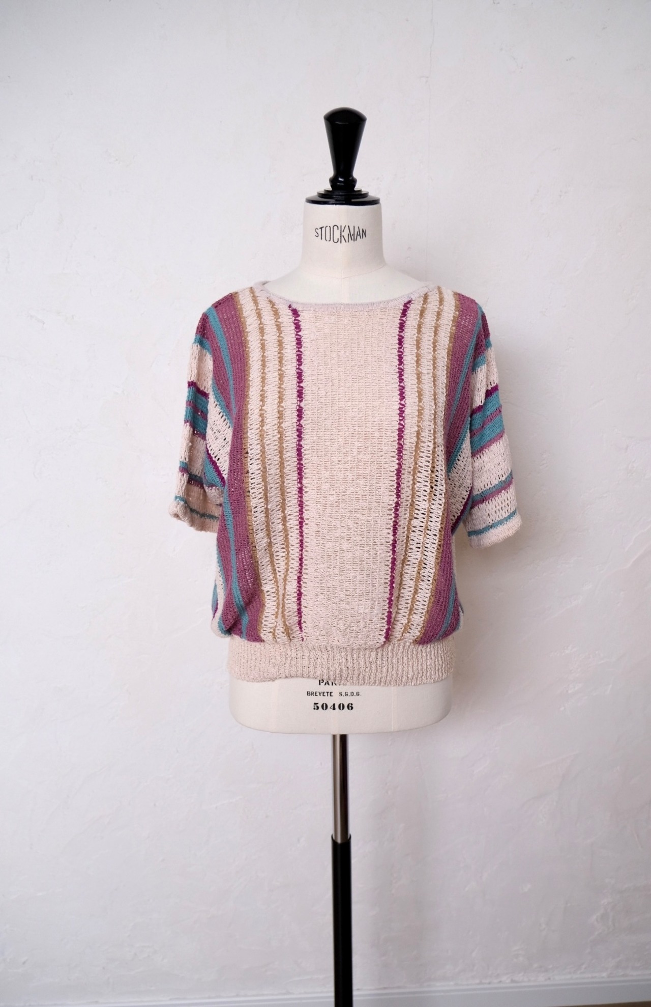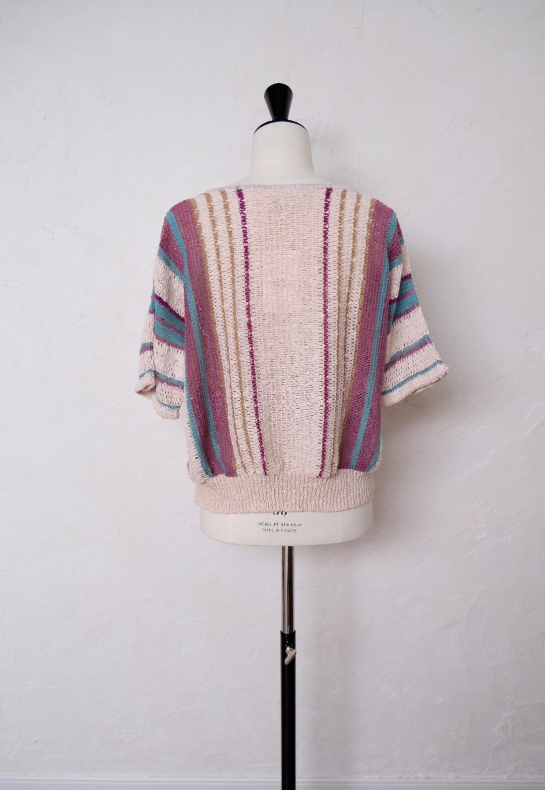 パープル、ブルー、ベージュの縞が入ったデザインのニット。