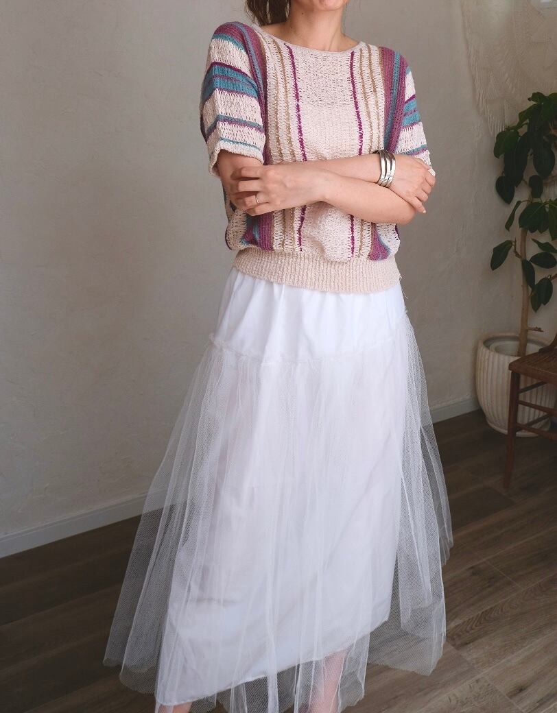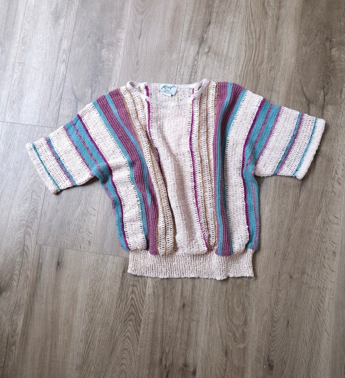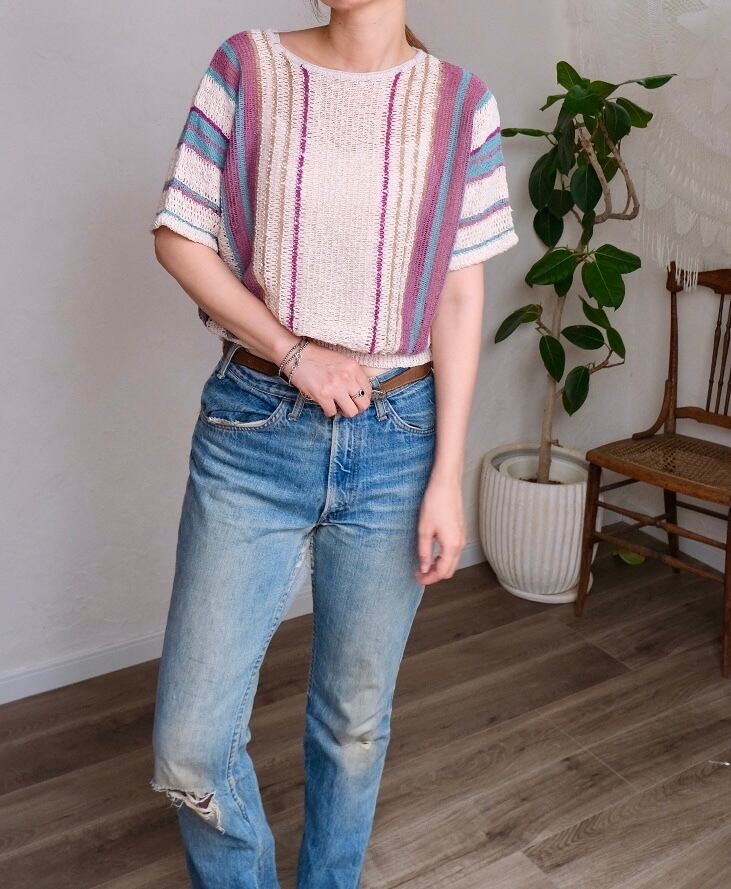 パープル、ブルー、ベージュの縞が入ったデザインのニット。