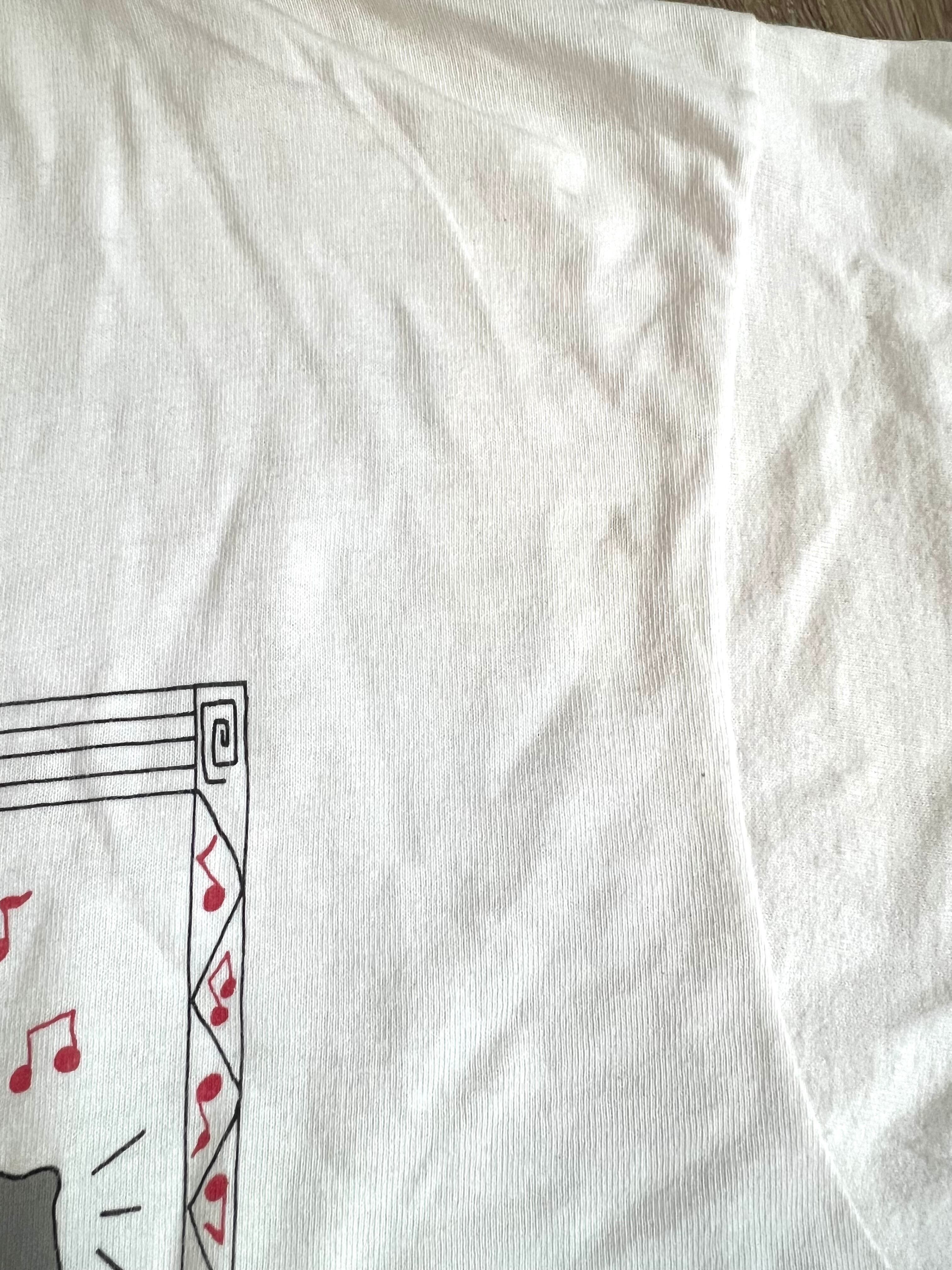 特筆するダメージとしては左脇あたりに薄いグレーのシミ、フロントに紫の汚れ、左裾に薄い茶色のシミがございます。