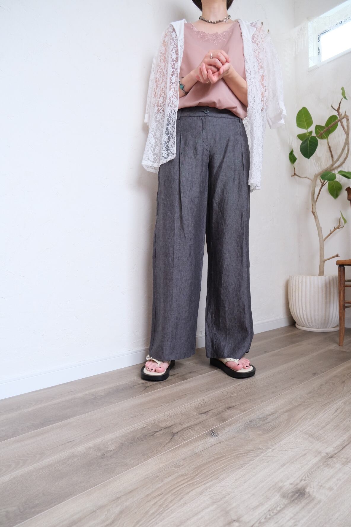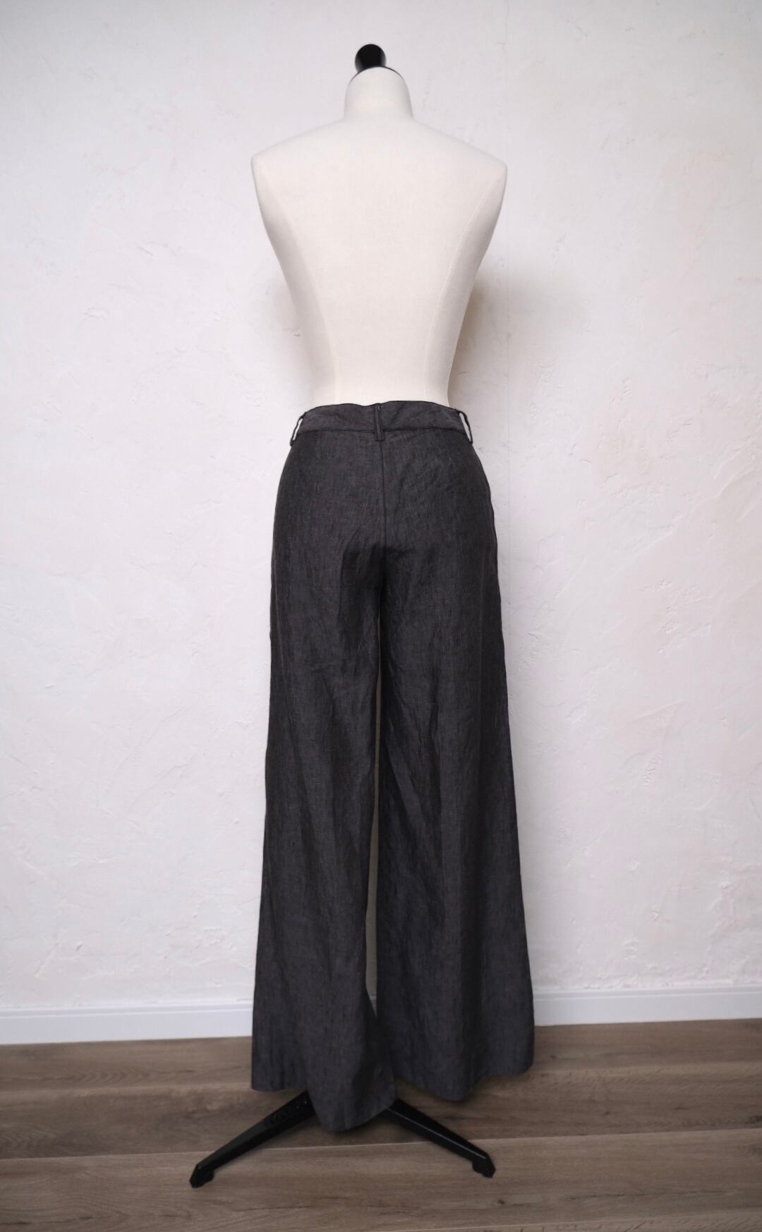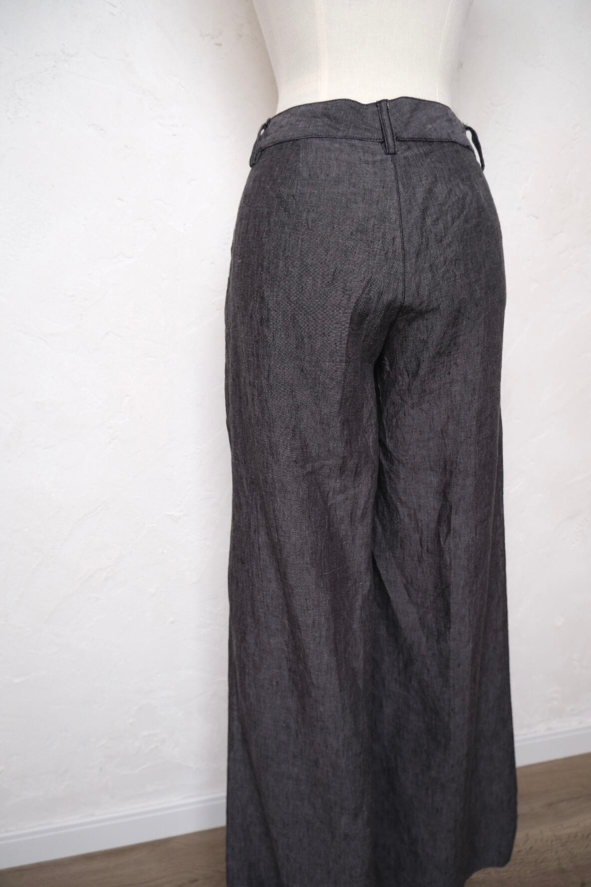 ブラックデニムの様な雰囲気のあるリネンフレアパンツ。
