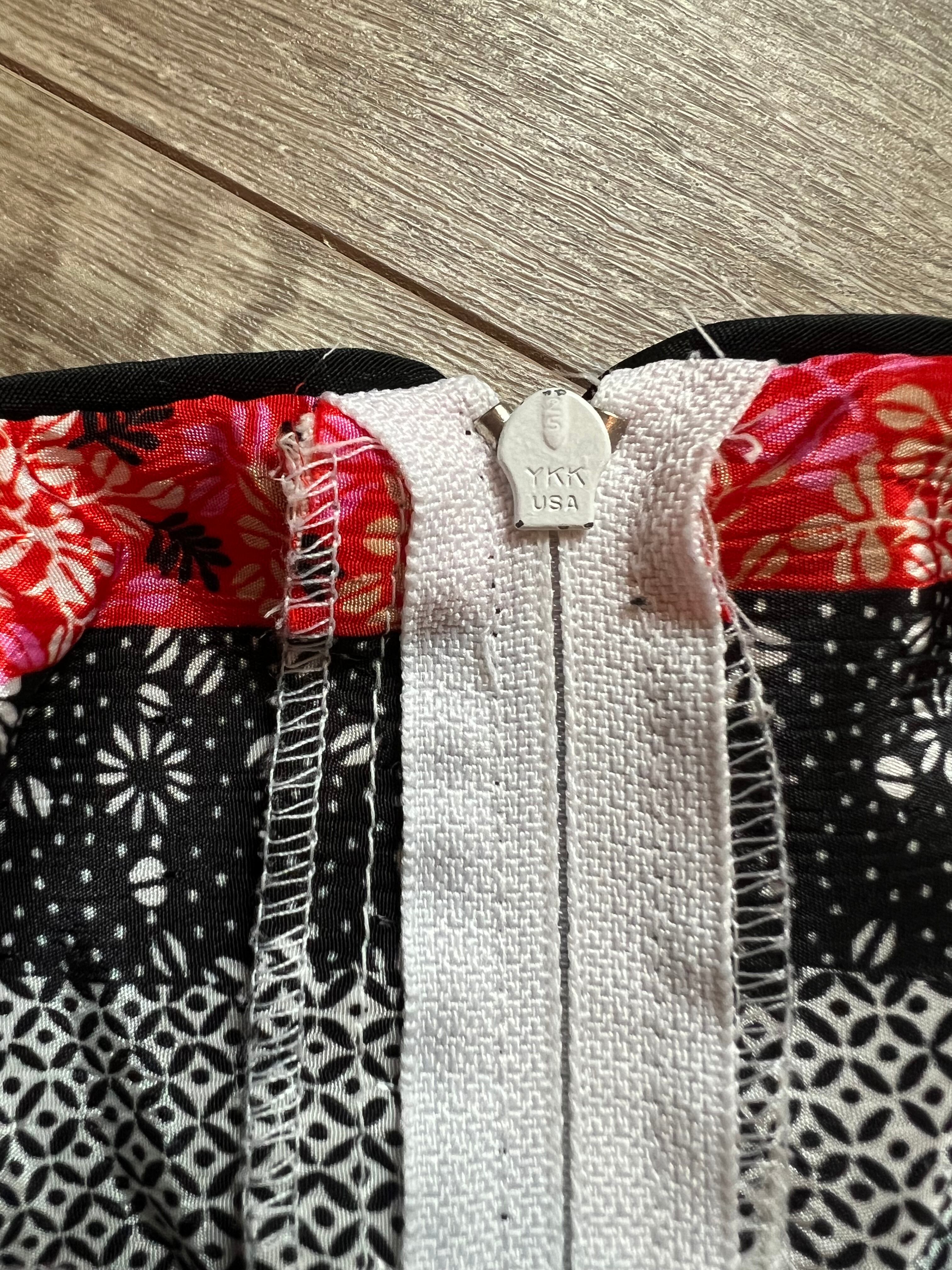 ベロアのブラックのパイピングテープやレッドとブラックのカラー使いで秋らしい雰囲気。
